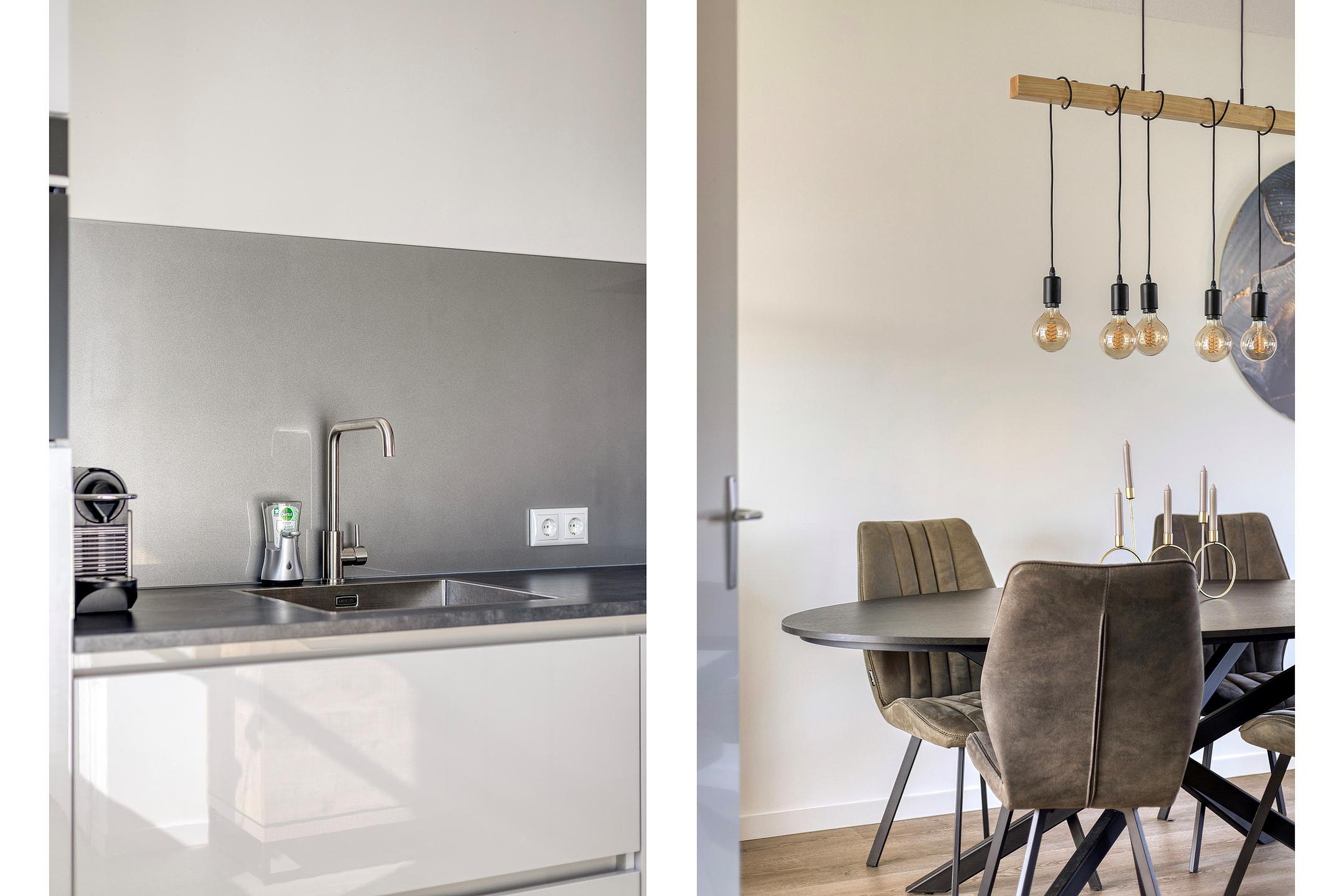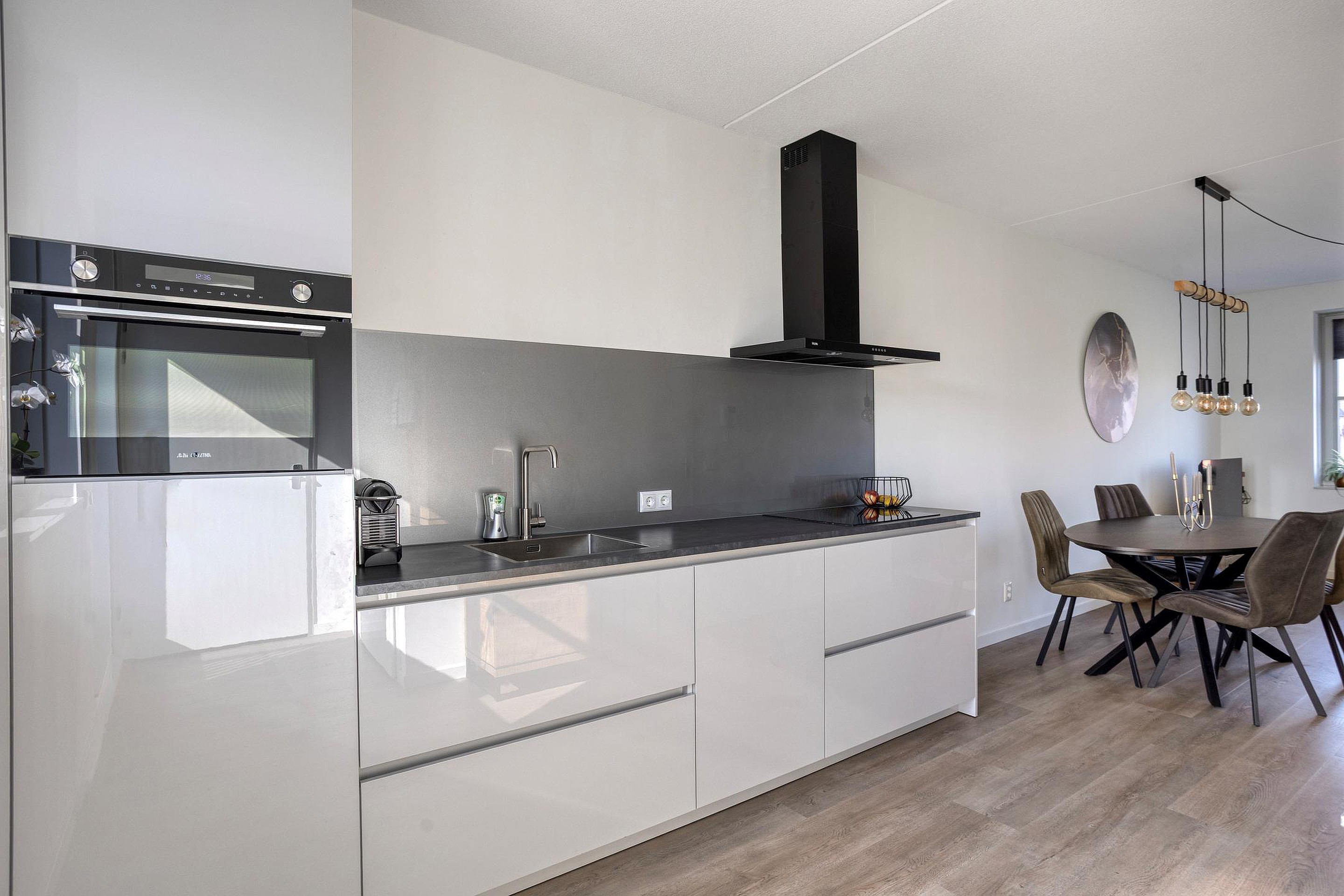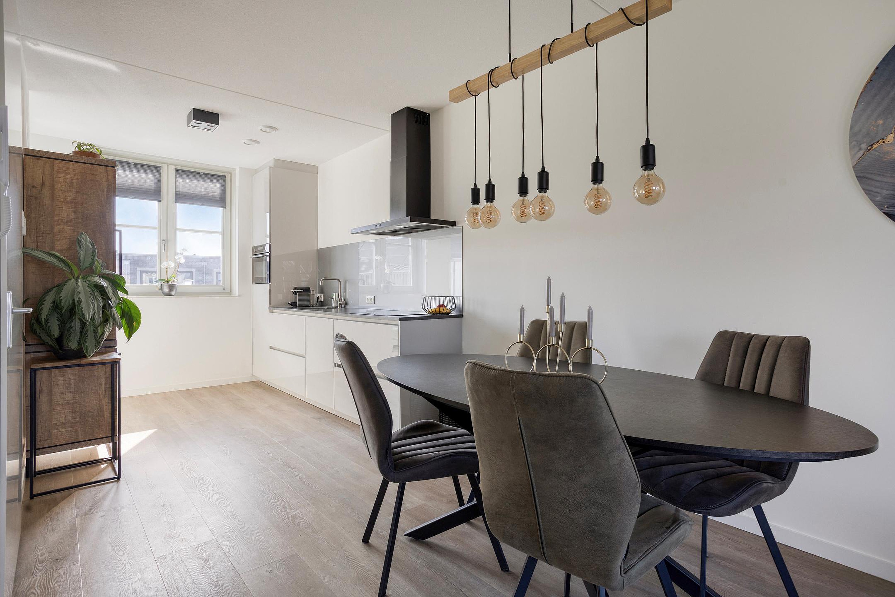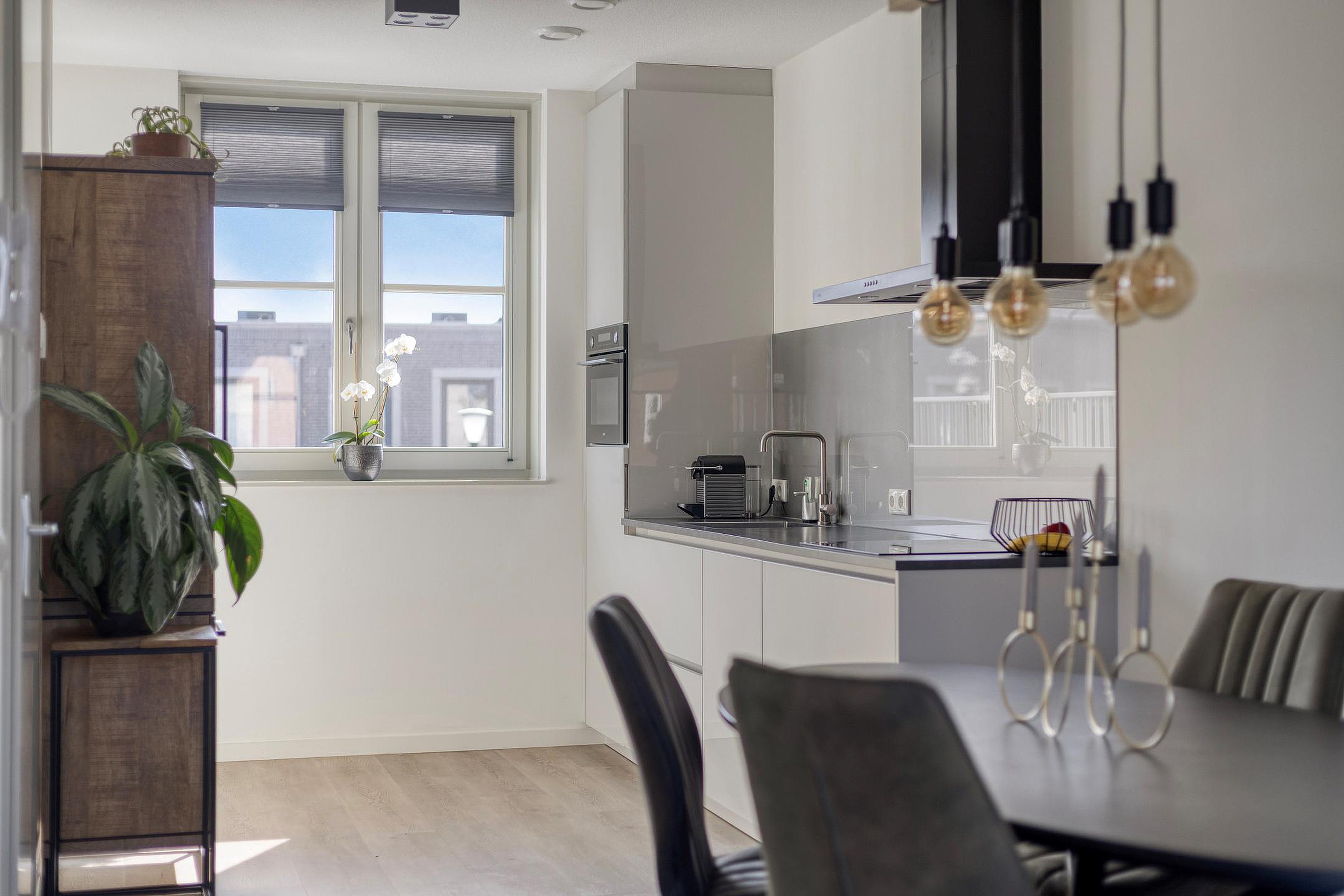 Vanuit de hal met meterkast is er toegang tot het toilet, de woonkamer met open keuken en de trapopgang naar de tweede verdieping. Vanuit de keuken is er toegang tot een bergkast, een technische ruimte en het dakterras. De keuken in rechte opstelling is v.v. diverse kasten en lades, een kunststof werkblad met spoelbak en mengkraan, een inductiekookplaat, afzuigkap, combimagnetron, koelkast en een vaatwasser. De vloer van deze verdieping is v.v. pvc met vloerverwarming en vloerkoeling. De wanden van deze verdieping zijn v.v. stucwerk. De plafonds zijn afgewerkt met spuitwerk. De kozijnen zijn van hout met triple glas. Het toilet is deels betegeld en v.v. een hangend toilet en fonteintje.