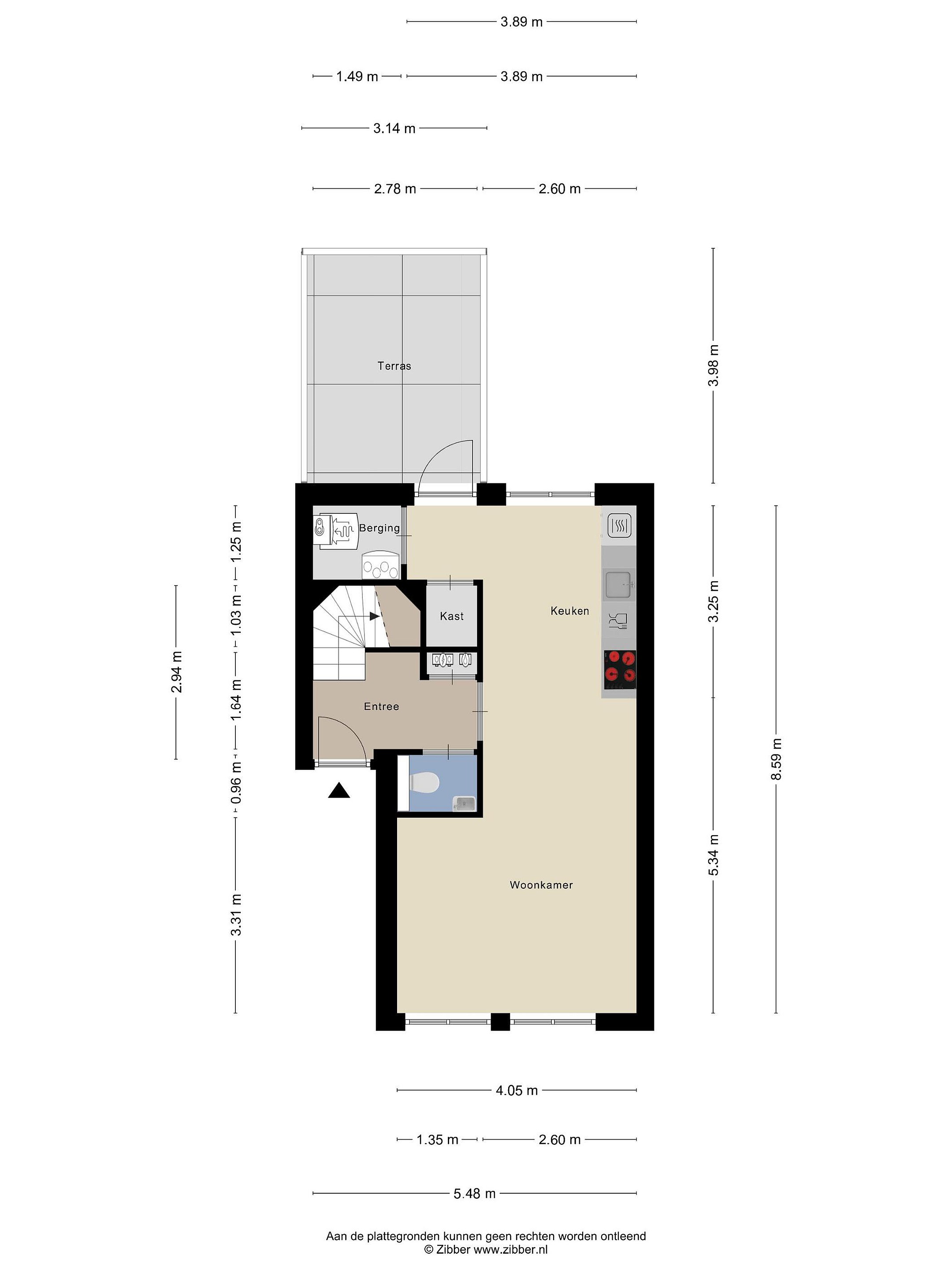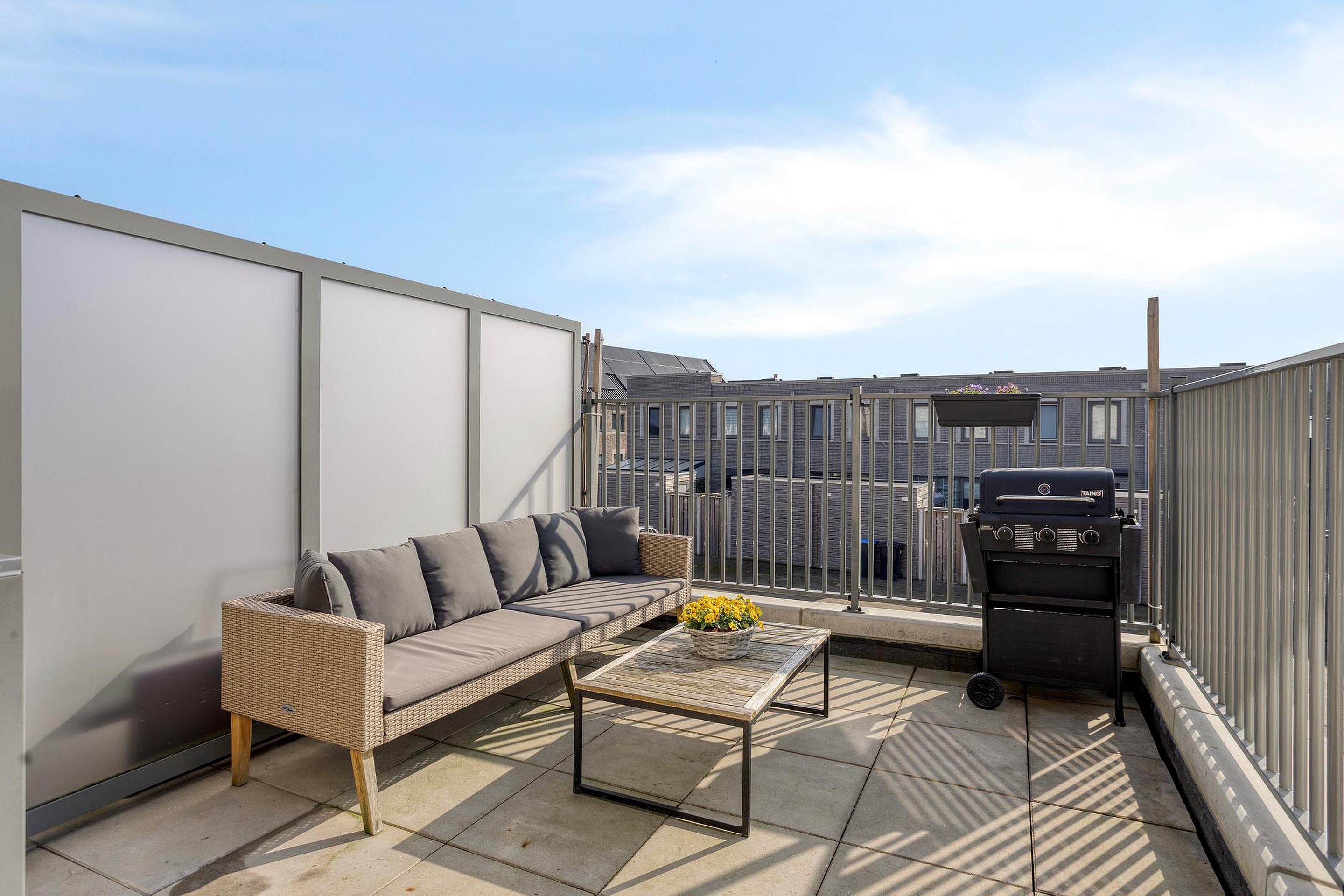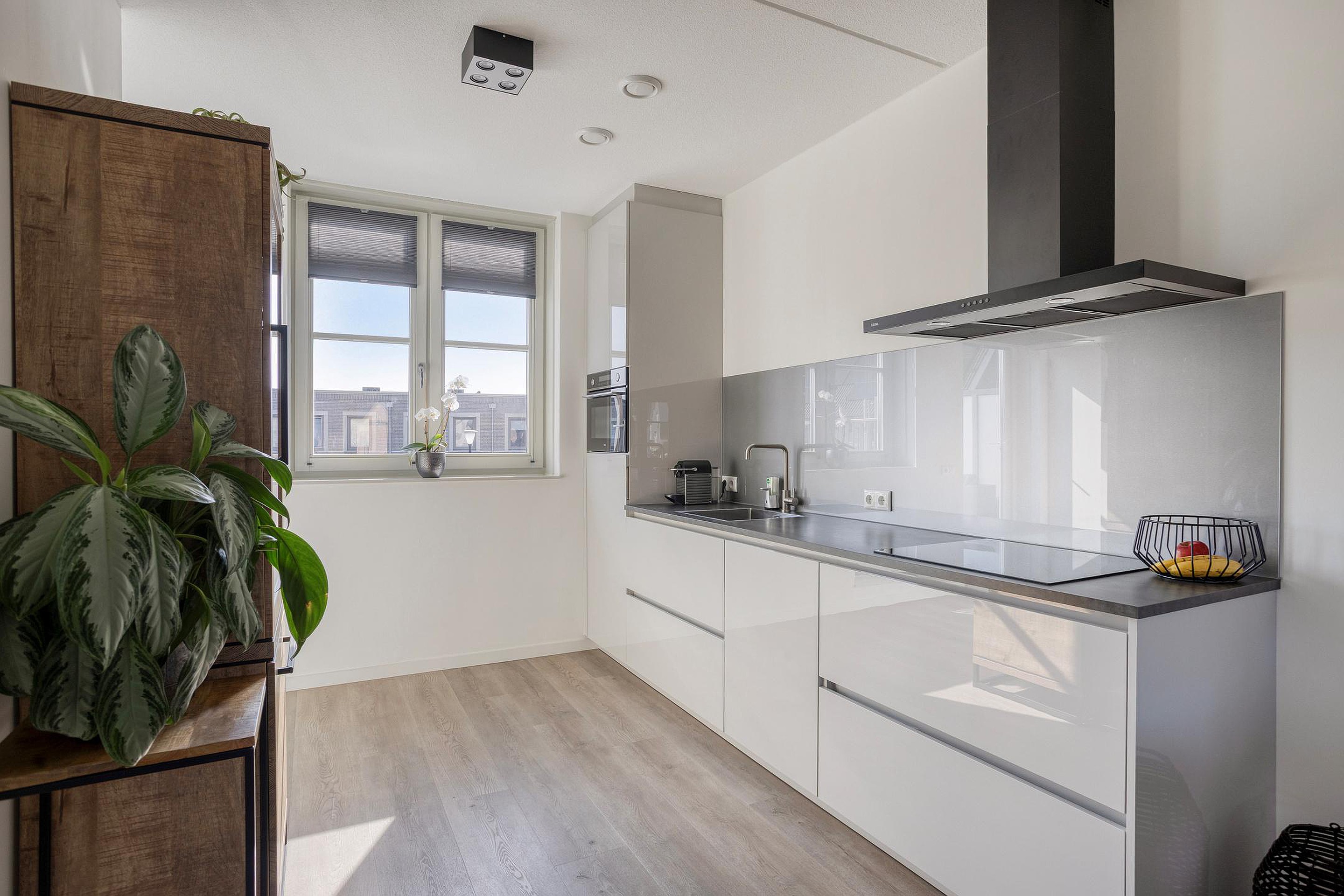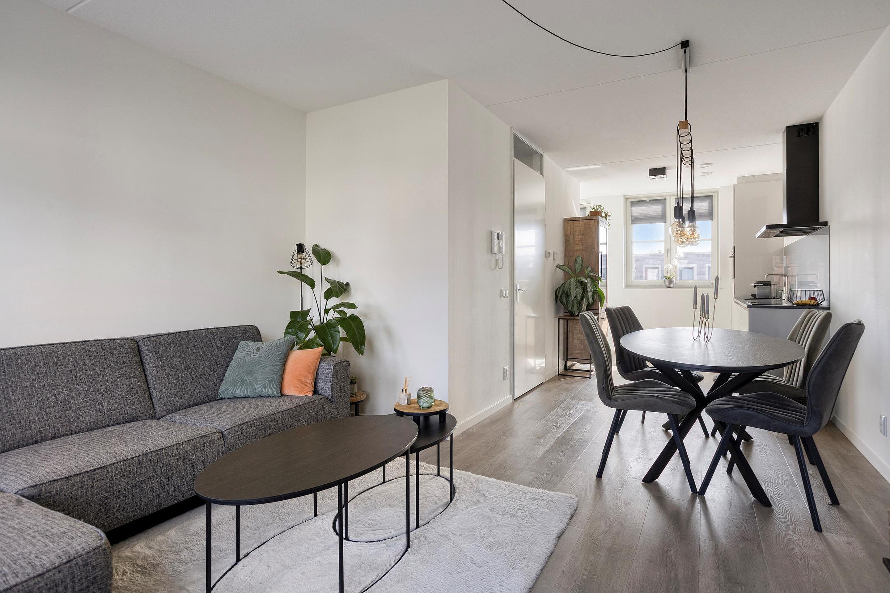 Vanuit de hal met meterkast is er toegang tot het toilet, de woonkamer met open keuken en de trapopgang naar de tweede verdieping. Vanuit de keuken is er toegang tot een bergkast, een technische ruimte en het dakterras. De keuken in rechte opstelling is v.v. diverse kasten en lades, een kunststof werkblad met spoelbak en mengkraan, een inductiekookplaat, afzuigkap, combimagnetron, koelkast en een vaatwasser. De vloer van deze verdieping is v.v. pvc met vloerverwarming en vloerkoeling. De wanden van deze verdieping zijn v.v. stucwerk. De plafonds zijn afgewerkt met spuitwerk. De kozijnen zijn van hout met triple glas. Het toilet is deels betegeld en v.v. een hangend toilet en fonteintje.