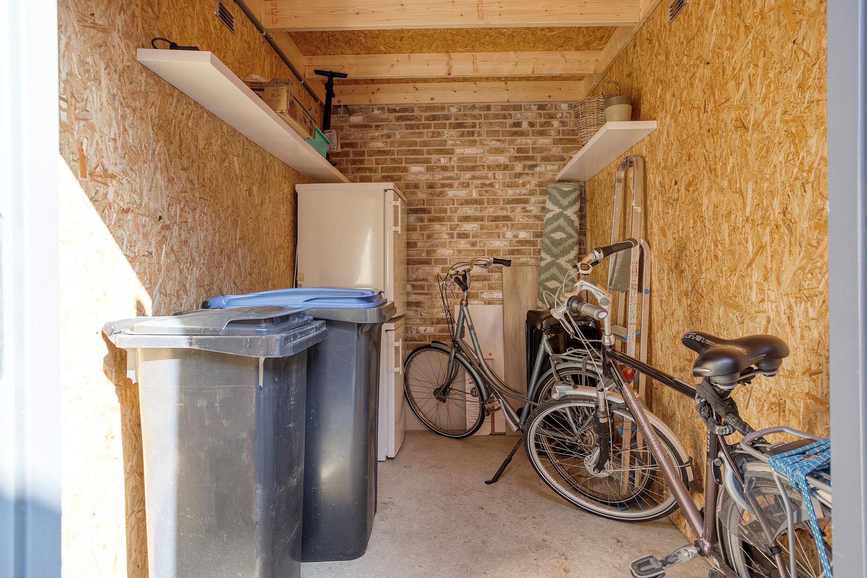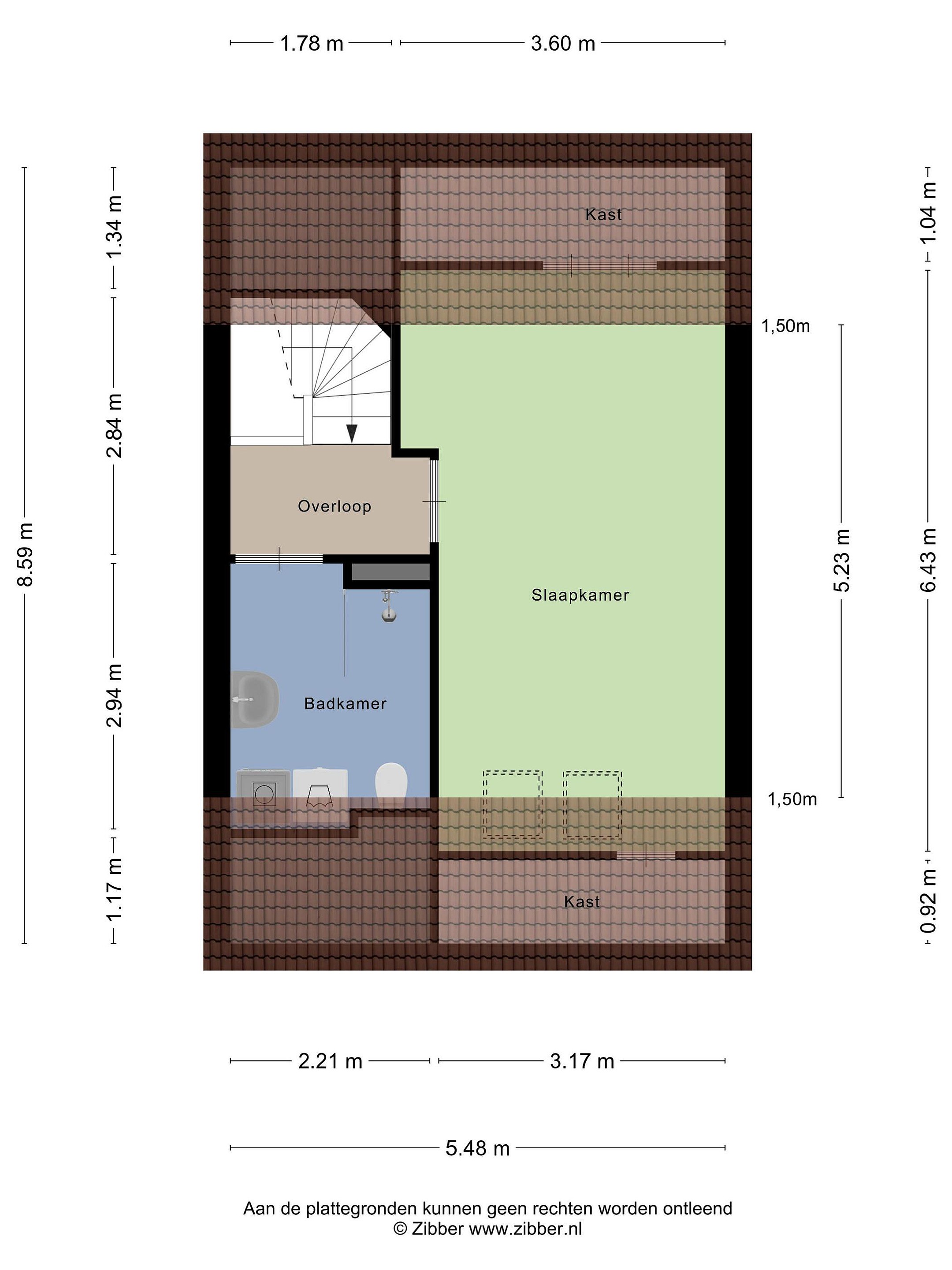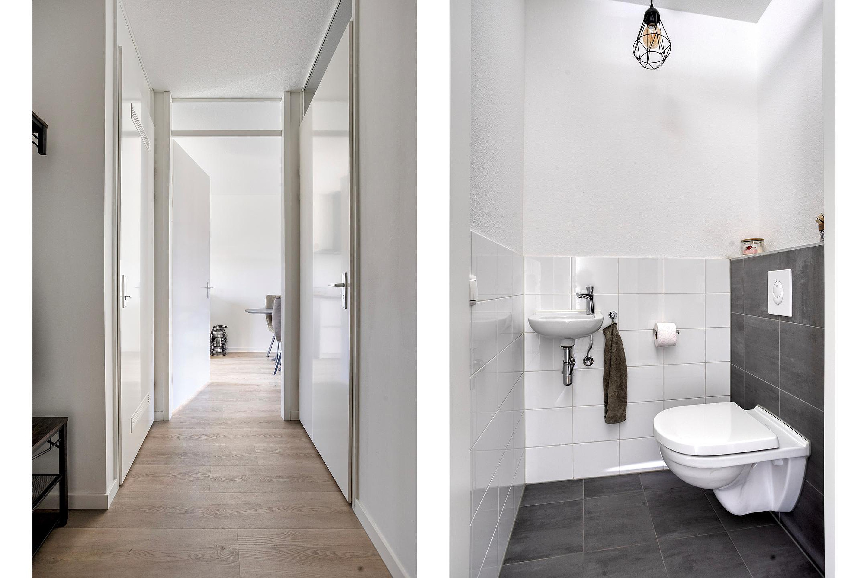 Vanuit de overloop is er toegang tot de slaapkamer en de badkamer. De badkamer is geheel betegeld en v.v. een hangend toilet, een inloopdouche met regendouche, een wastafel met meubel en een designradiator. De vloer van de badkamer is v.v. vloerverwarming en vloerkoeling. Tevens zijn hier een elektrische radiator en de aansluiting voor de wasmachine gesitueerd. Op de slaapkamer is een kledingkast geplaatst met daarachter extra bergruimte. De vloer van de slaapkamer en overloop is v.v. pvc met vloerverwarming en vloerkoeling. De wanden zijn v.v. stucwerk. De plafonds zijn afgewerkt met spuitwerk. De kozijnen zijn v.v. hout met HR++ glas.