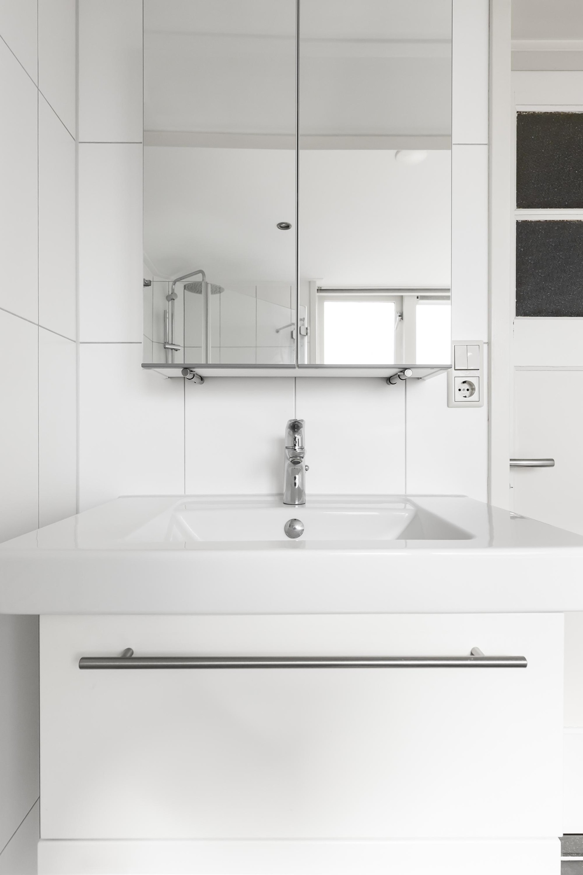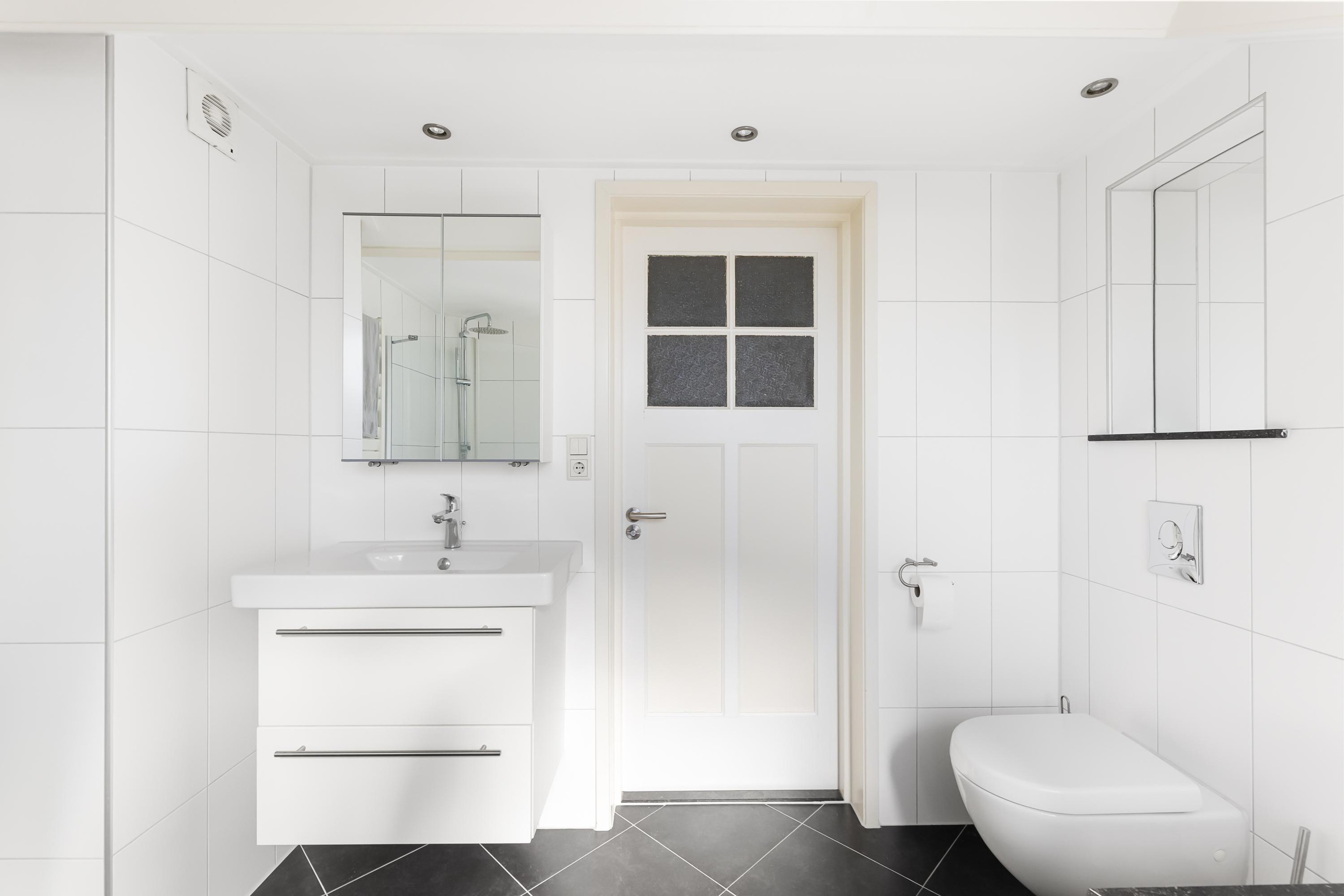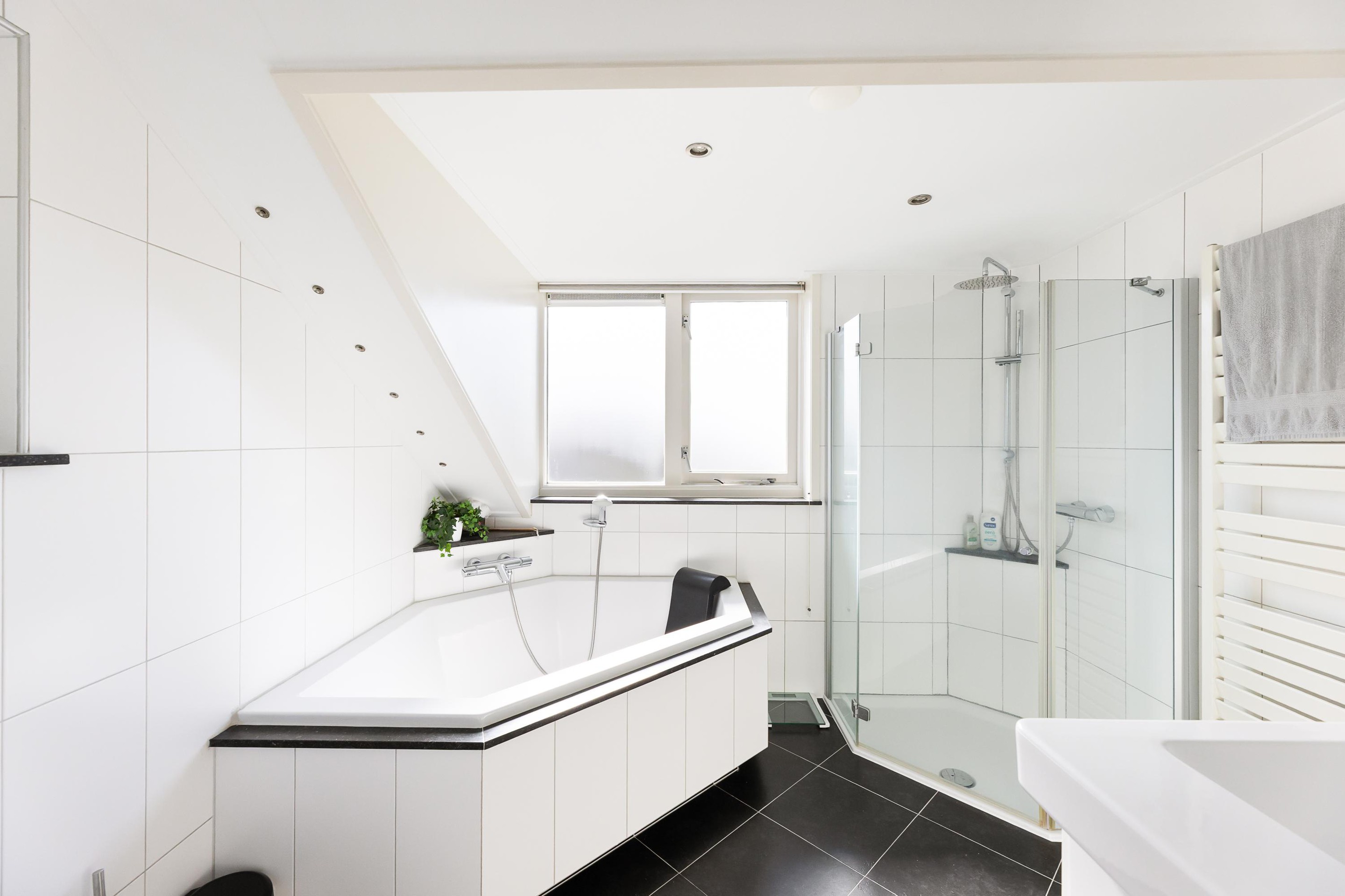 Overloop, nette neutraal betegelde badkamer met ligbad, douche, toilet en wastafelmeubel. Er zijn twee royale slaapkamers en een ruime (berg)kamer met opstelling van de c.v.ketel en de witgoedaansluiting.