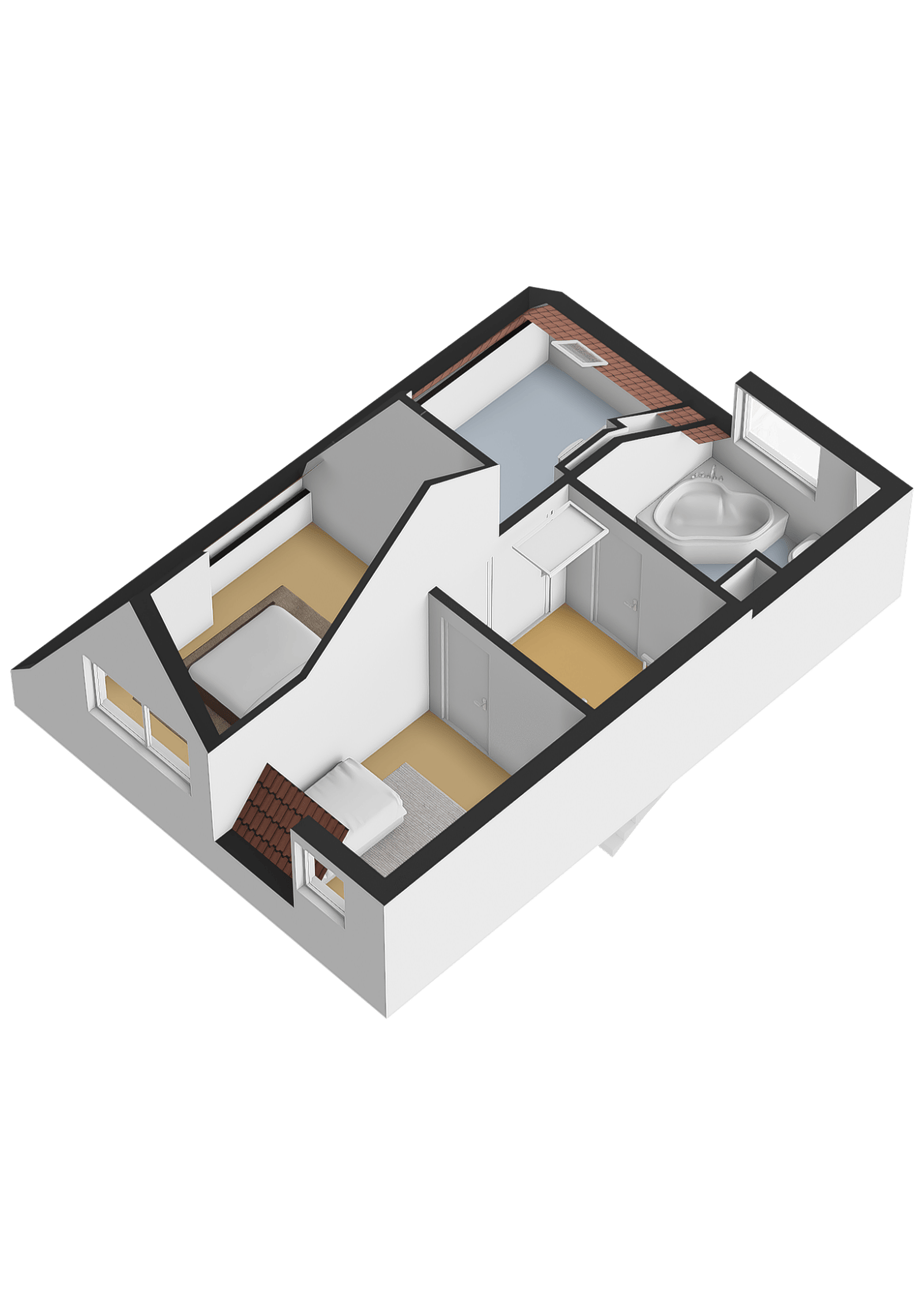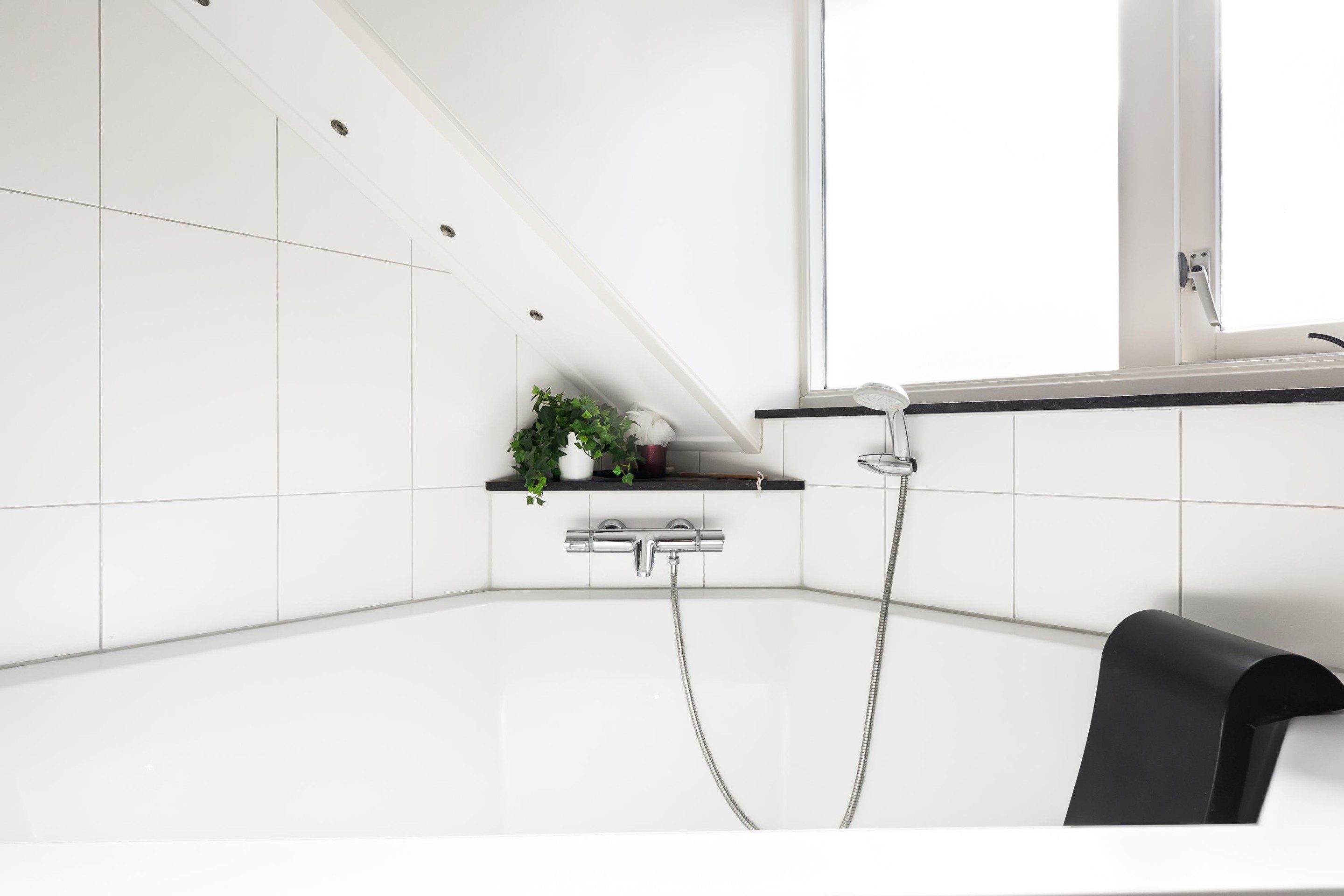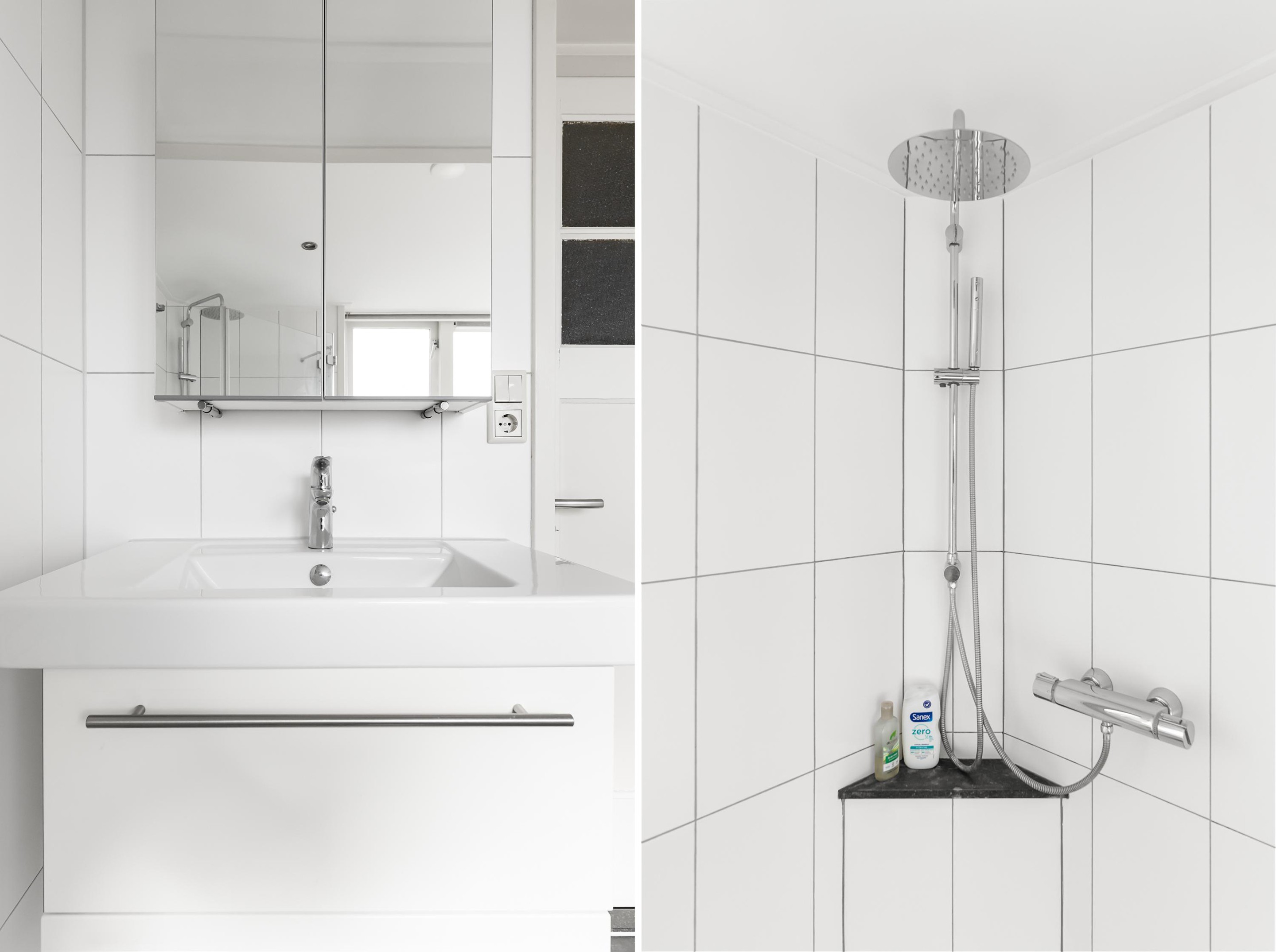 Overloop, nette neutraal betegelde badkamer met ligbad, douche, toilet en wastafelmeubel. Er zijn twee royale slaapkamers en een ruime (berg)kamer met opstelling van de c.v.ketel en de witgoedaansluiting.