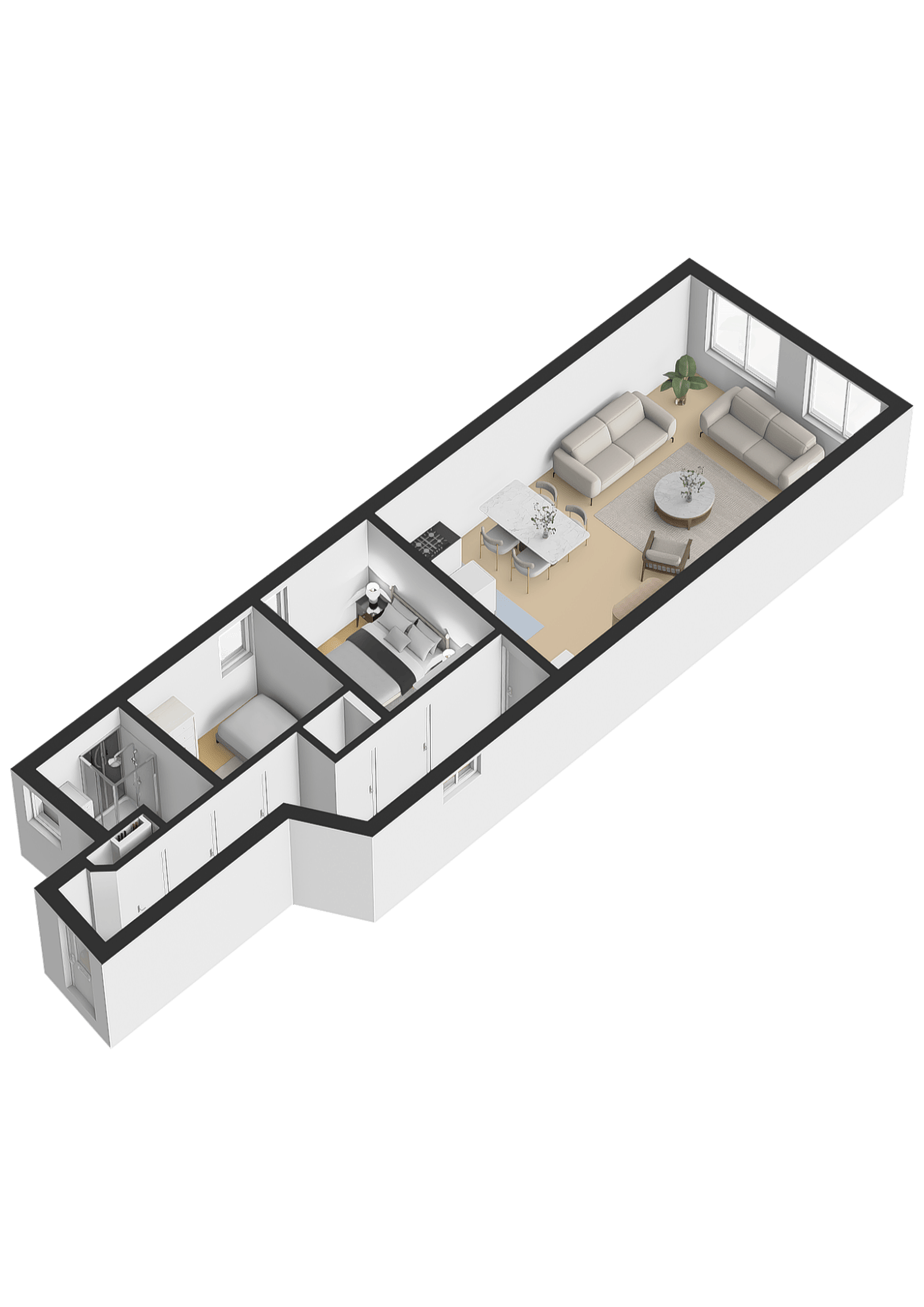 De royale woonkamer over de hele breedte heeft uitzicht op de Vrouwestraat. De open keuken is netjes afgewerkt en voorzien van gaskookplaat met afzuigkap, combi-oven, nieuwe vaatwasser en nieuwe koelkast met vriezer.