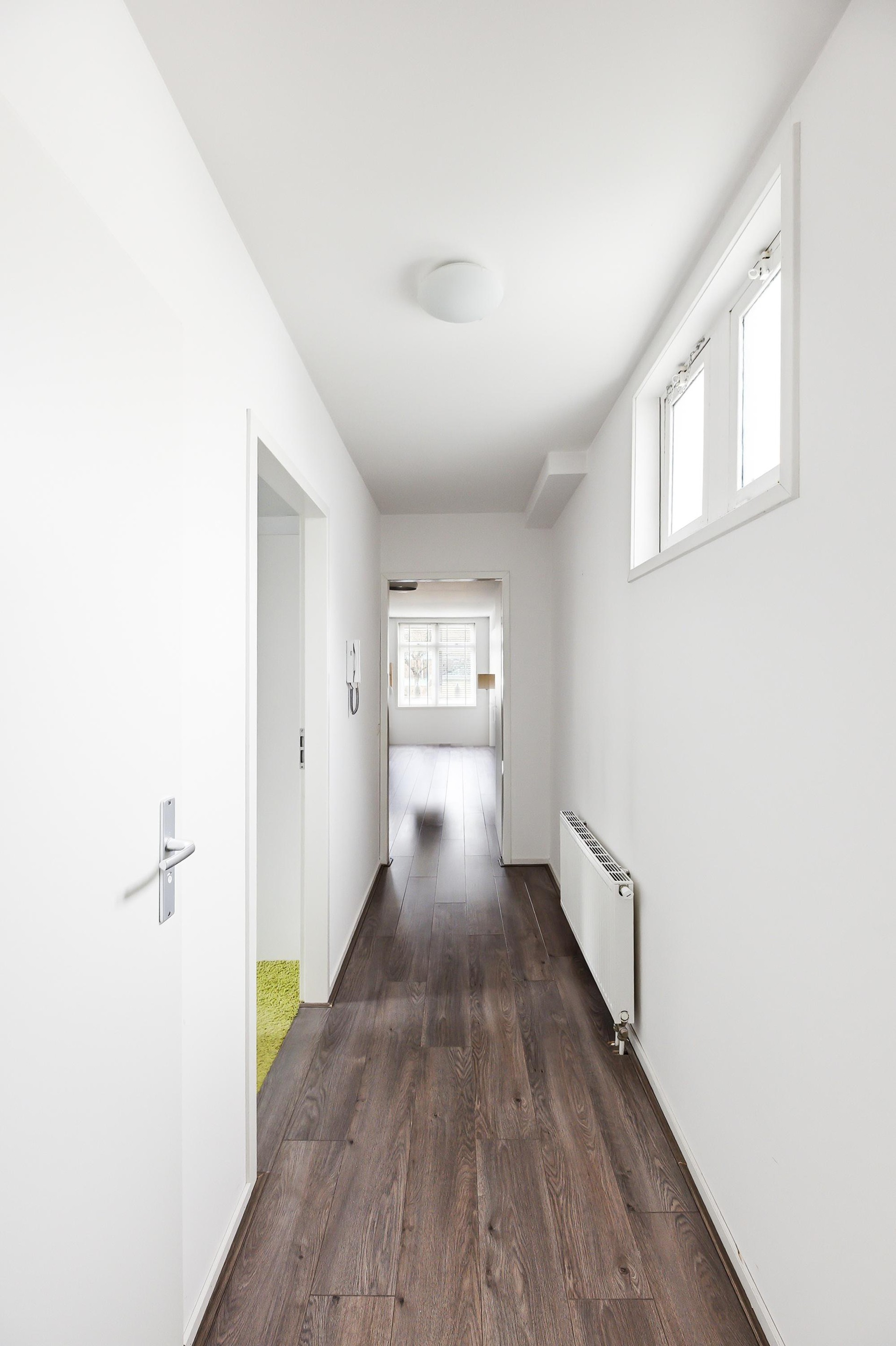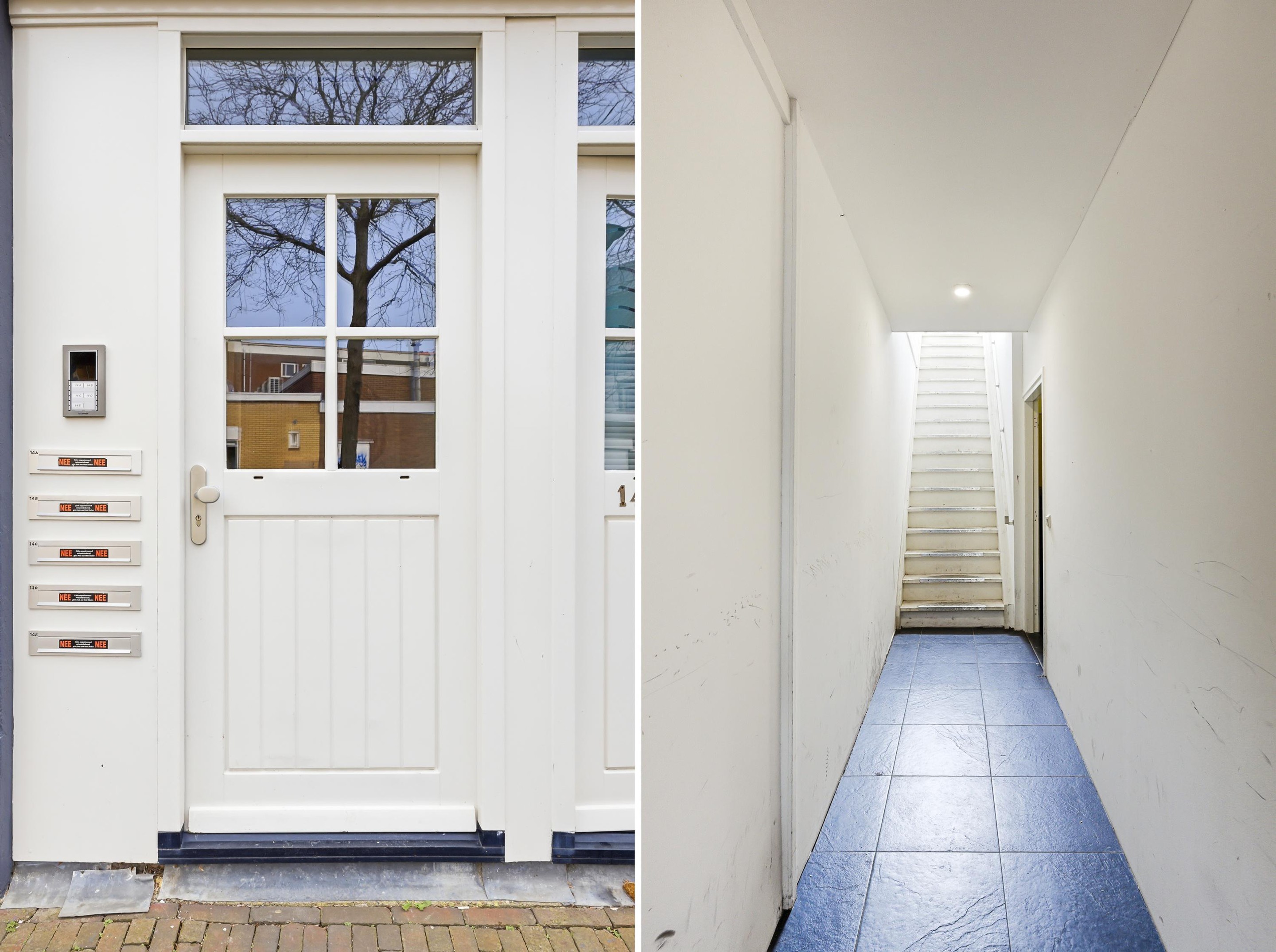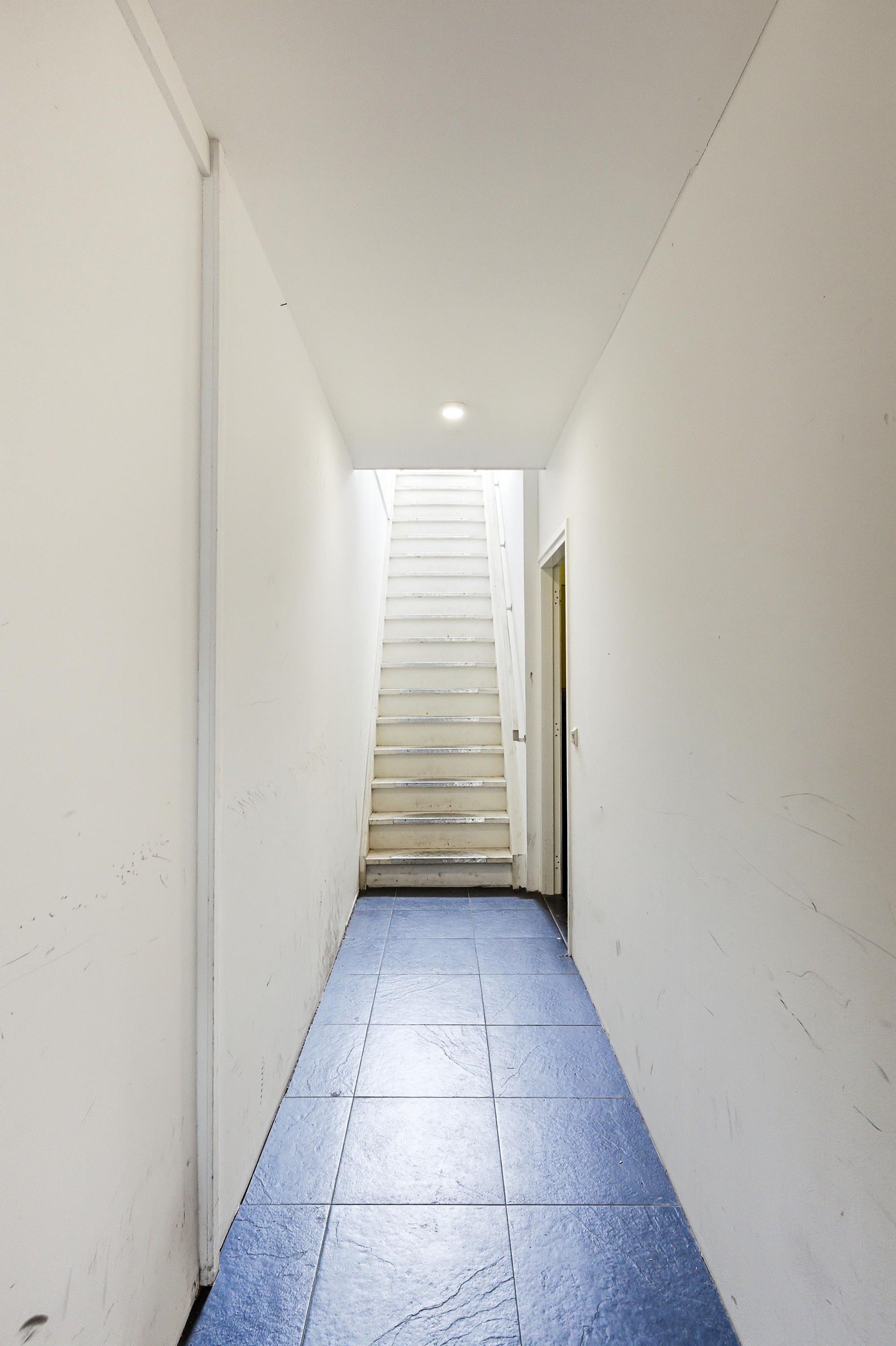 Gemeenschappelijke entree, de centrale hal met toegang tot de bergingen en de trapopgang naar het appartement op de eerste verdieping.