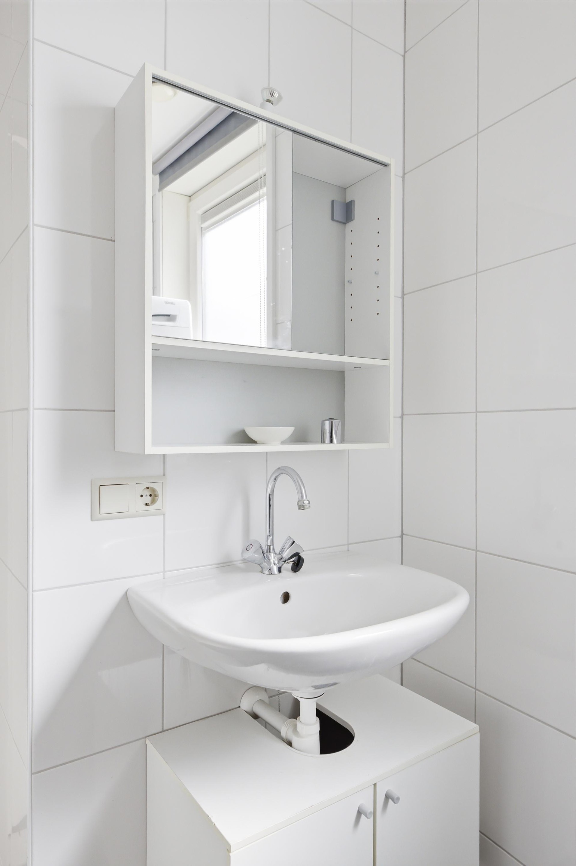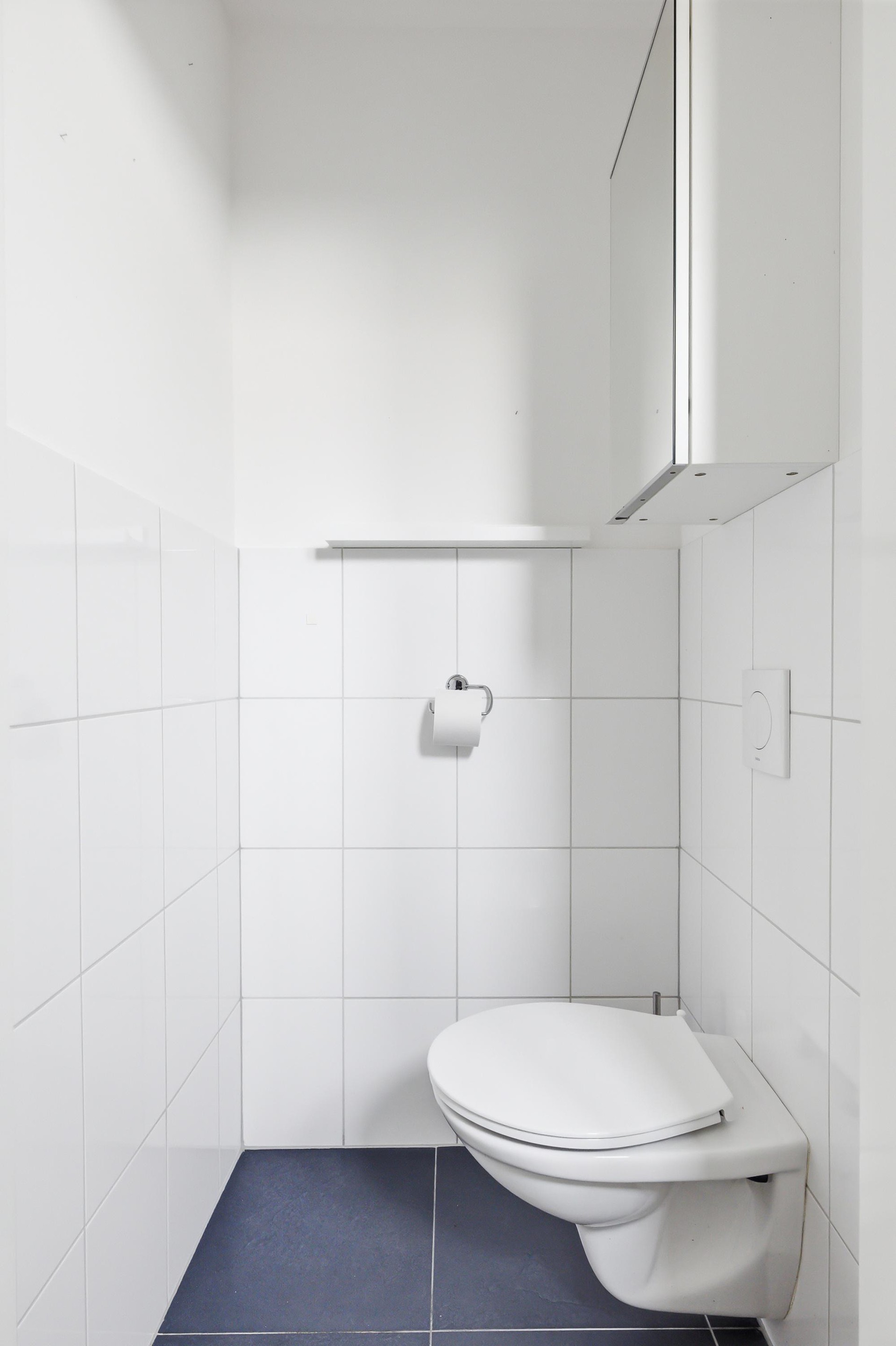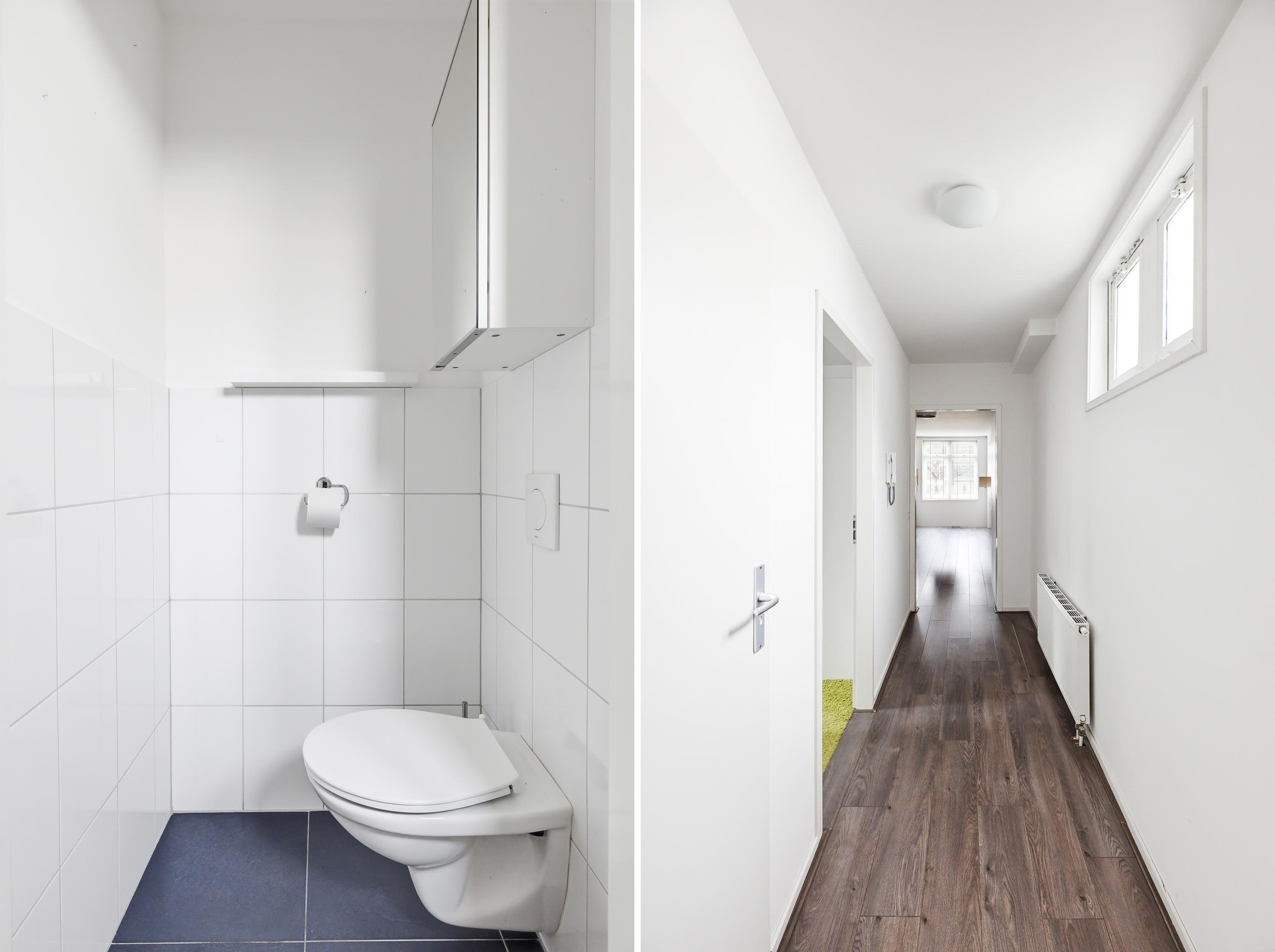 Hal met meterkast, badkamer met douche, wastafel en de witgoedaansluiting, twee slaapkamers en het toilet.
