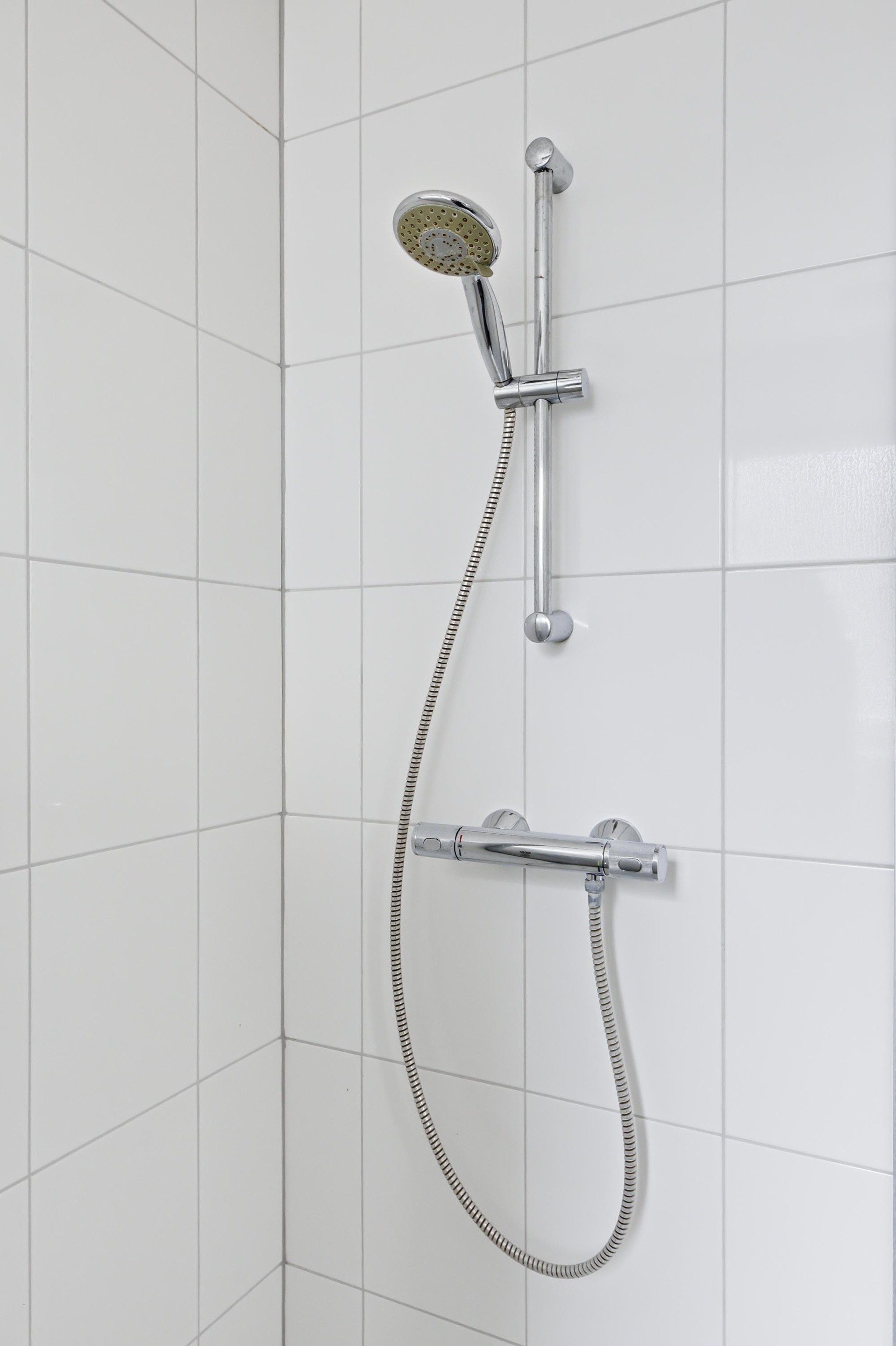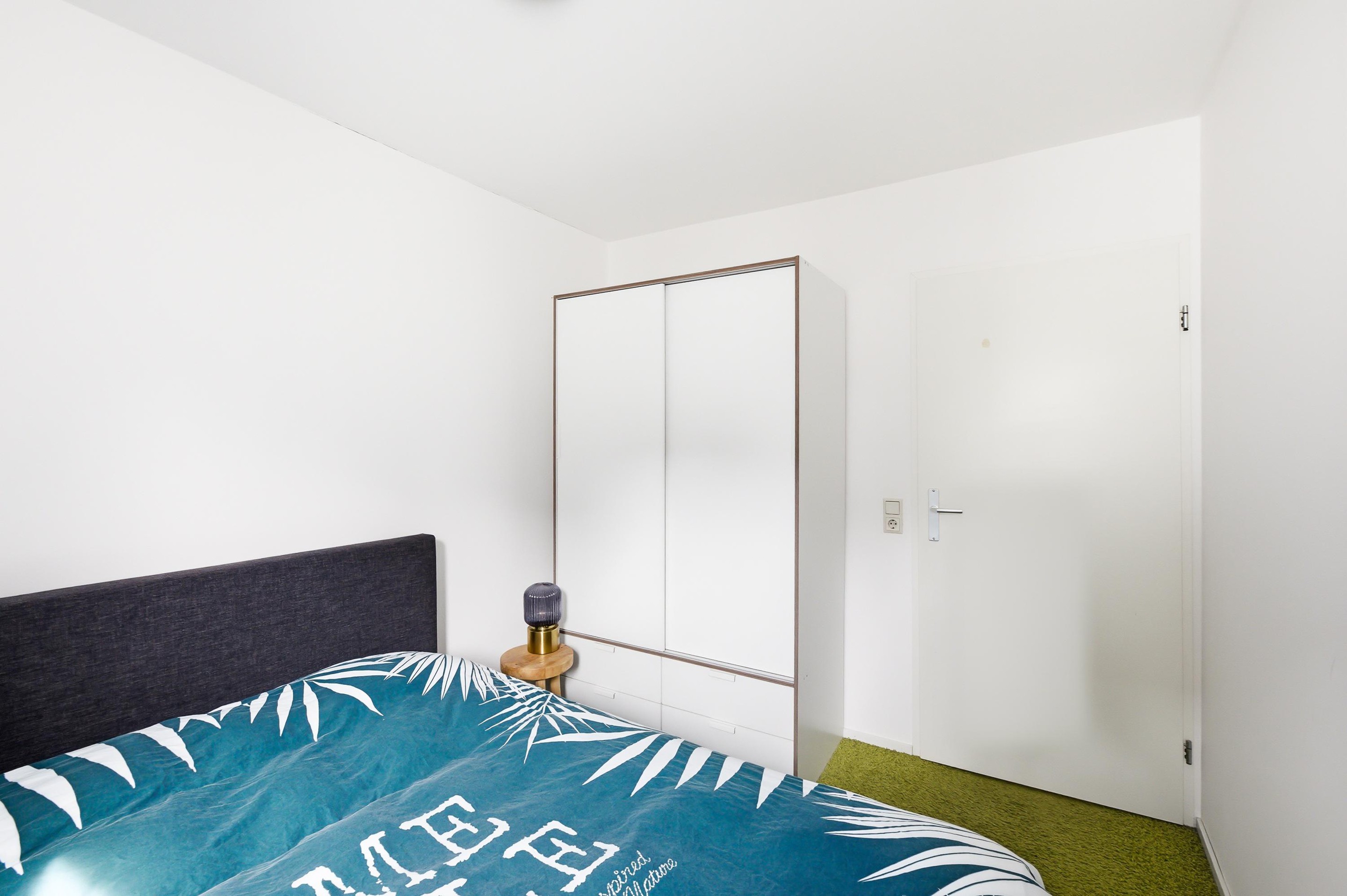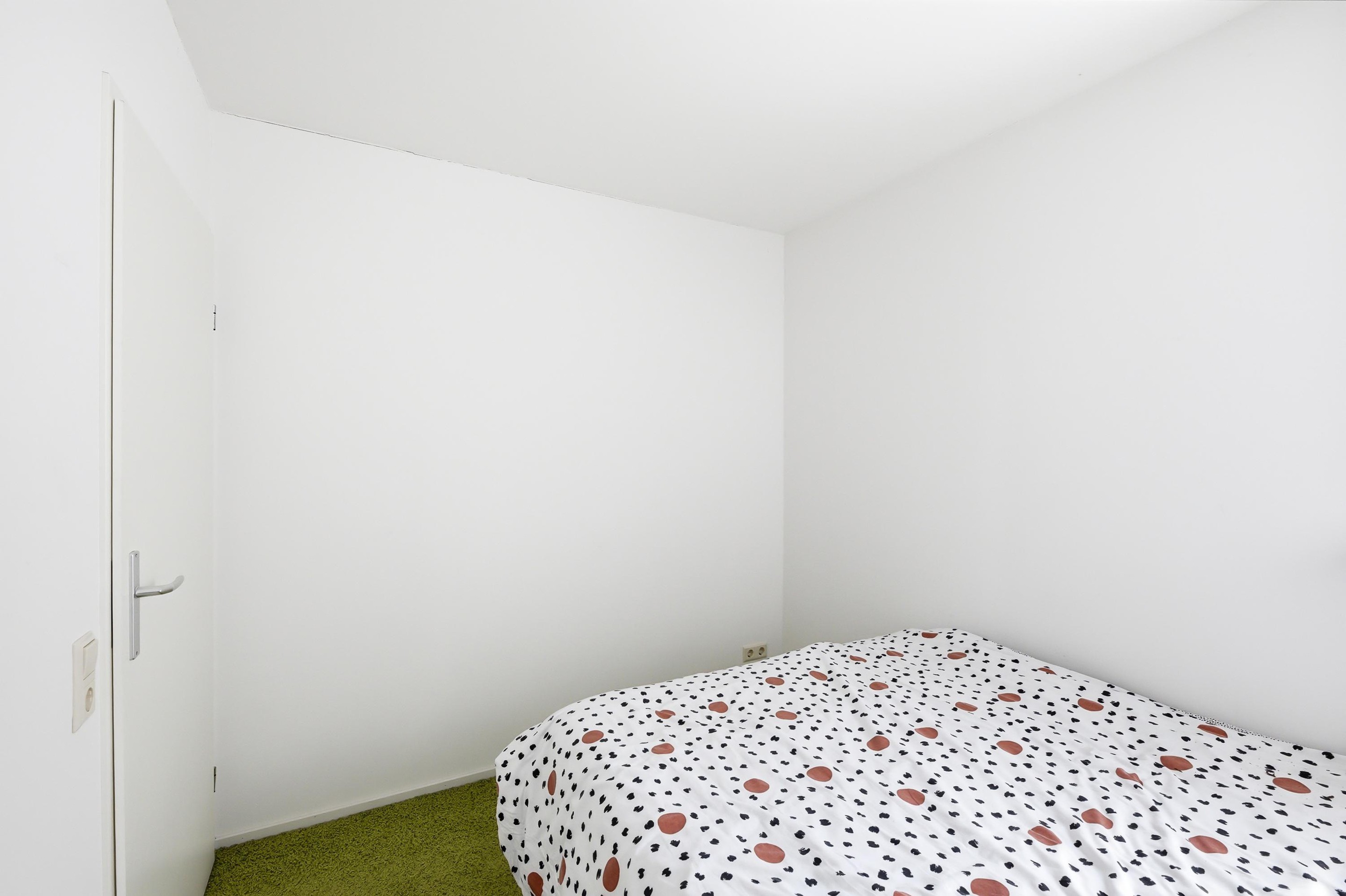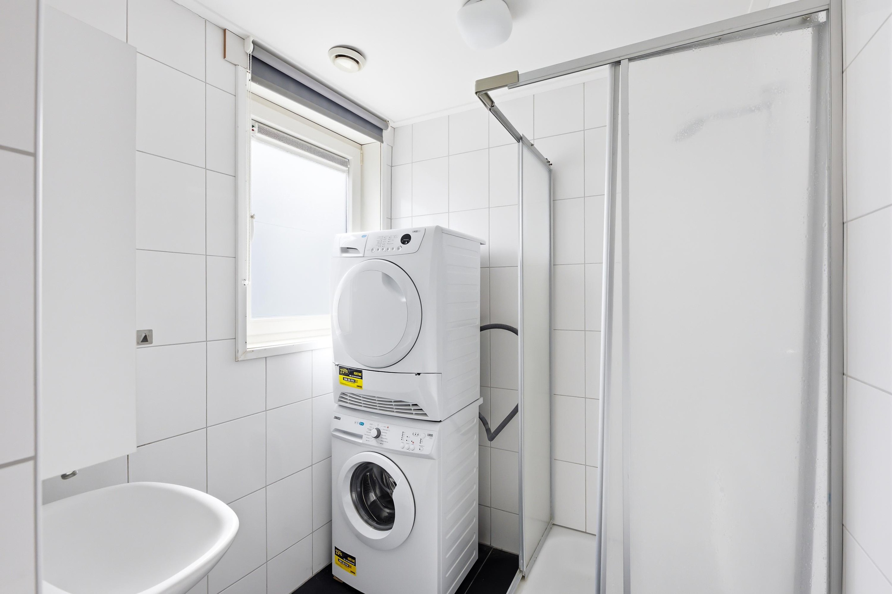 Hal met meterkast, badkamer met douche, wastafel en de witgoedaansluiting, twee slaapkamers en het toilet.