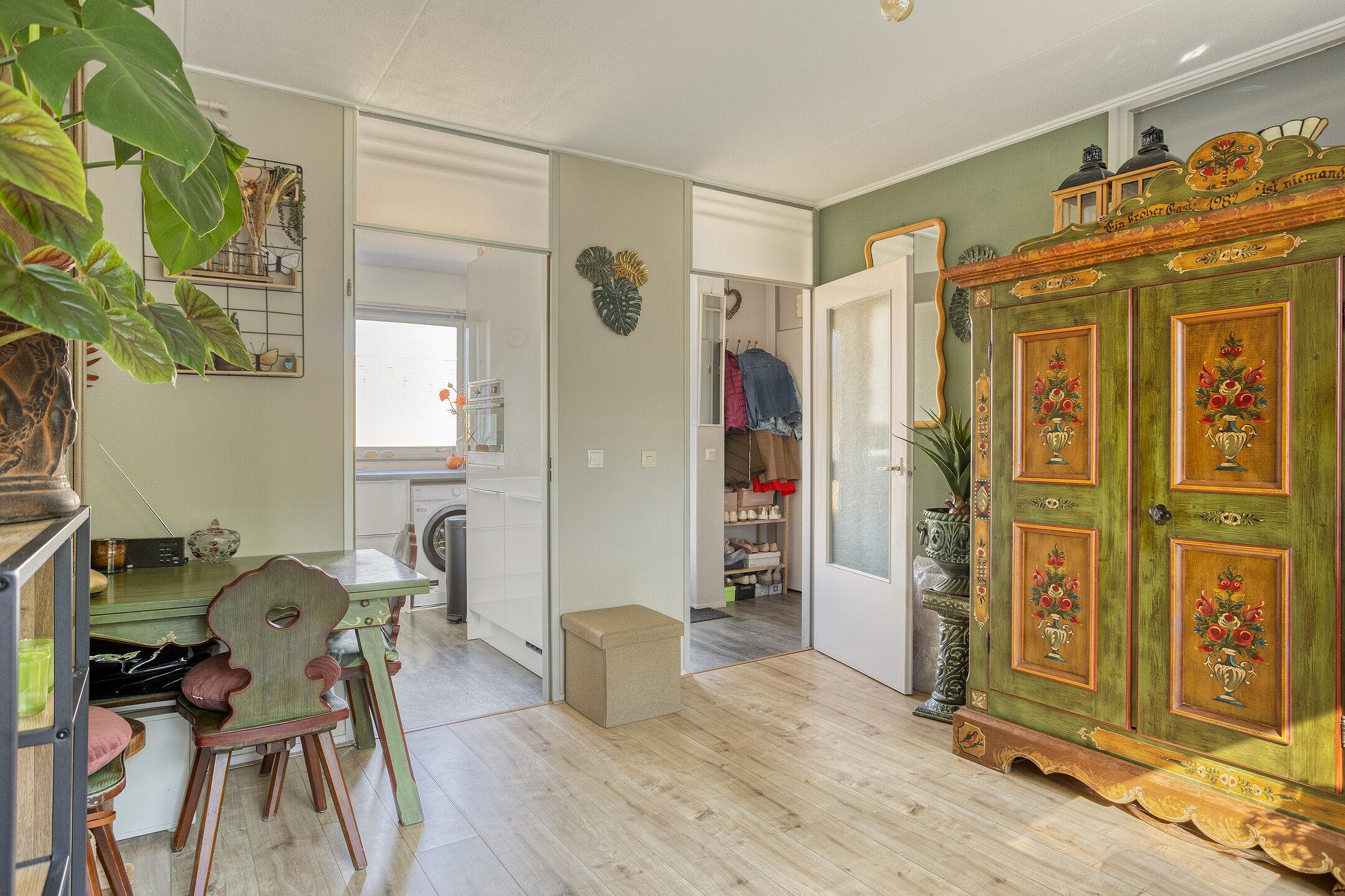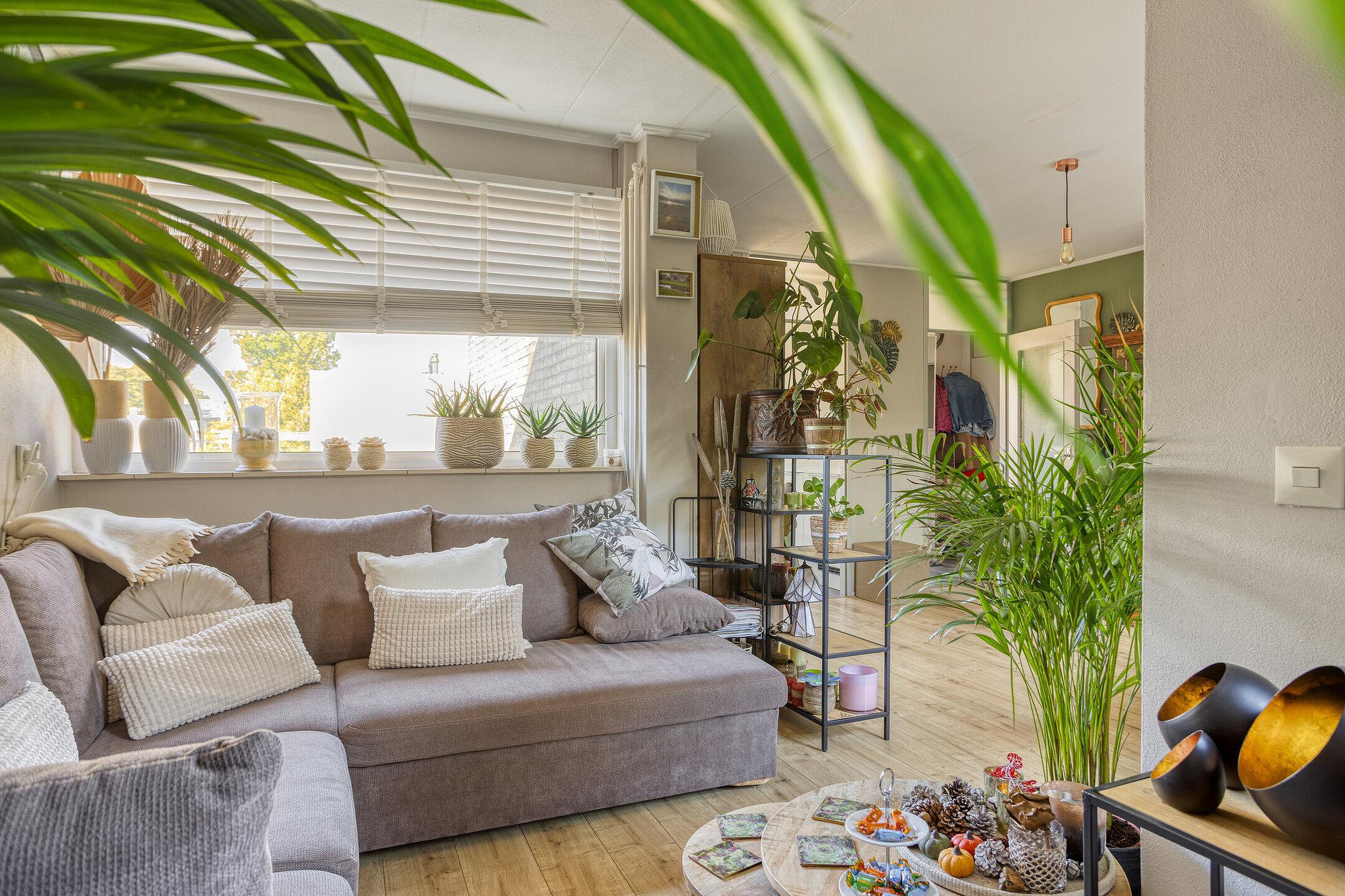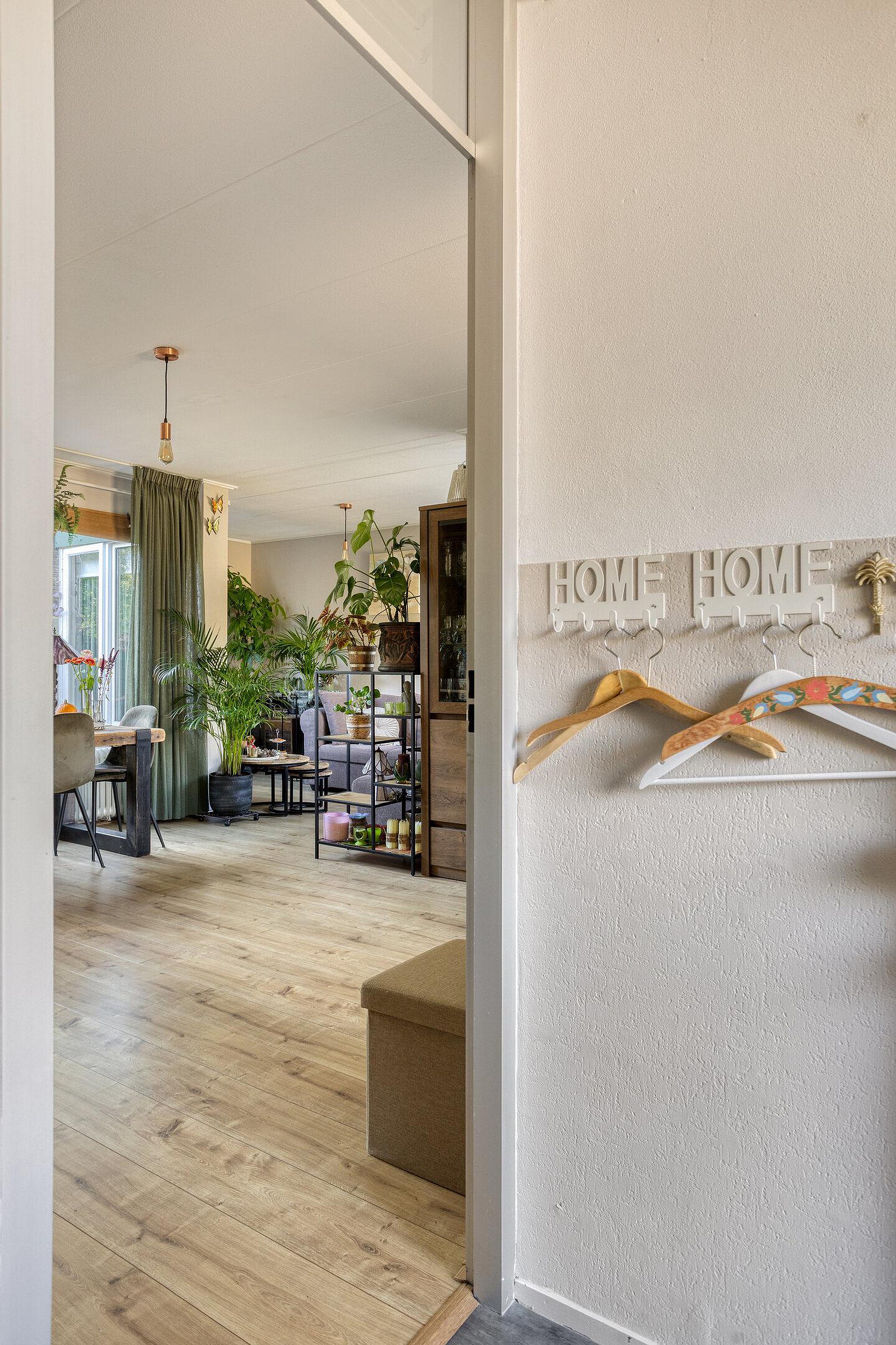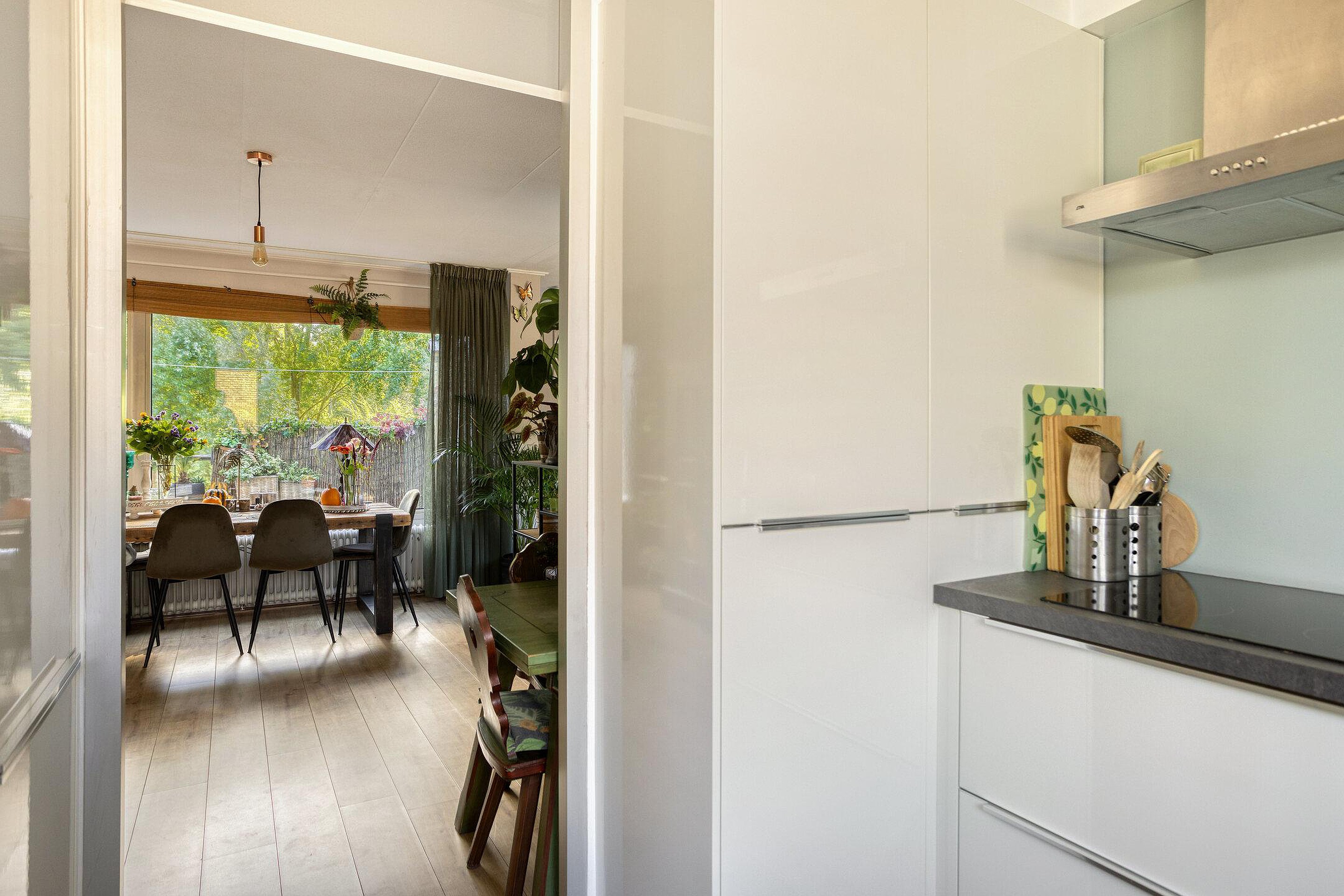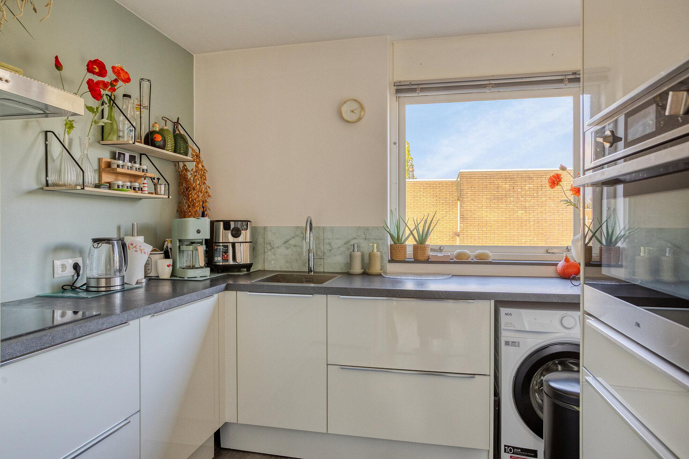 Via de stenen trap kom je bij de voordeur van het appartement, hal met meterkast en toegang tot een praktische inpandige berging. De woonkamer is echt ruim in een L-vorm met zicht op groen. De moderne witte keuken is aan de voorzijde gelegen, opgesteld in een L-vormig keukenblok met moderne apparatuur: vaatwasser, koel-/vriescombinatie, afzuigkap, combi-oven/magnetron, keramische kookplaat, Quooker en wasmachine aansluiting. De c.v. ketel is nog maar één jaar oud combiketel Intergas en netjes opgesteld, uit het zicht, achter een keukendeur.