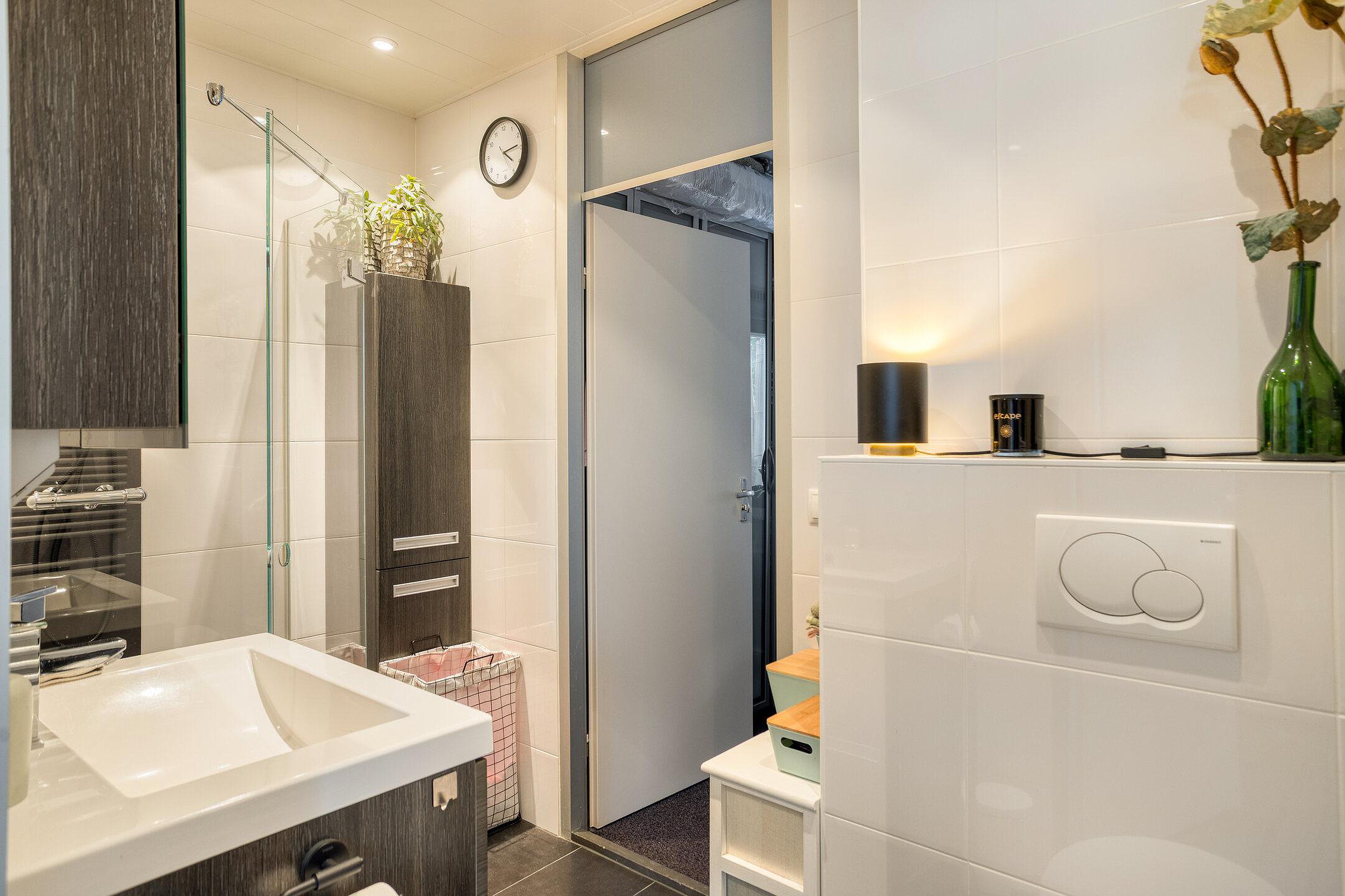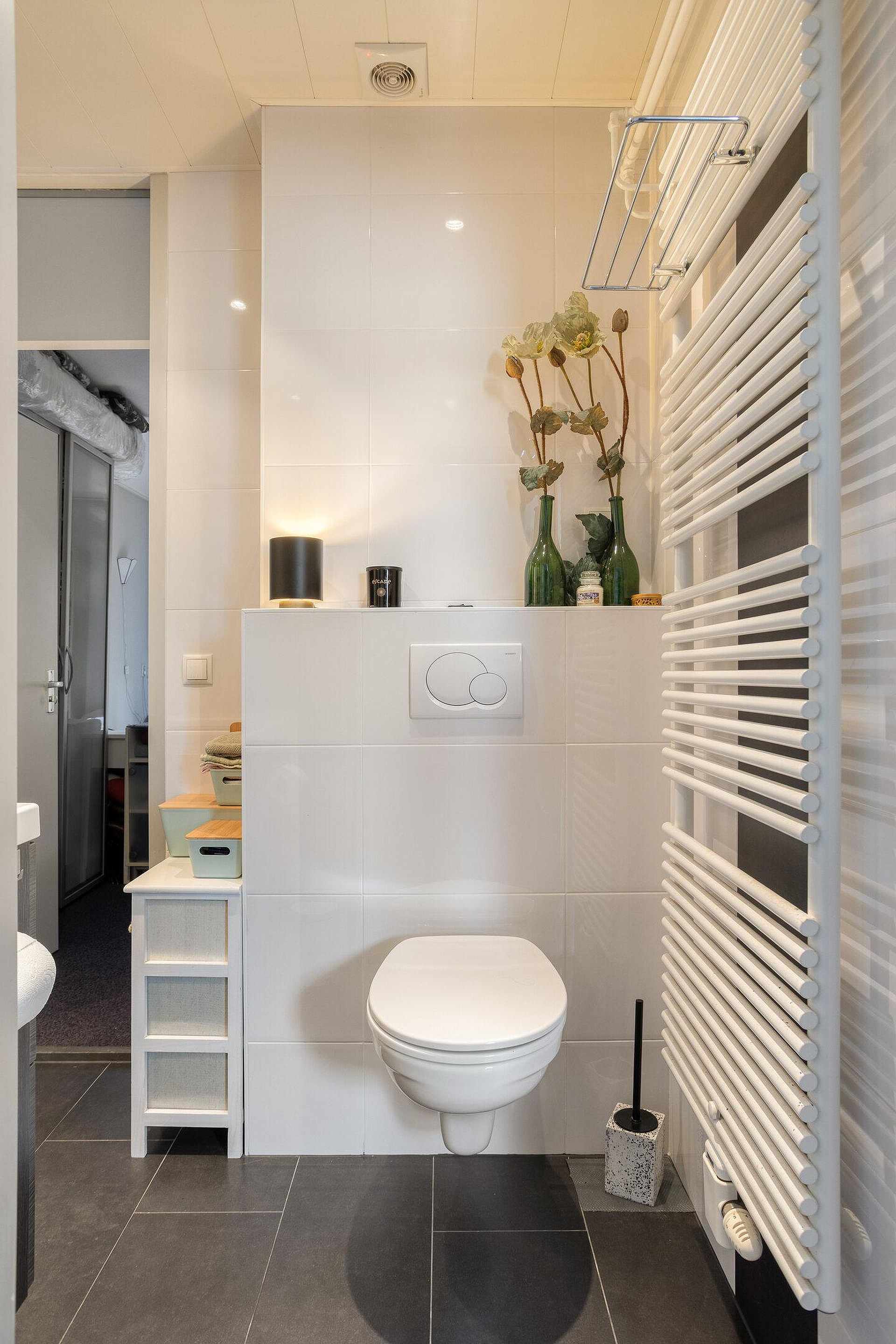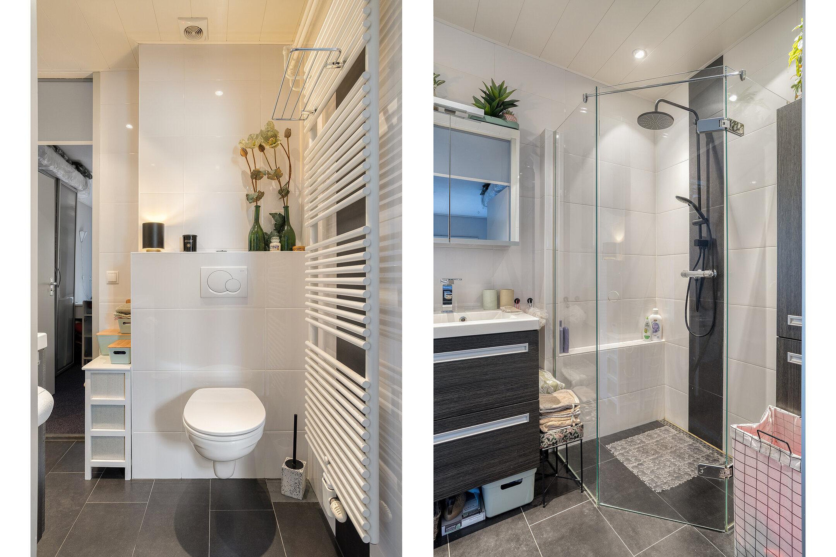 Via de slaapkamer maar ook via de hal is de modern ingerichte badkamer bereikbaar, met een douche met glazen wand, (hang)toilet en wastafel met meubel en als extra bergruimte een mooie kolomkast. Vanuit de woonkamer stap je via de balkondeur het terras op, gelegen op het zuiden met zicht op groen. Hier zit je heerlijk privé!