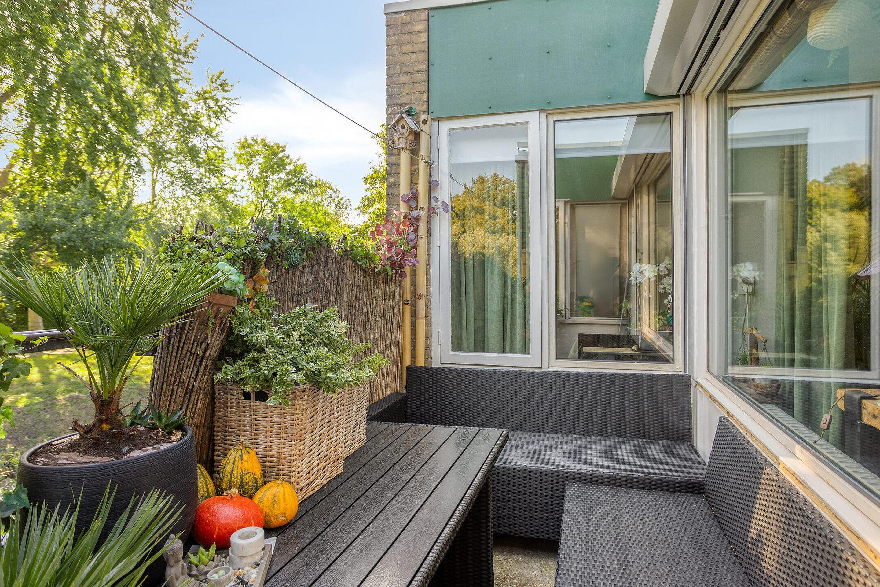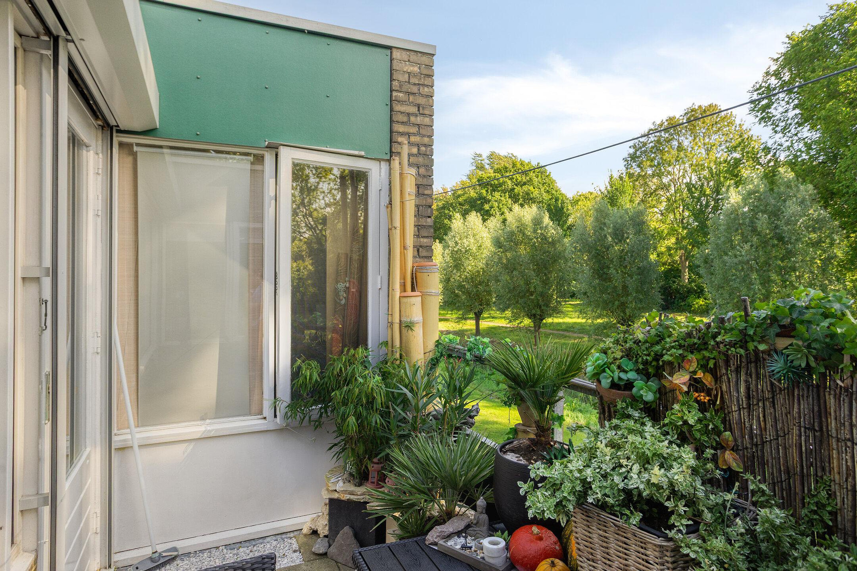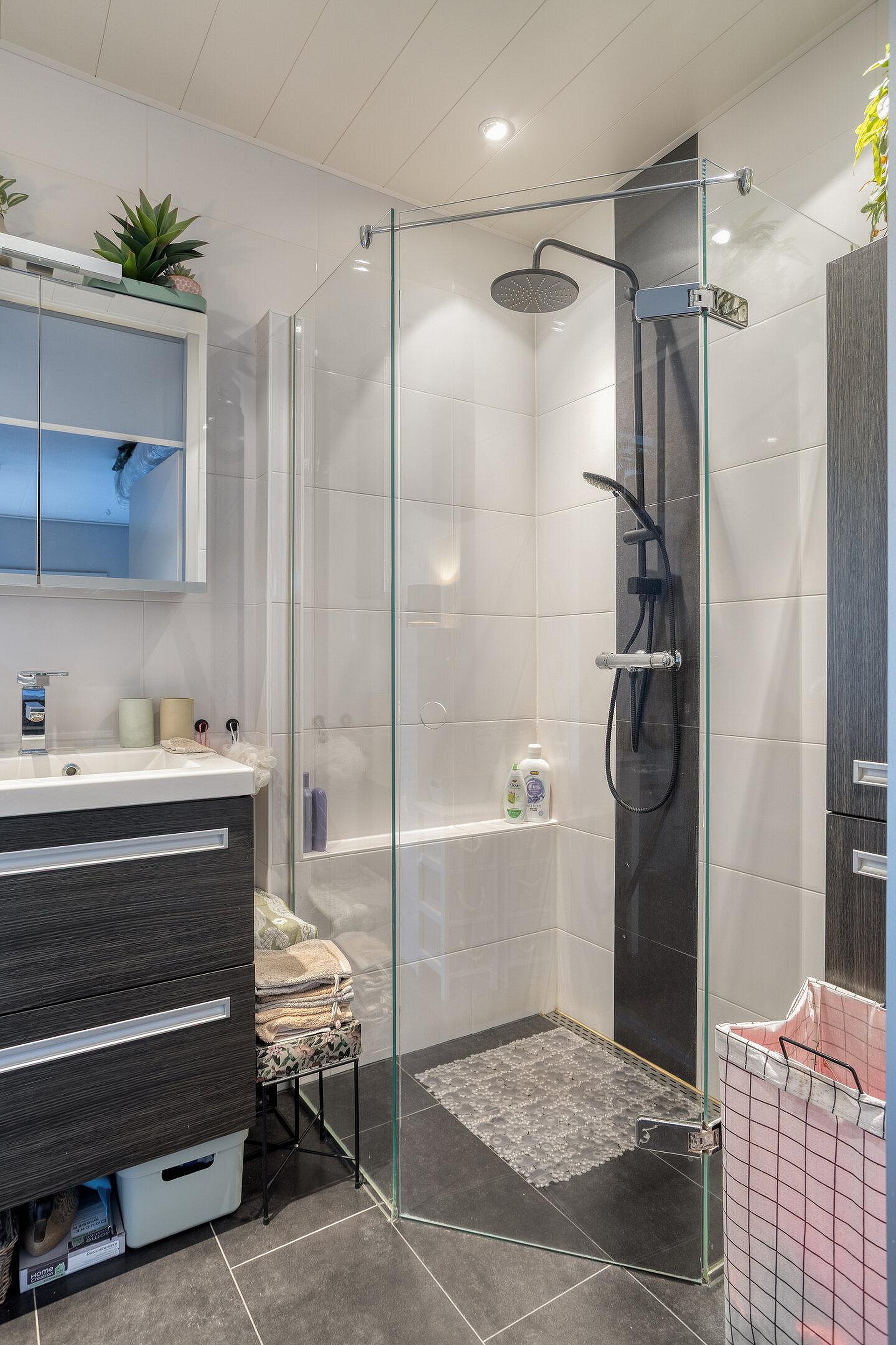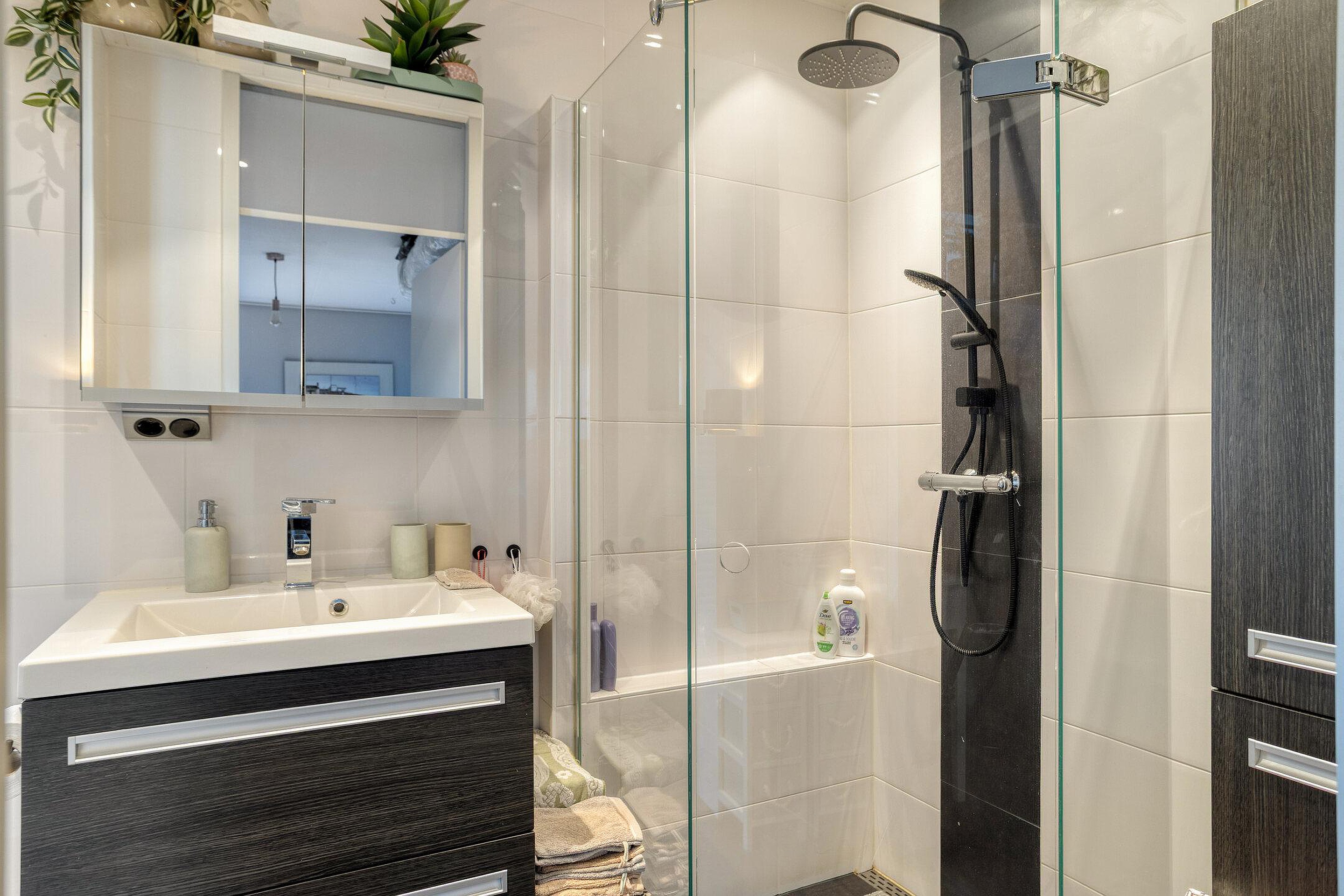Via de slaapkamer maar ook via de hal is de modern ingerichte badkamer bereikbaar, met een douche met glazen wand, (hang)toilet en wastafel met meubel en als extra bergruimte een mooie kolomkast. Vanuit de woonkamer stap je via de balkondeur het terras op, gelegen op het zuiden met zicht op groen. Hier zit je heerlijk privé!