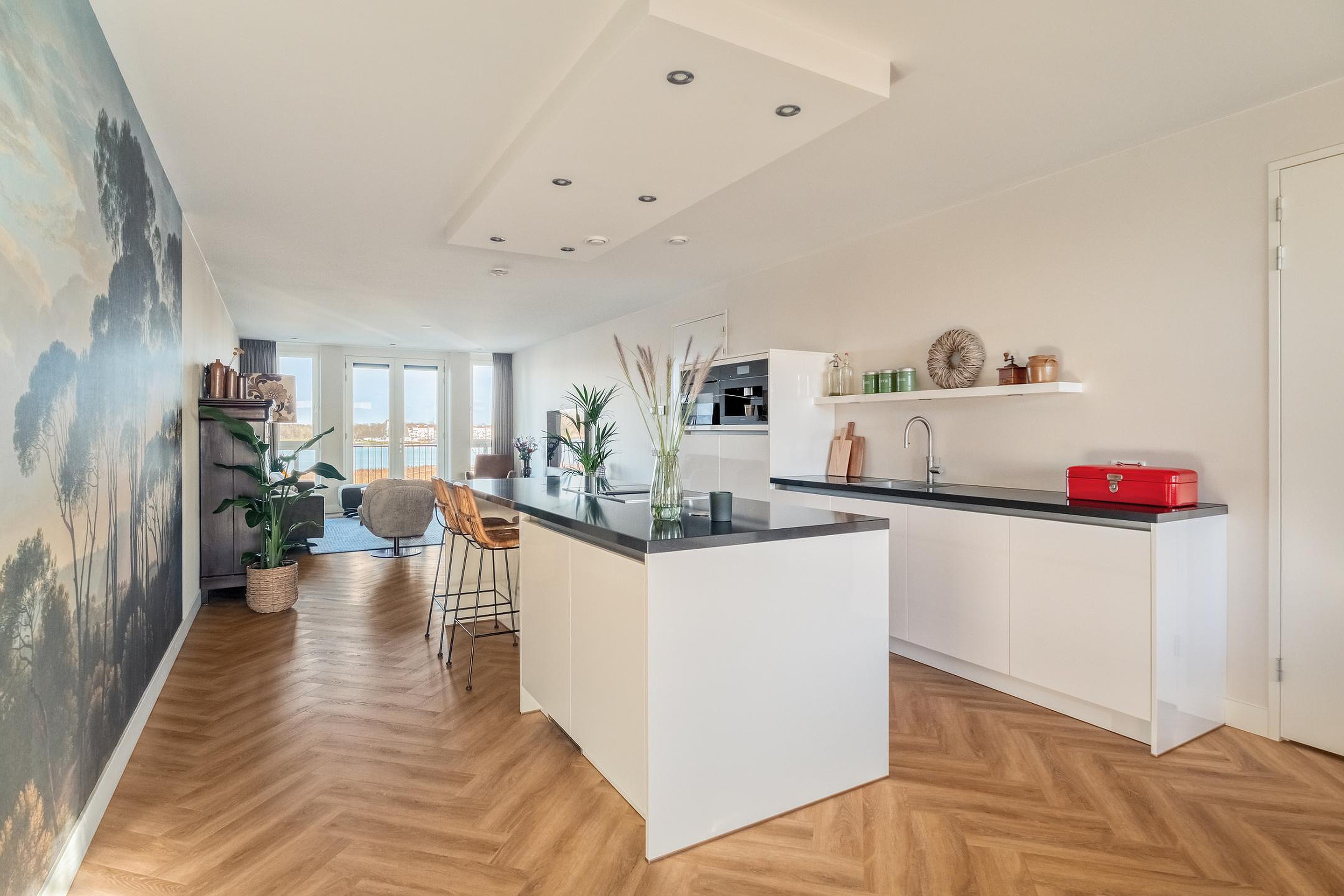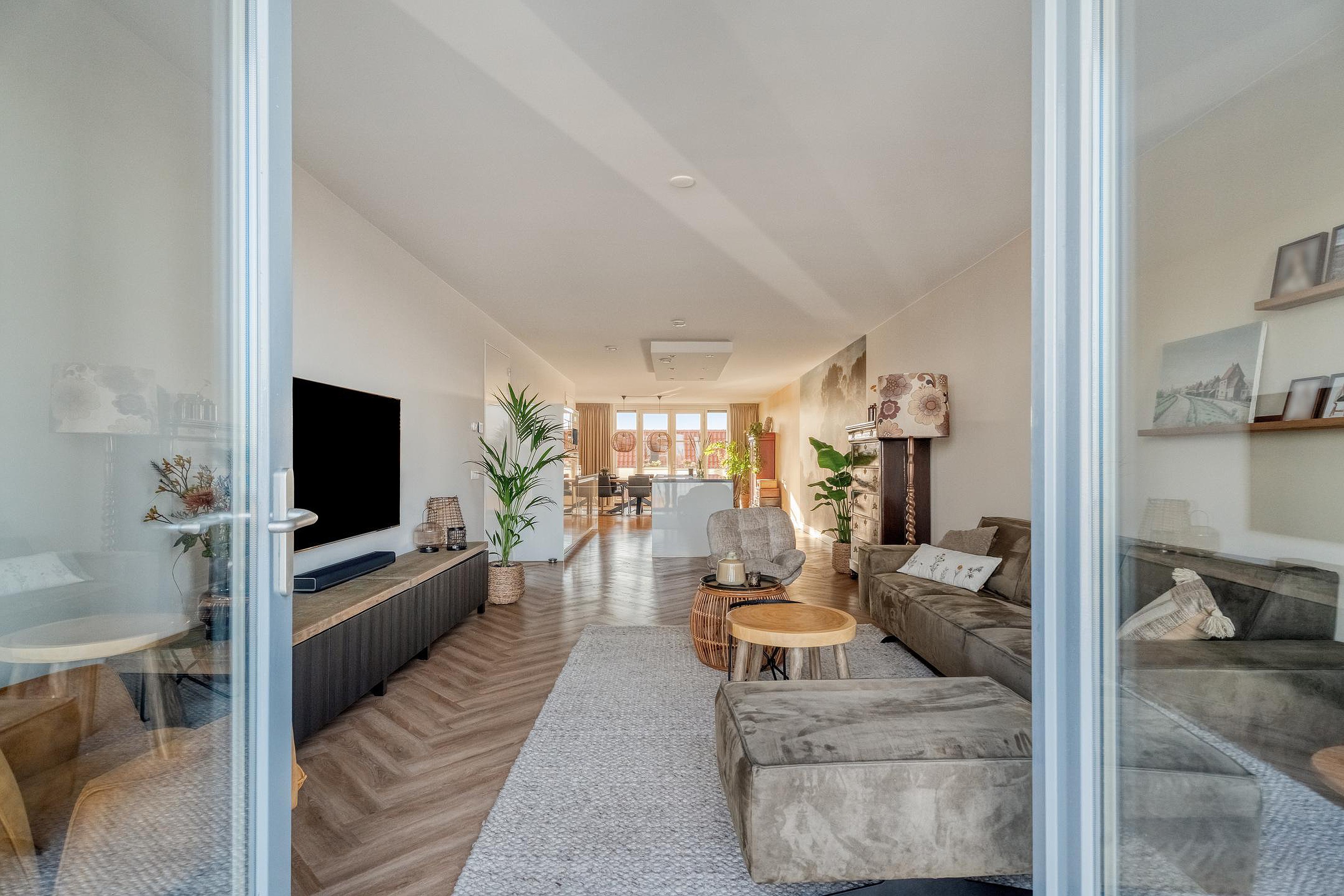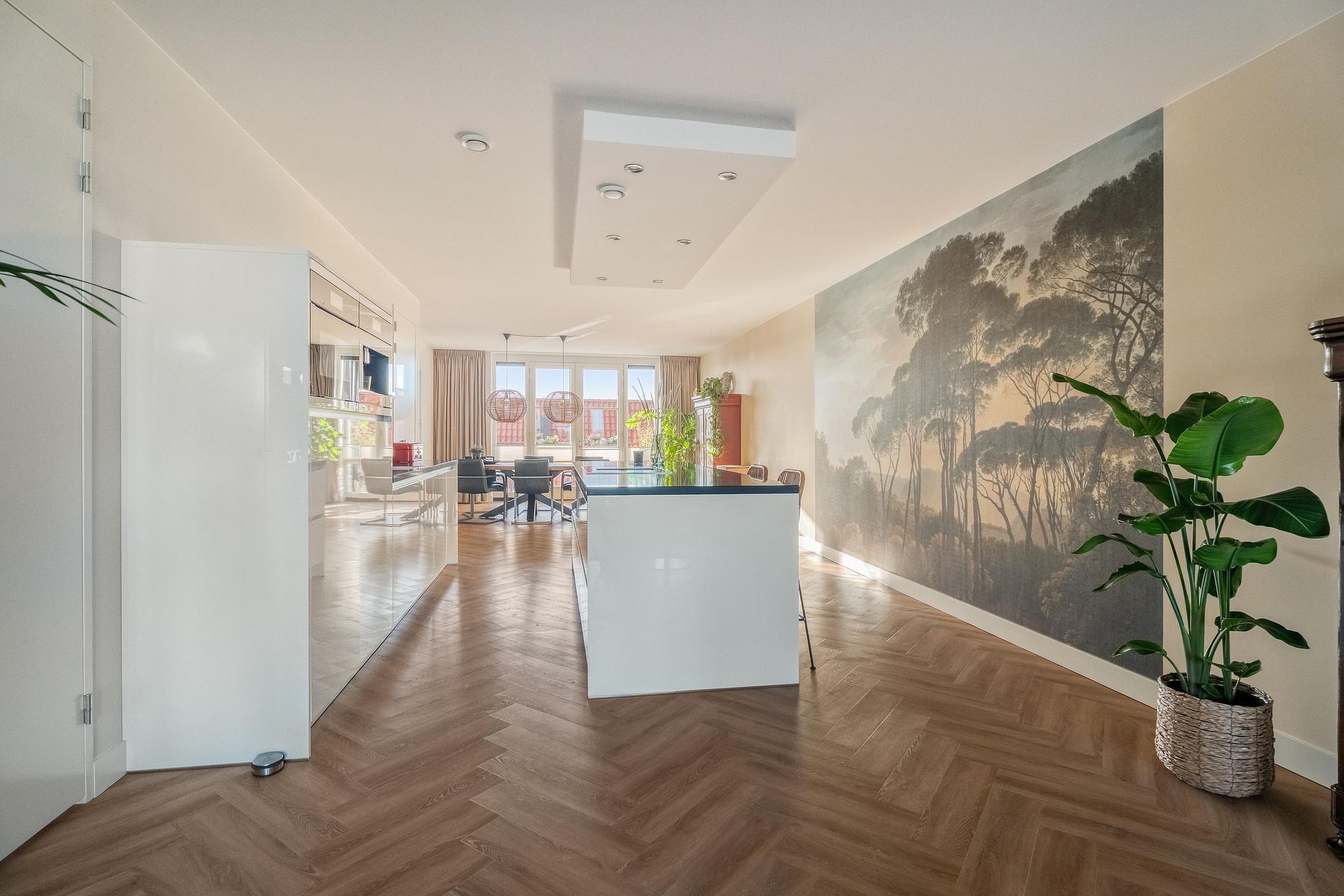 Binnen is de indeling logisch en prettig. De woonruimte loopt over de volledige lengte van het appartement en wordt op natuurlijke wijze verbonden door het kookeiland in het midden. Aan de ene zijde de woonkamer, ruim en ontspannen, aan de andere zijde de eetruimte waar lange diners vanzelf ontstaan. Alles klopt hier. De hoogwaardige afwerking met een PVC visgraatvloer door de hele woning en strak afgewerkte plafonds geeft het appartement een rustige, luxe uitstraling.