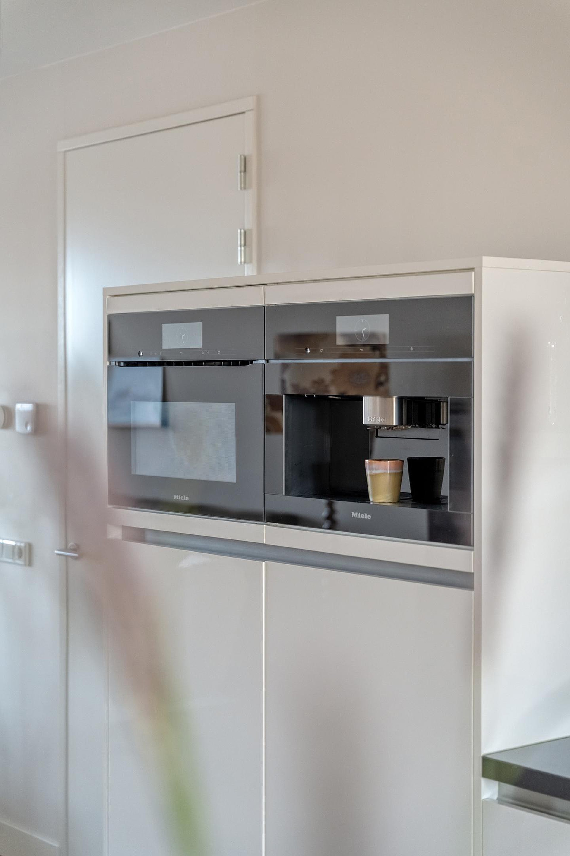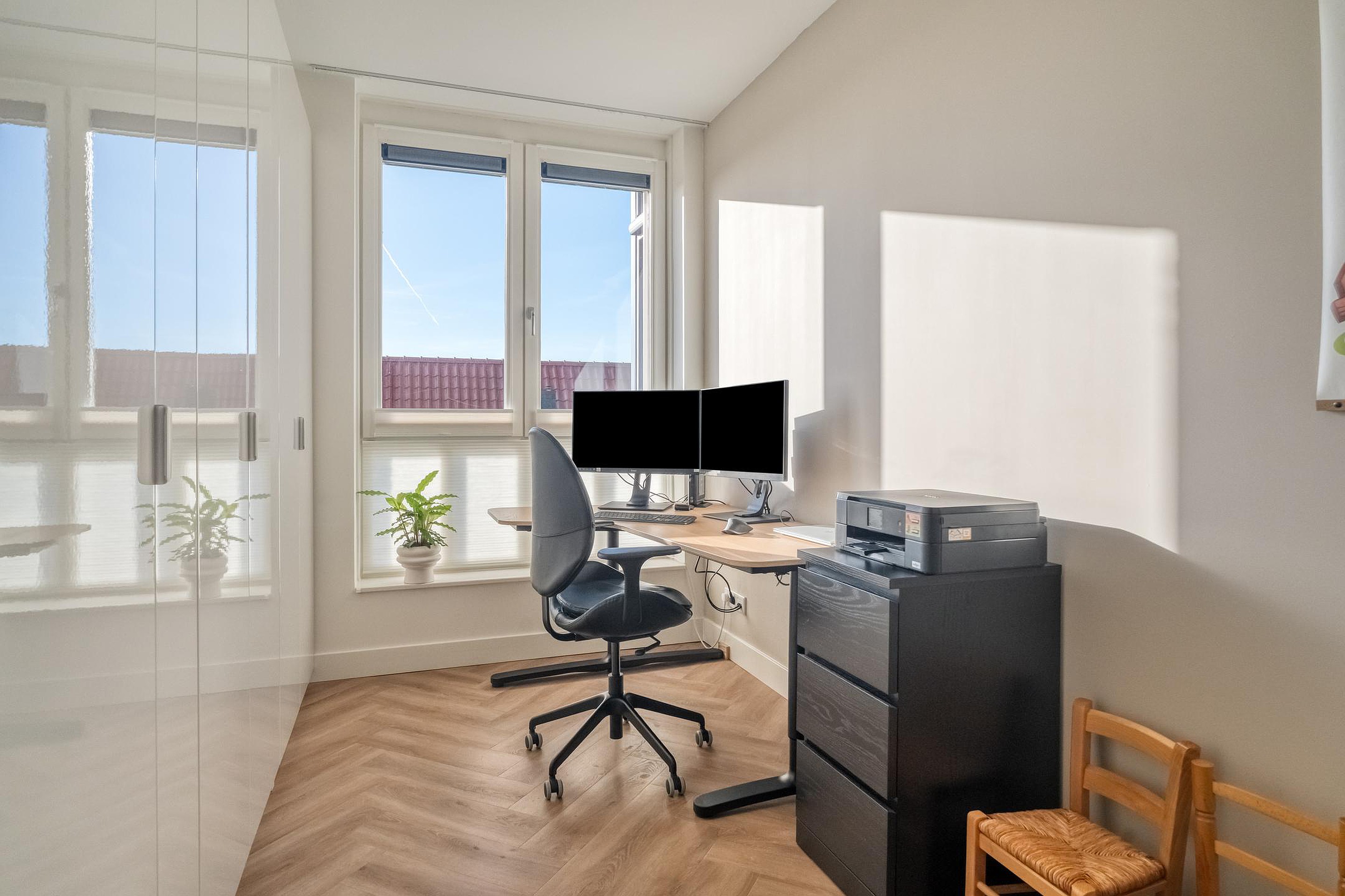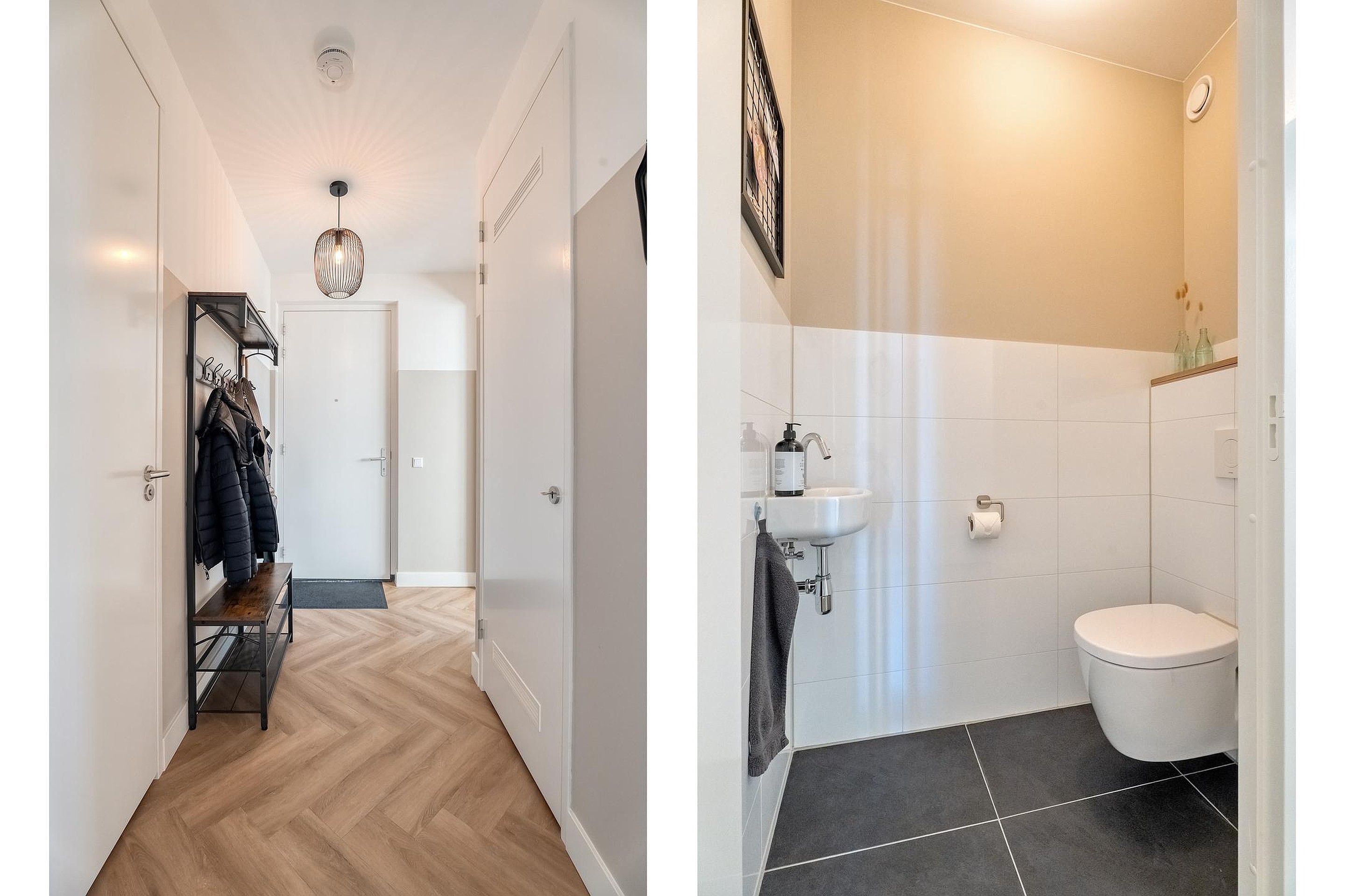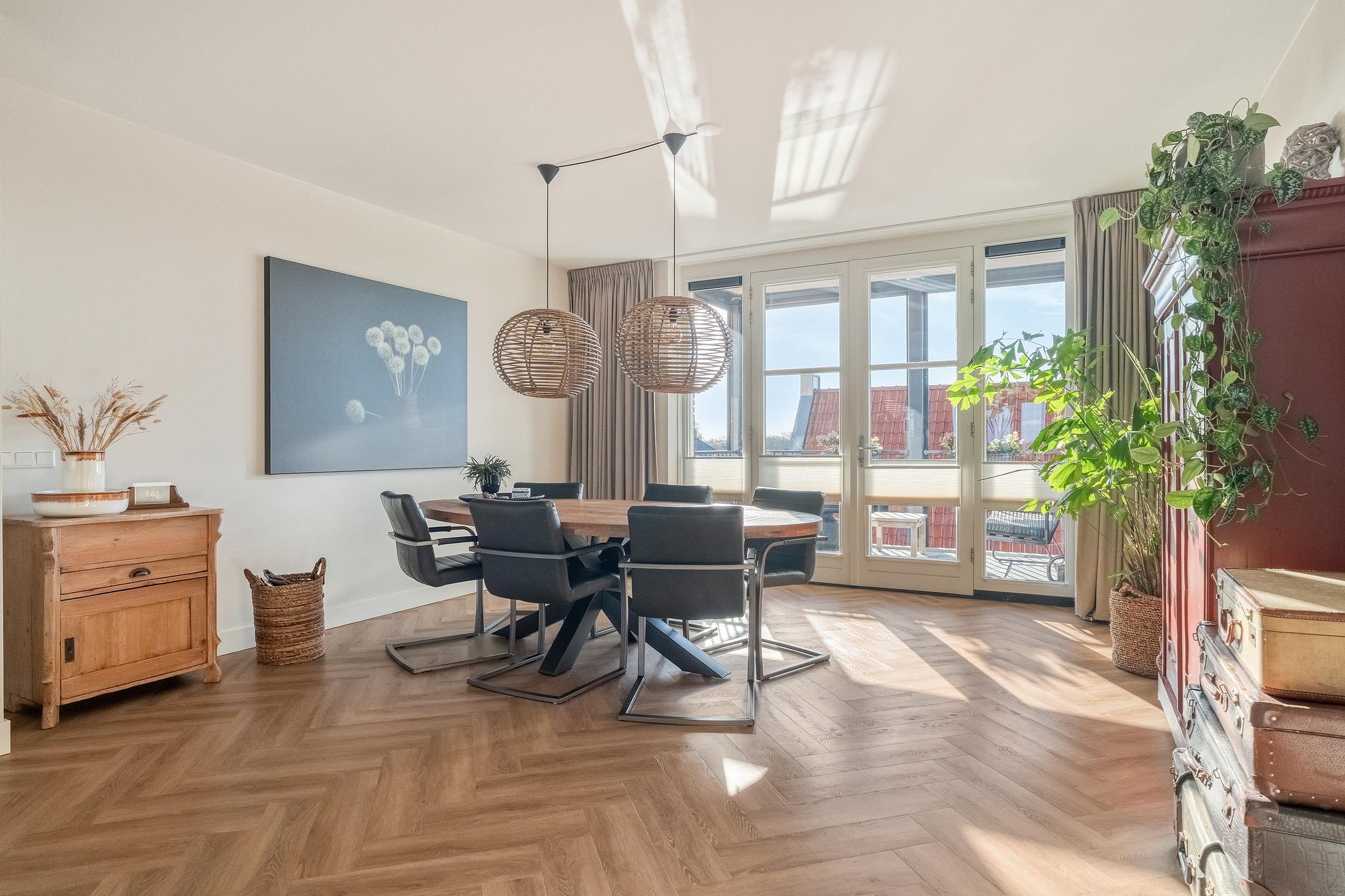 Binnen is de indeling logisch en prettig. De woonruimte loopt over de volledige lengte van het appartement en wordt op natuurlijke wijze verbonden door het kookeiland in het midden. Aan de ene zijde de woonkamer, ruim en ontspannen, aan de andere zijde de eetruimte waar lange diners vanzelf ontstaan. Alles klopt hier. De hoogwaardige afwerking met een PVC visgraatvloer door de hele woning en strak afgewerkte plafonds geeft het appartement een rustige, luxe uitstraling.