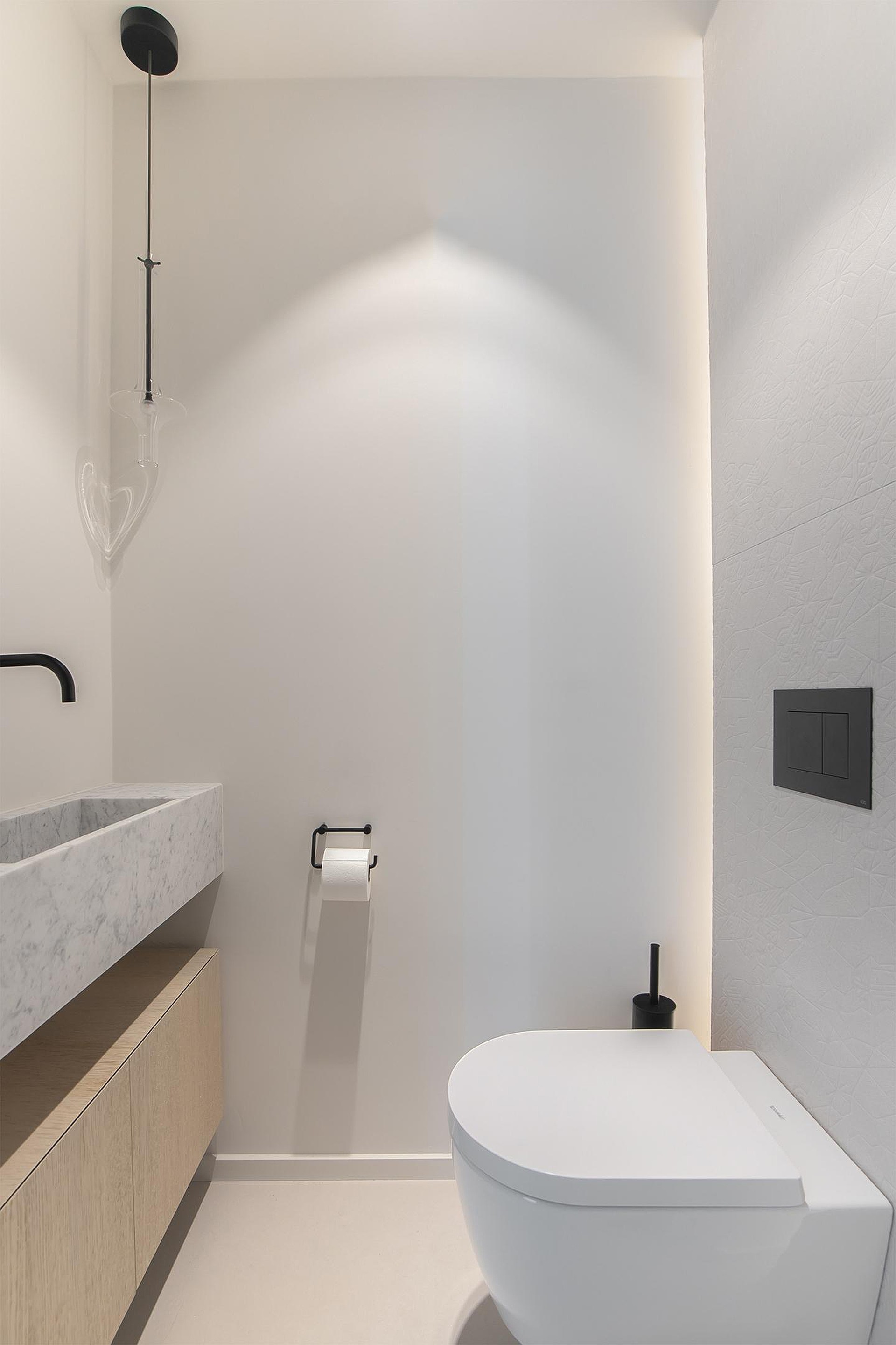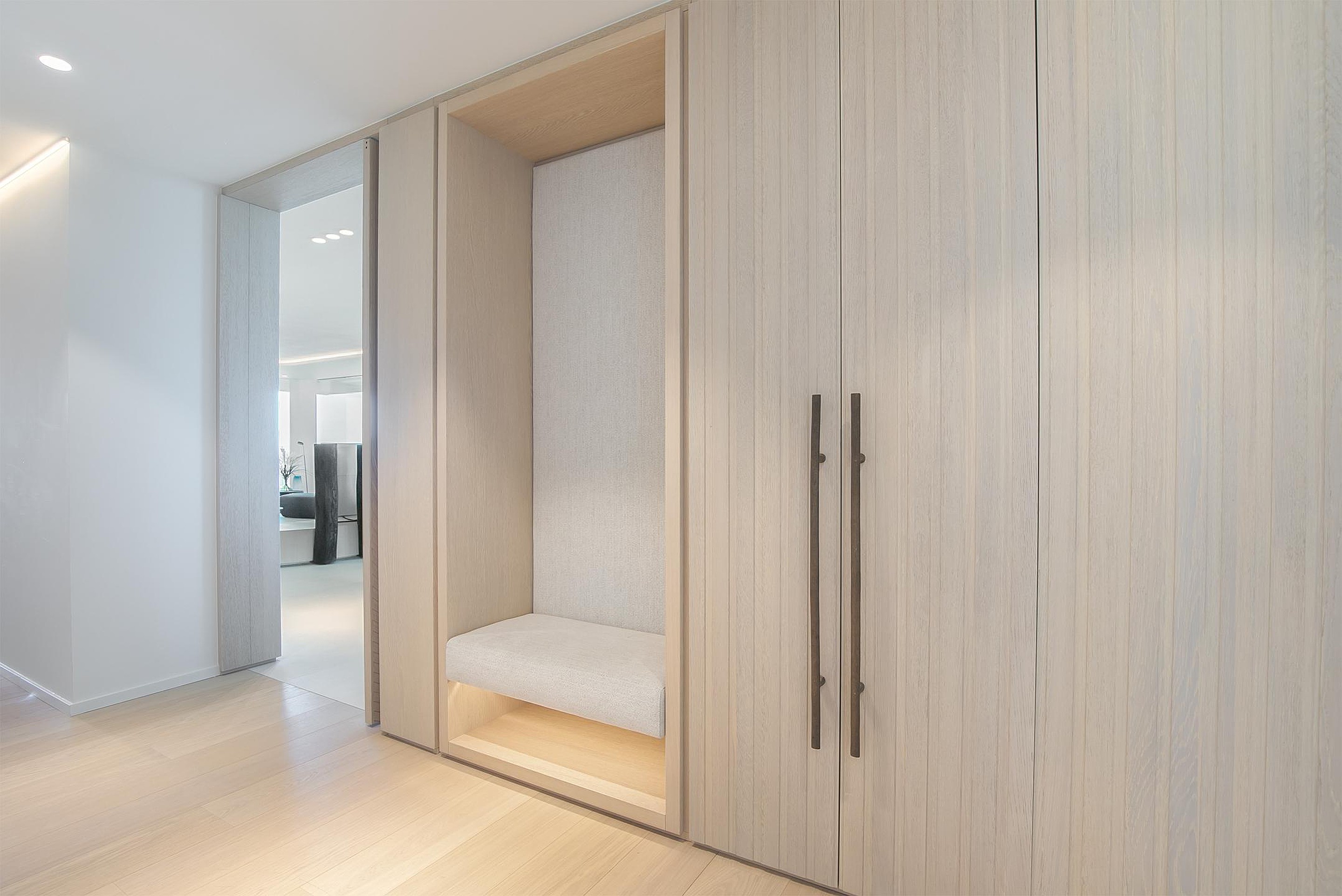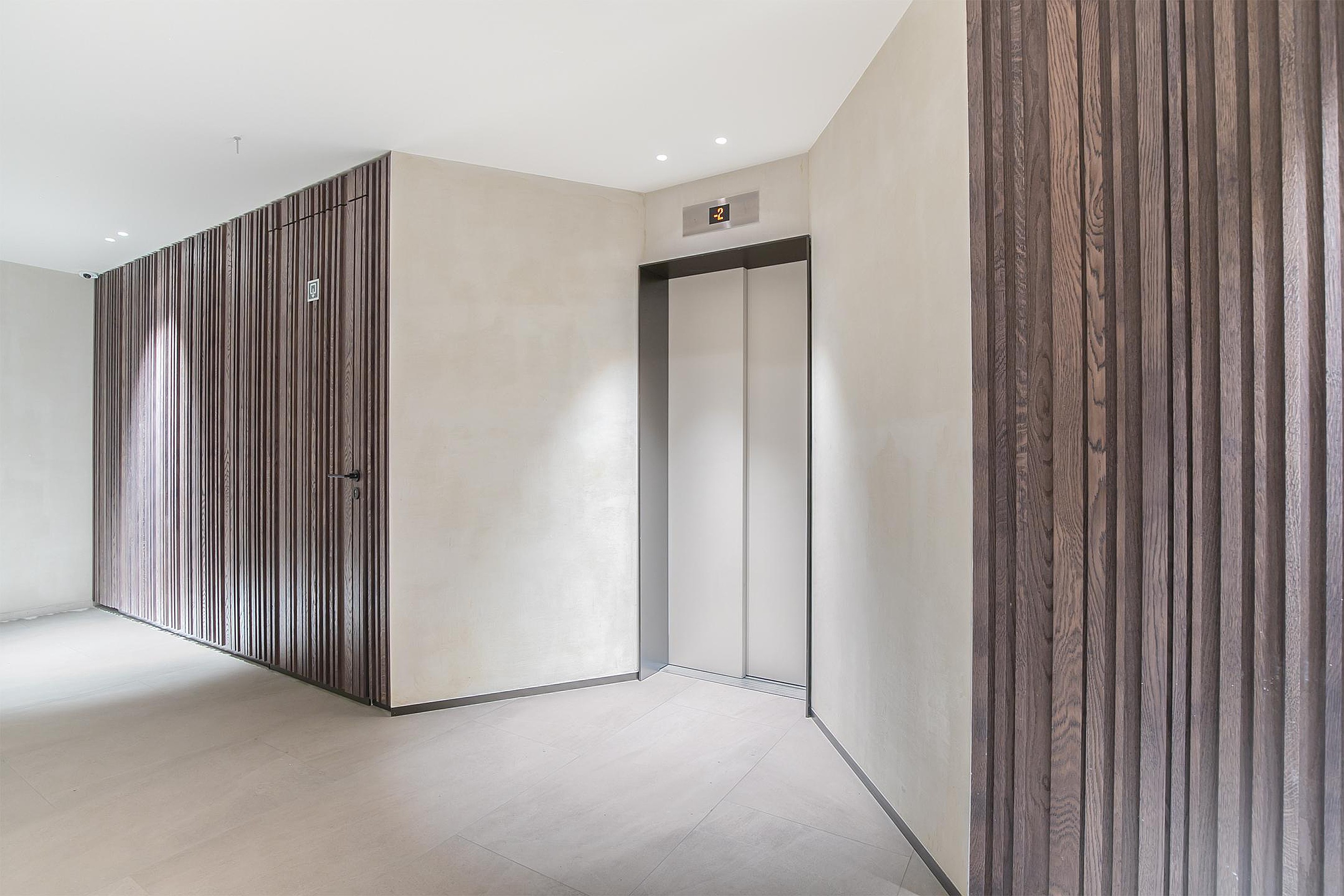 Na de brievenbus te hebben gevonden in een luxe ontvangsthal is het appartement per lift te bereiken. Vervolgens kom je binnen op een lichte hal waar de strakke en luxe afwerking van het appartement reeds zichtbaar is. Op de vloer siert een lichte parketvloer waarbij de hal linksaf langs het toilet en de wasruimte naar de masterbedroom leidt.