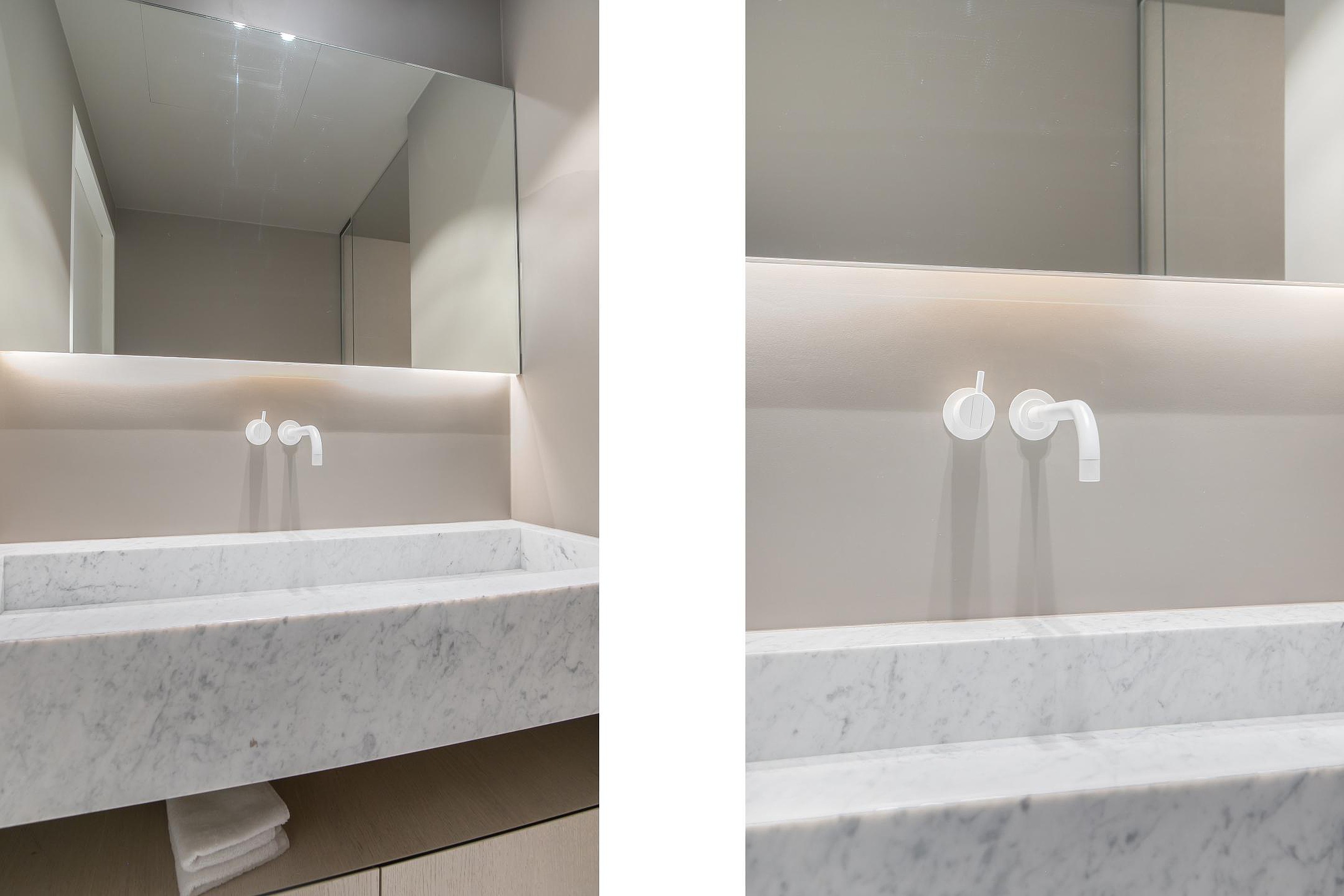 Hier vind je zowel een riant vrijstaand ligbad, als een ruime inloopdouche samen met een rechthoekige tweepersoons wastafel met spiegel. Dit alles is omringd door strakke grijze wanden waarbij de LED verlichting in de randen langs het plafond is verwerkt.