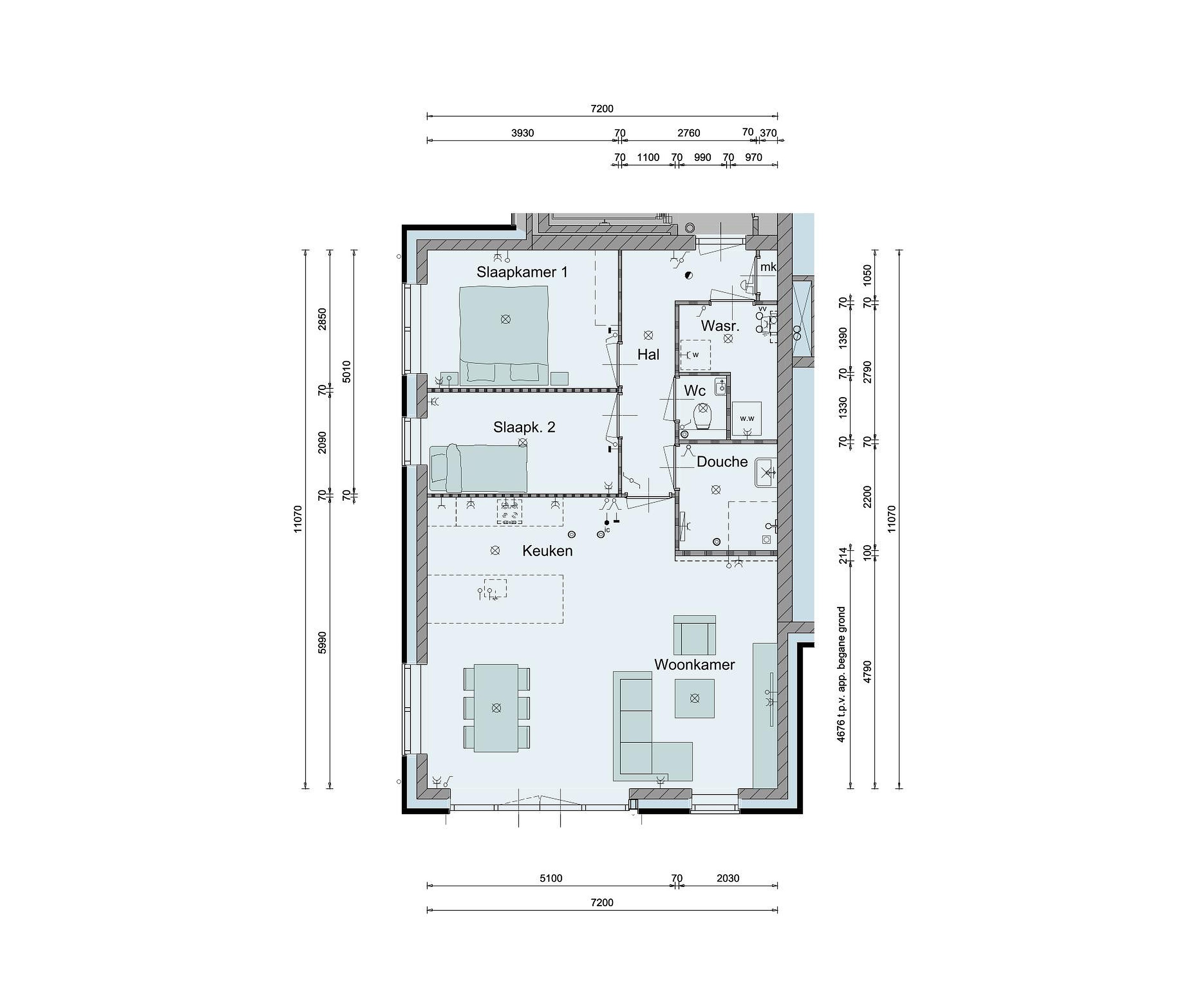 Begane grond In de entree van het complex bevinden zich de postkasten, de lift en het trappenhuis. Van type A zijn twee appartementen beschikbaar. Beide zijn het hoekwoningen. Het ene appartement ligt op de begane grond en heeft een garage. Het andere ligt op de eerste verdieping met een berging. Het appartement op de begane grond beschikt over een terras en dat op de verdieping over een balkon. Het appartement op de verdieping bereikt u via trap of lift en een galerij. De woonkamer biedt plaats aan een zithoek en een eethoek. Door de hoekligging hebben beide woningen een extra raam. De open keuken is gericht naar de kamer en heeft een baropstelling. Het appartement heeft twee slaapkamers. Ze liggen naast elkaar. De badkamer is voorzien van douche en wastafel. Het toilet vindt u in de hal. In de wasruimte bevinden zich aansluitingen voor een witgoedopstelling.
