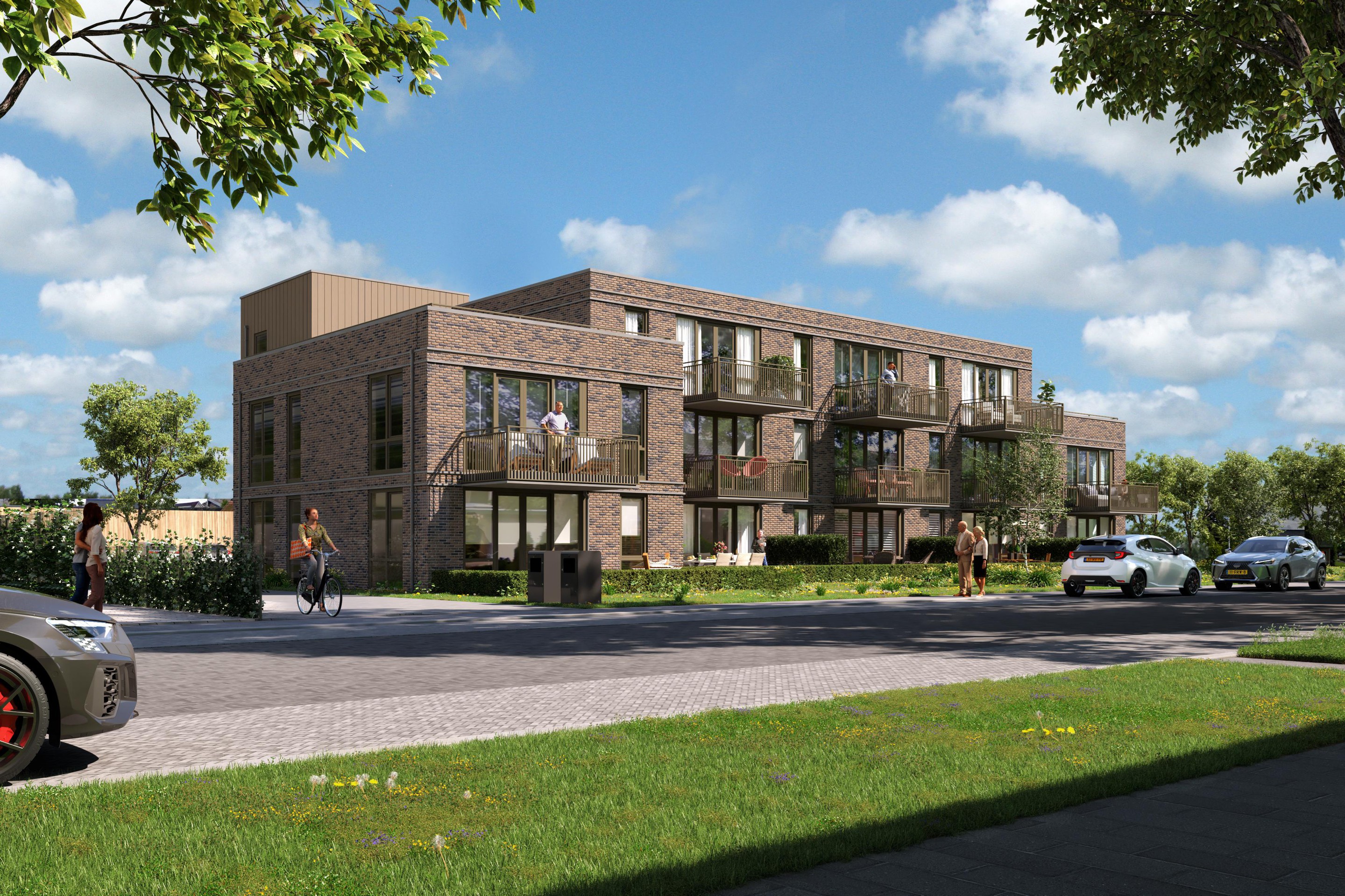 - Het complex wordt uitgevoerd in beigegeel genuanceerde baksteen, met onderhoudsarme gevelbekleding van vezelcementplanken in kleikleur met achterisolatie;