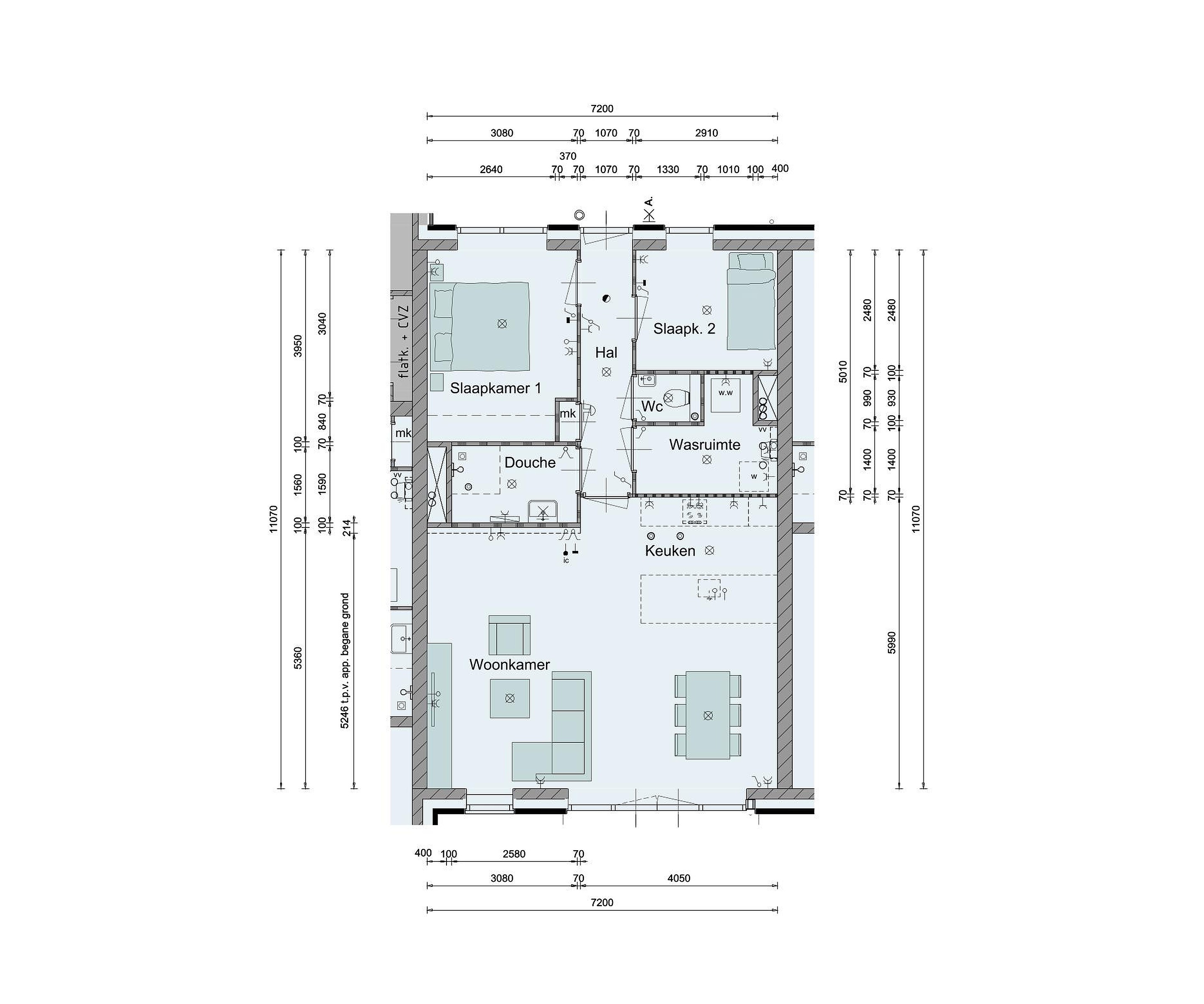 - De appartementen worden standaard opgeleverd zonder keuken en inclusief sanitair en tegelwerk (toilet en fonteintje, badkamer met toilet, wastafel en douchemengkraan met toebehoren);