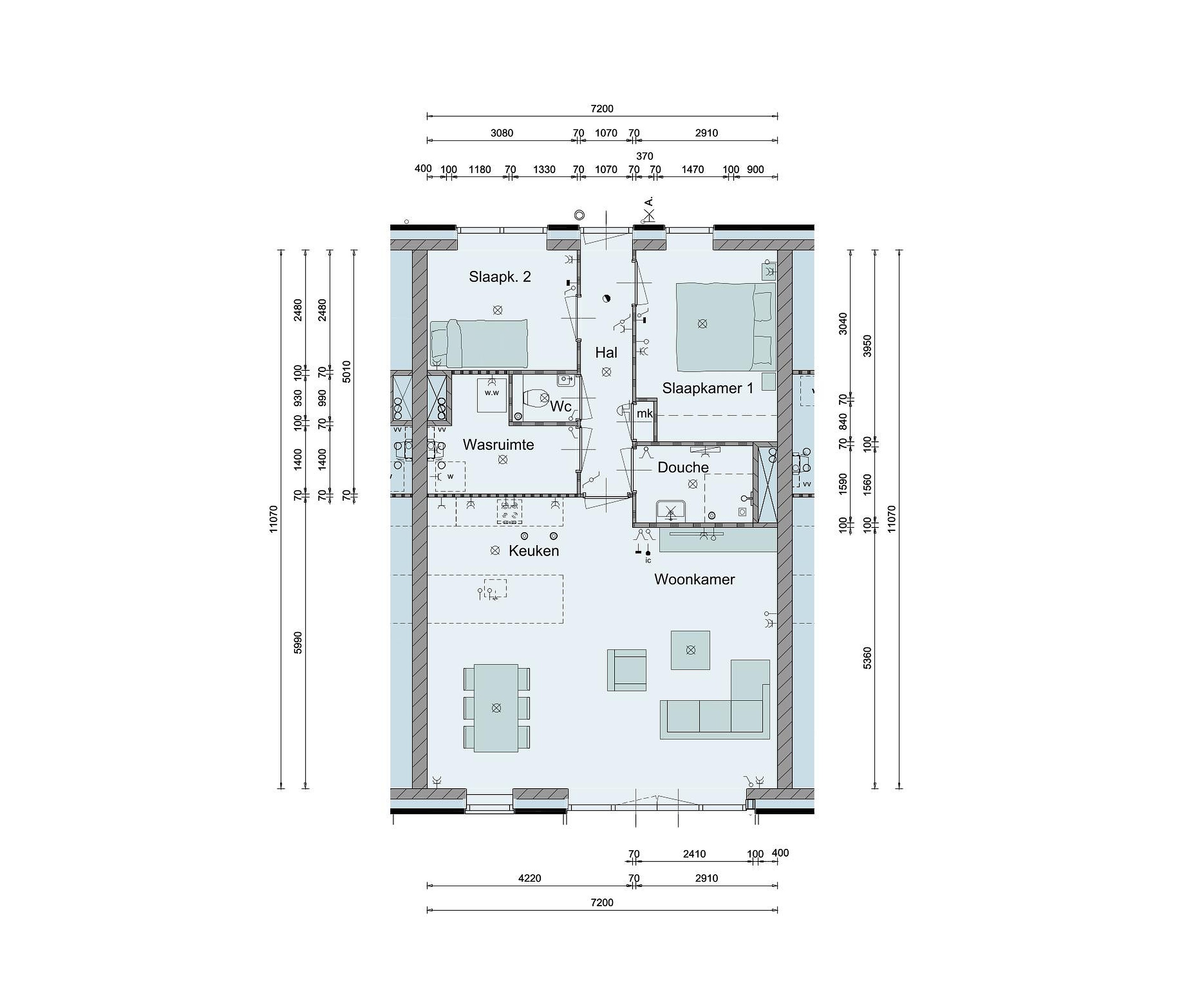 Begane grond In de entree van het complex bevinden zich de postkasten, de lift en het trappenhuis. Van type C is één appartement beschikbaar. Het ligt op de eerste verdieping met op de begane grond een berging. U bereikt het via trap of lift en een galerij. De woonkamer biedt plaats aan een zithoek en een eethoek. De open keuken is gericht naar de kamer en heeft een baropstelling. Het appartement heeft twee slaapkamers. Ze liggen tegenover elkaar. De badkamer is voorzien van douche en wastafel. Het toilet vindt u in de hal. In de wasruimte bevinden zich aansluitingen voor een witgoedopstelling.