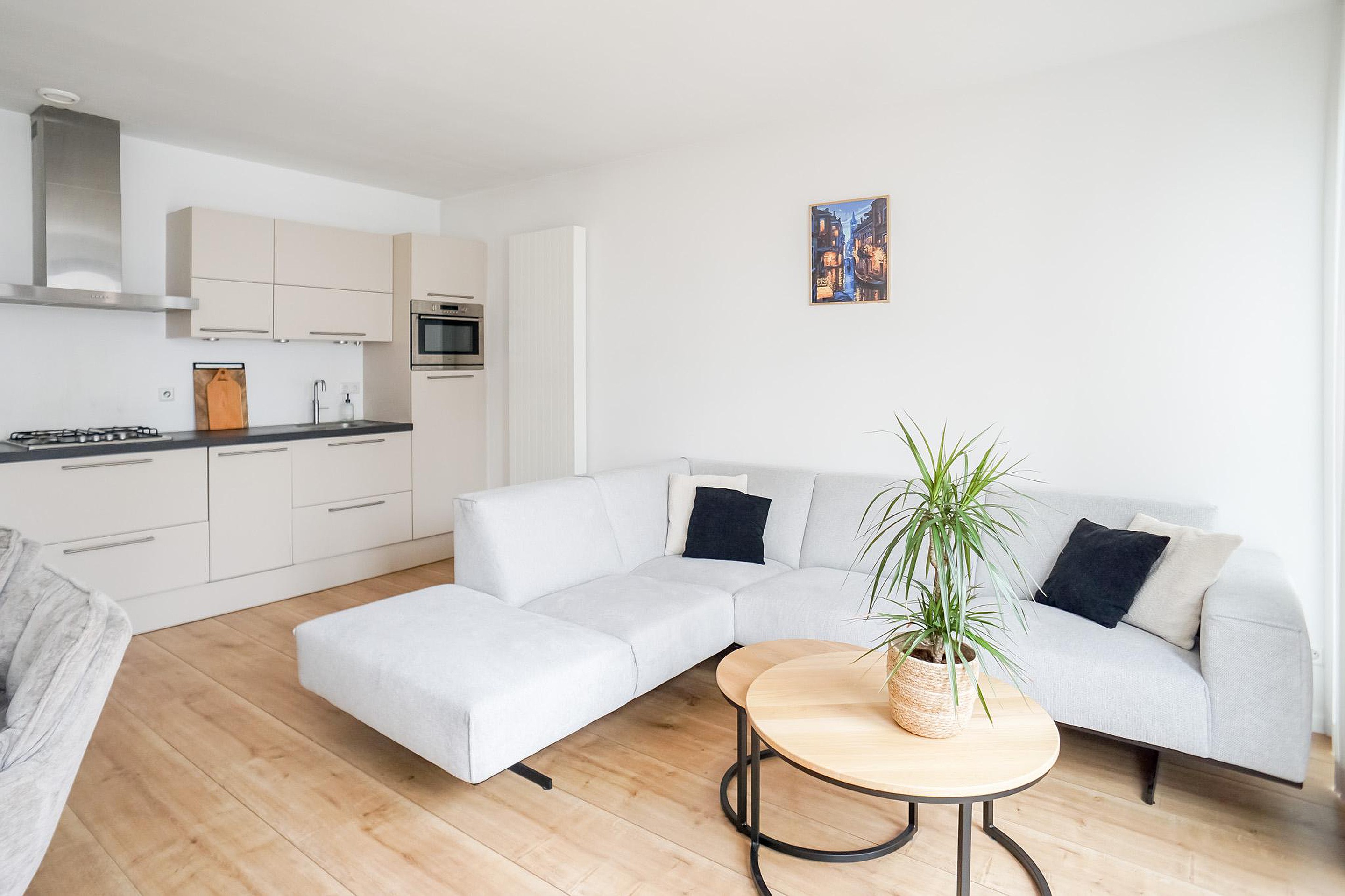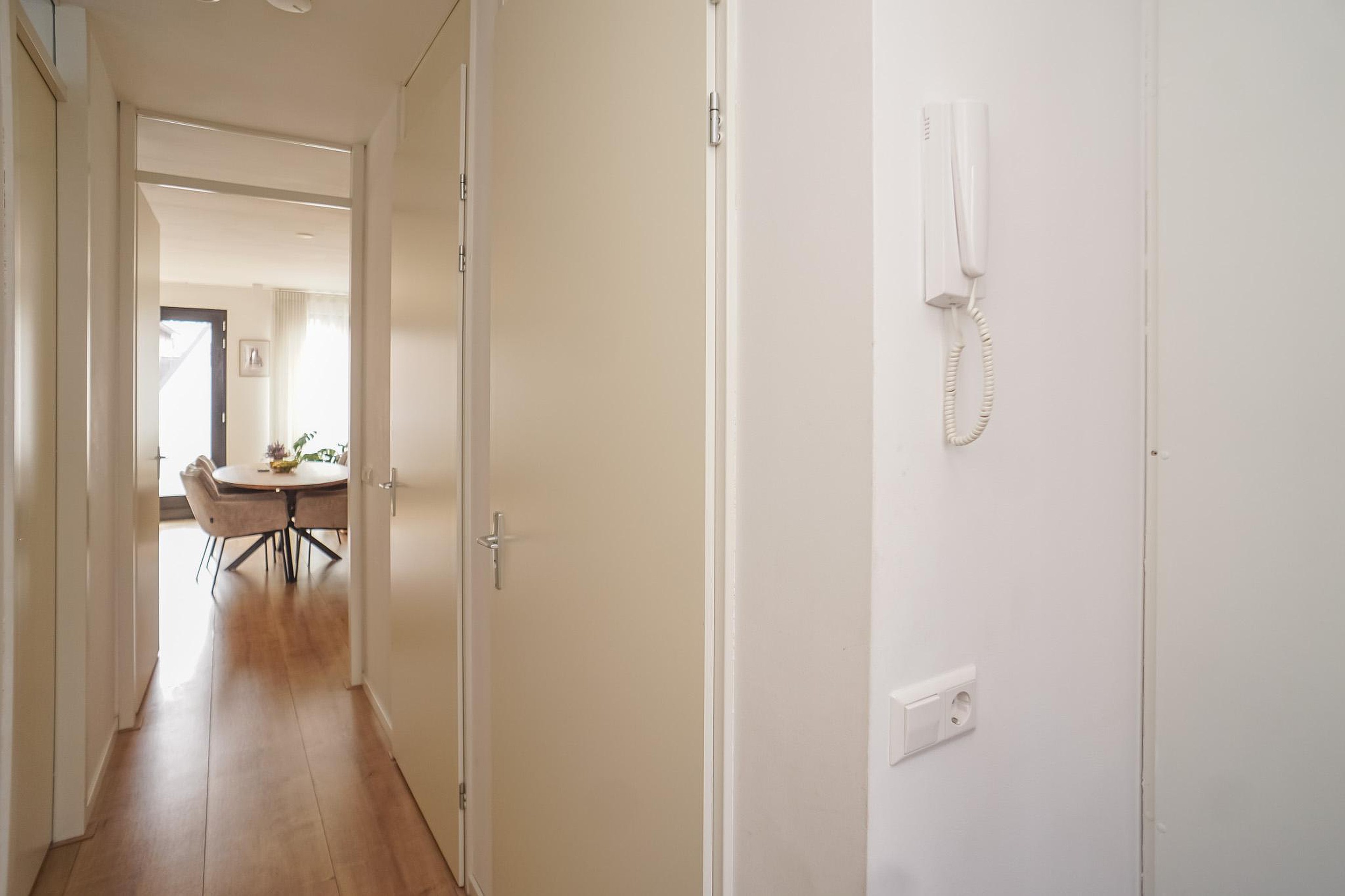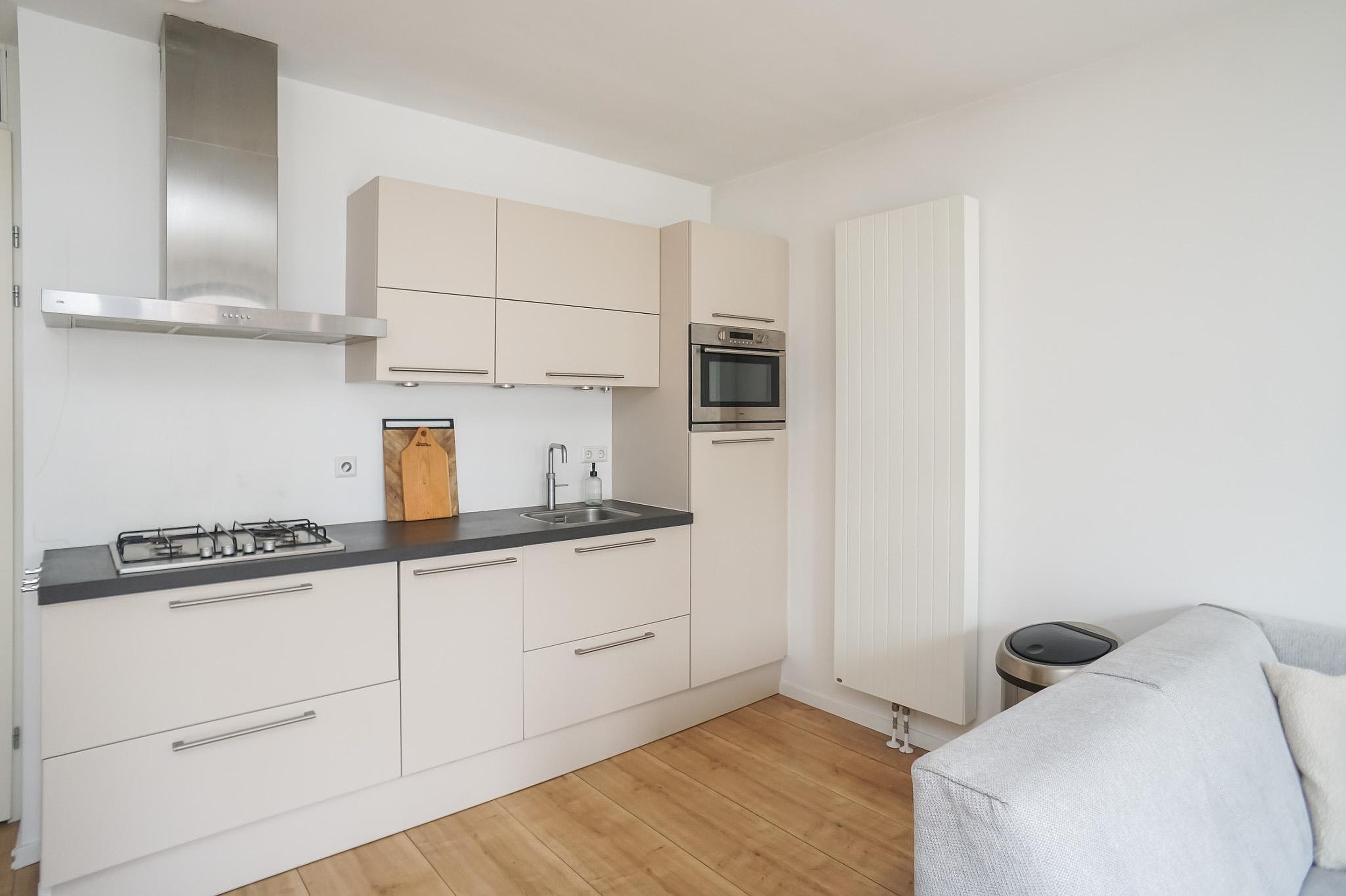 De lichte woonkamer is aan de voorzijde van het complex gelegen en beschikt over openslaande deuren met een Frans balkon, wat zorgt voor een prettige lichtinval en een gevoel van ruimte. De open keuken is modern en van alle gemakken voorzien. De slaapkamer is rustig gelegen aan de galerijzijde en biedt directe toegang tot de badkamer, welke is uitgerust met een inloopdouche en wastafelmeubel. Het toilet bevindt zich separaat in de hal.