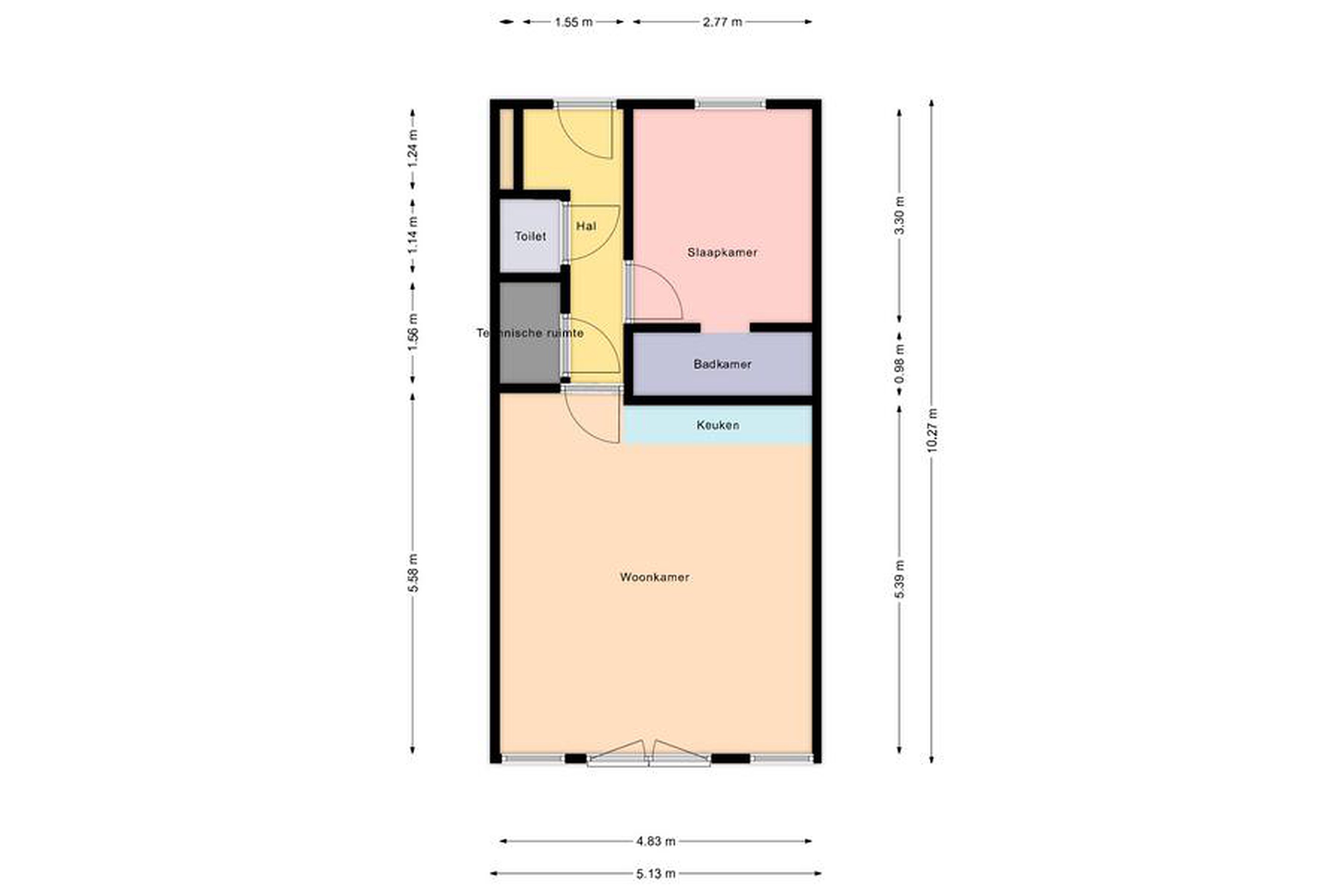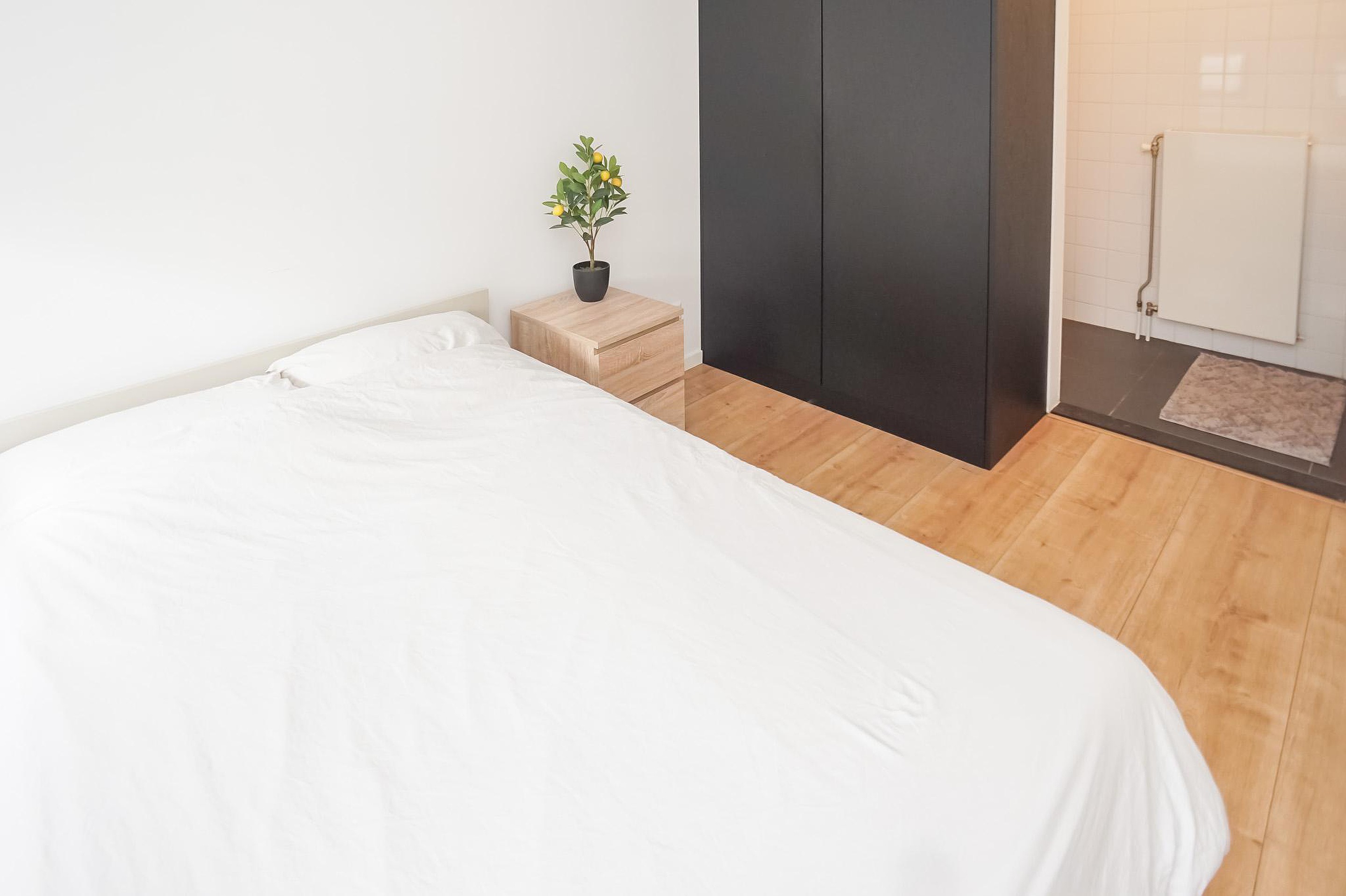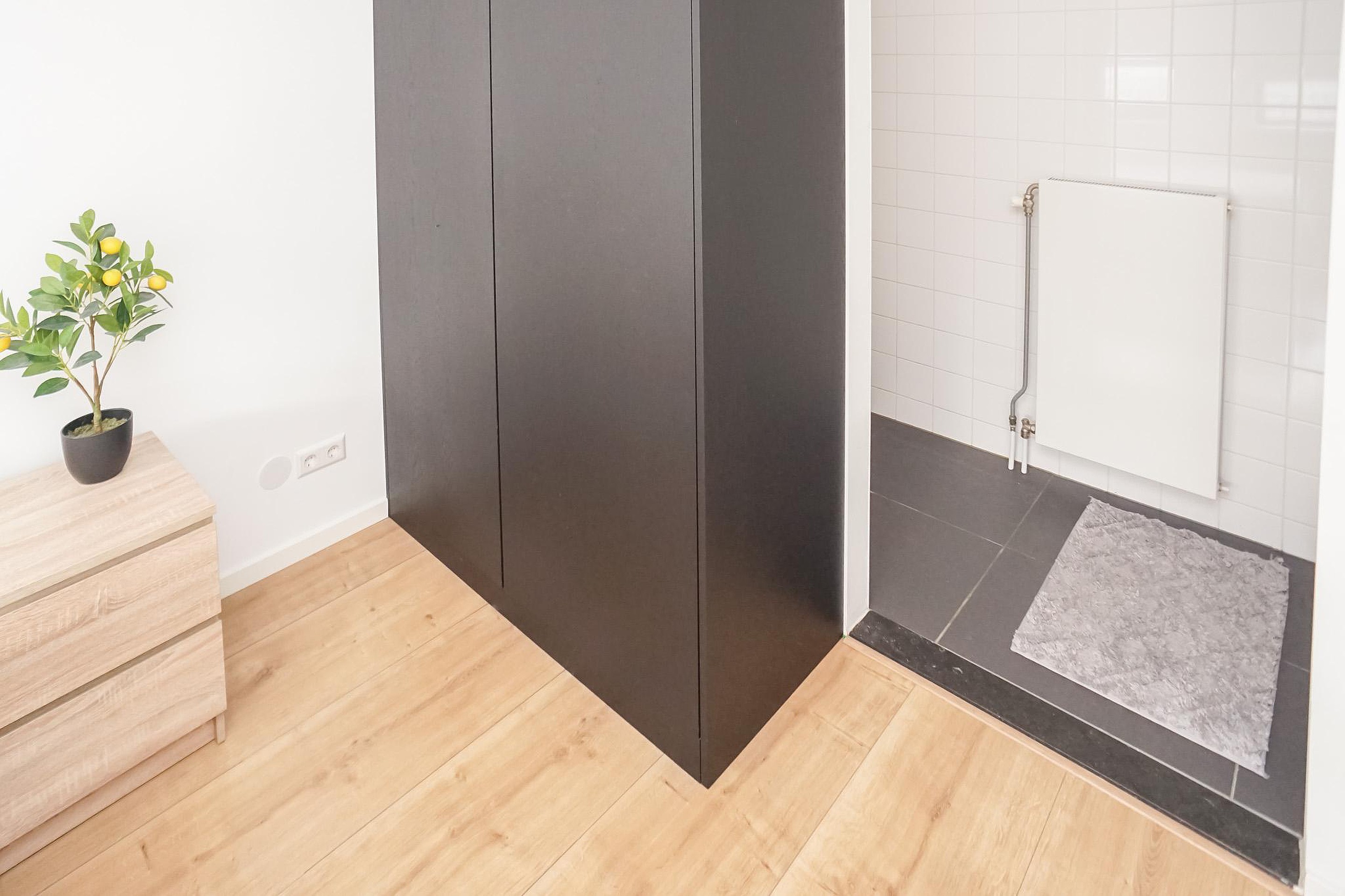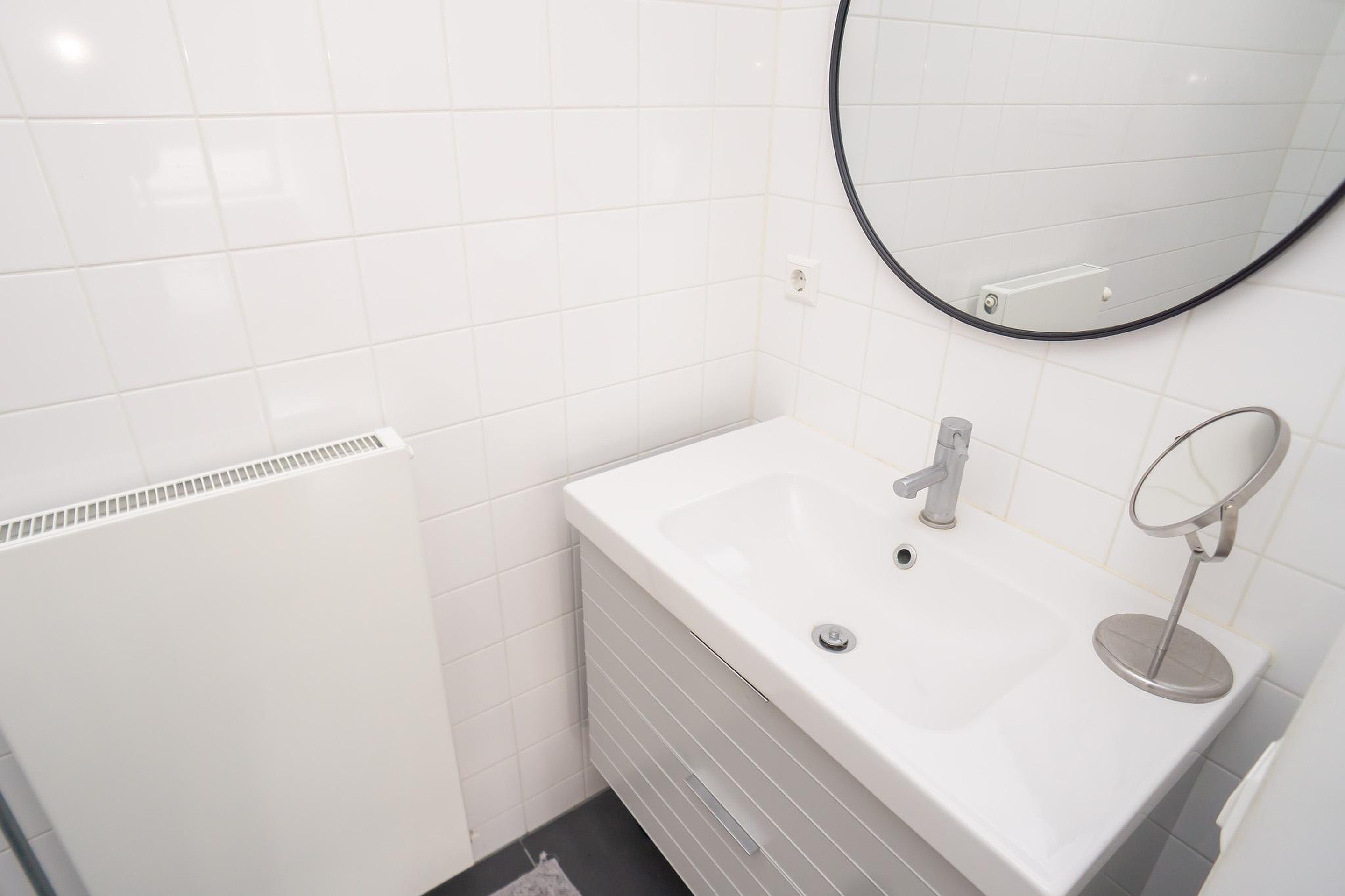 De lichte woonkamer is aan de voorzijde van het complex gelegen en beschikt over openslaande deuren met een Frans balkon, wat zorgt voor een prettige lichtinval en een gevoel van ruimte. De open keuken is modern en van alle gemakken voorzien. De slaapkamer is rustig gelegen aan de galerijzijde en biedt directe toegang tot de badkamer, welke is uitgerust met een inloopdouche en wastafelmeubel. Het toilet bevindt zich separaat in de hal.