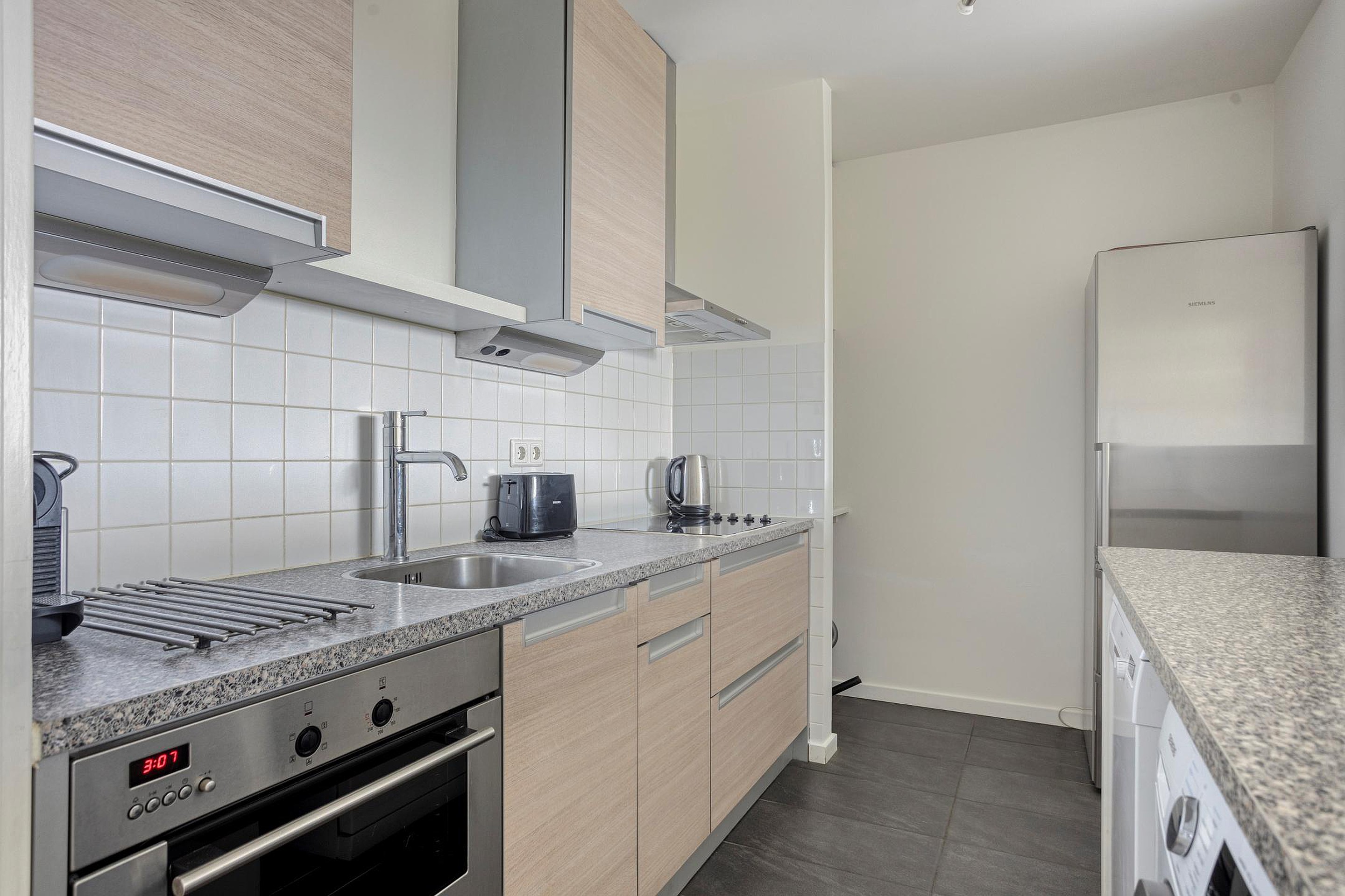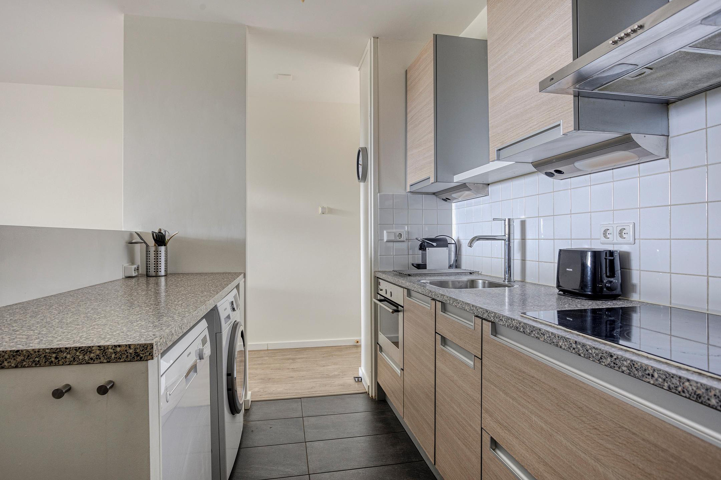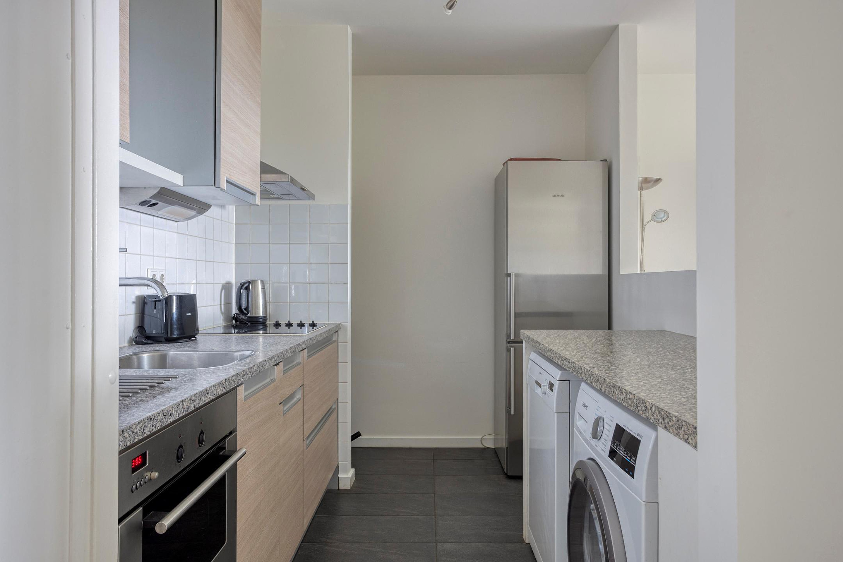 De lichte woonkamer met grote raampartijen is ruim van opzet en beschikt over een semi-open keuken. De keuken is voorzien van een kookplaat, oven en voldoende opbergruimte.