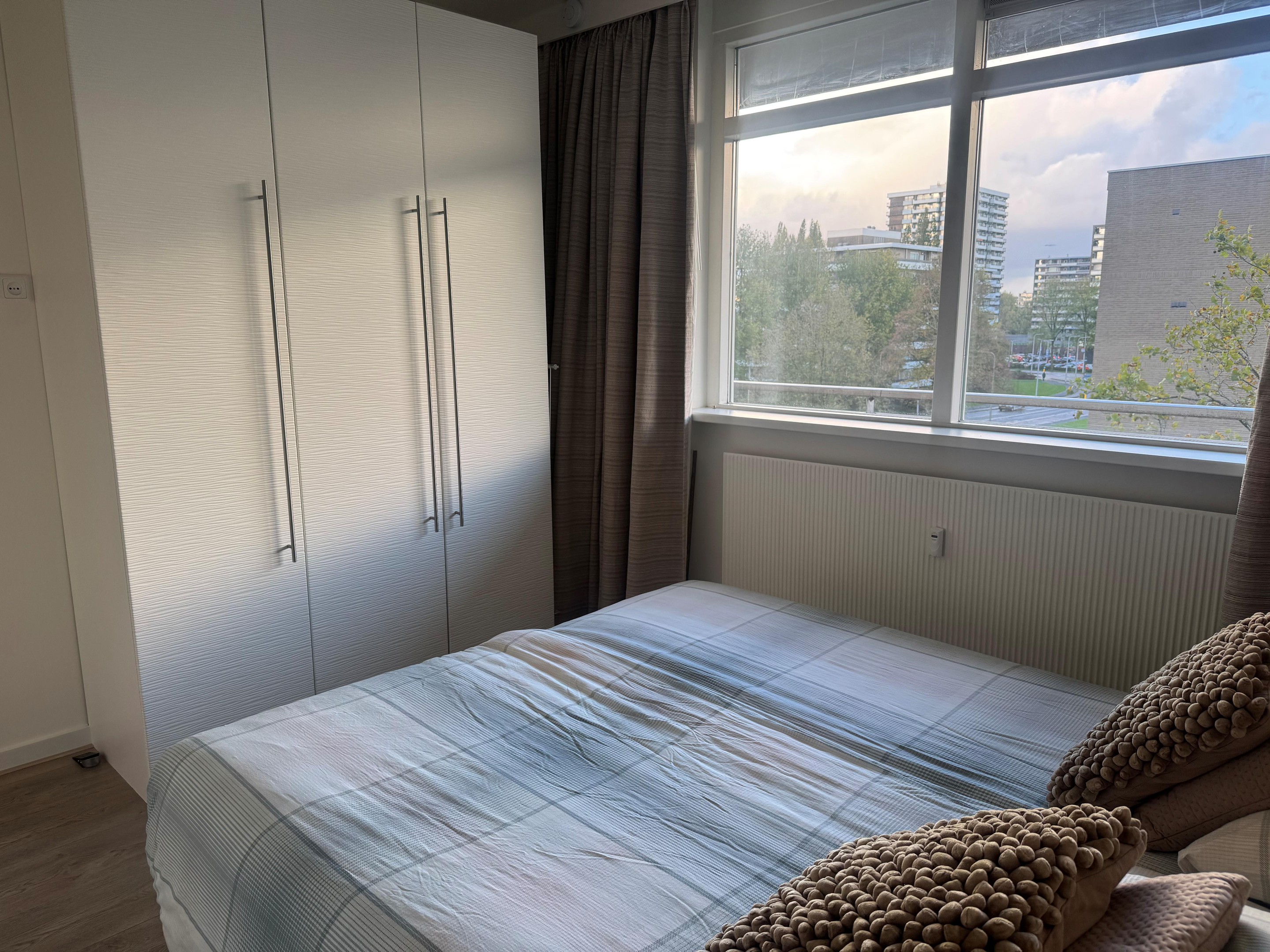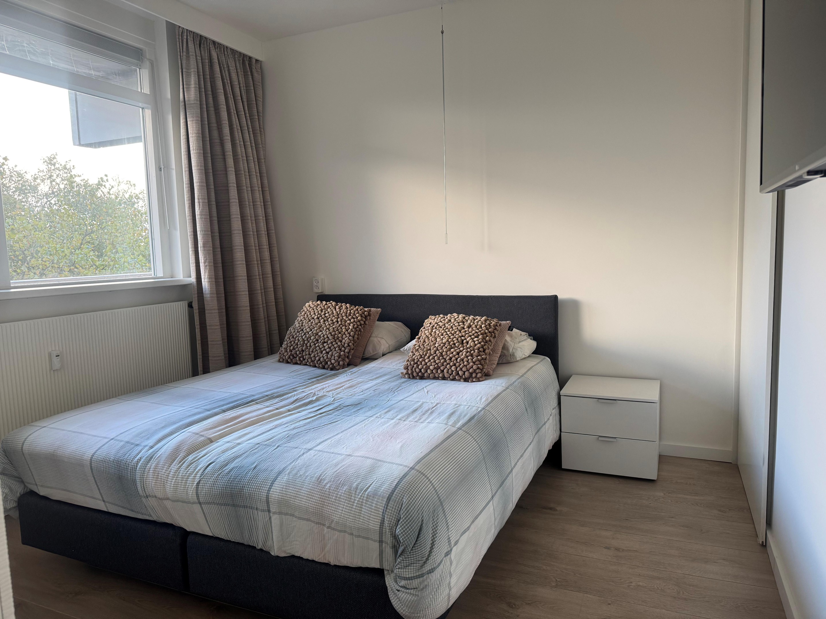 De slaapkamer, gelegen aan de voorzijde van het appartement, biedt voldoende ruimte voor een tweepersoonsbed en een kast.