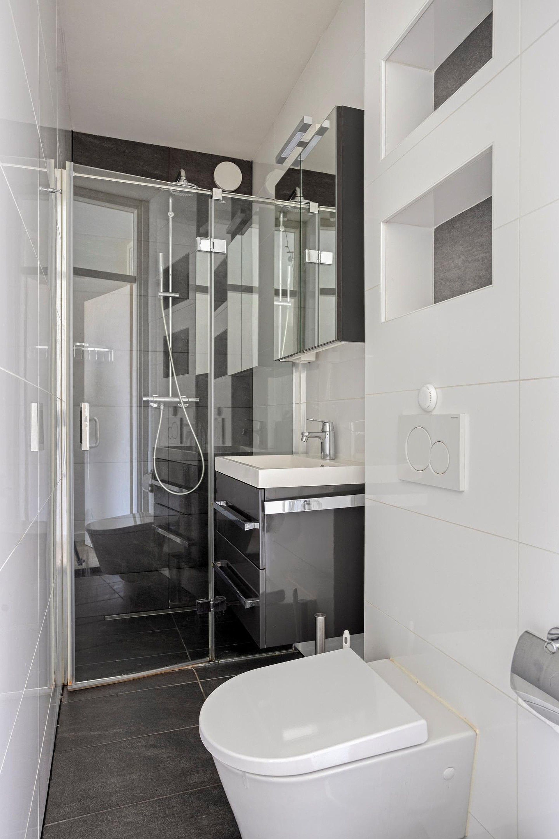 The bathroom features a shower, washbasin, and toilet.