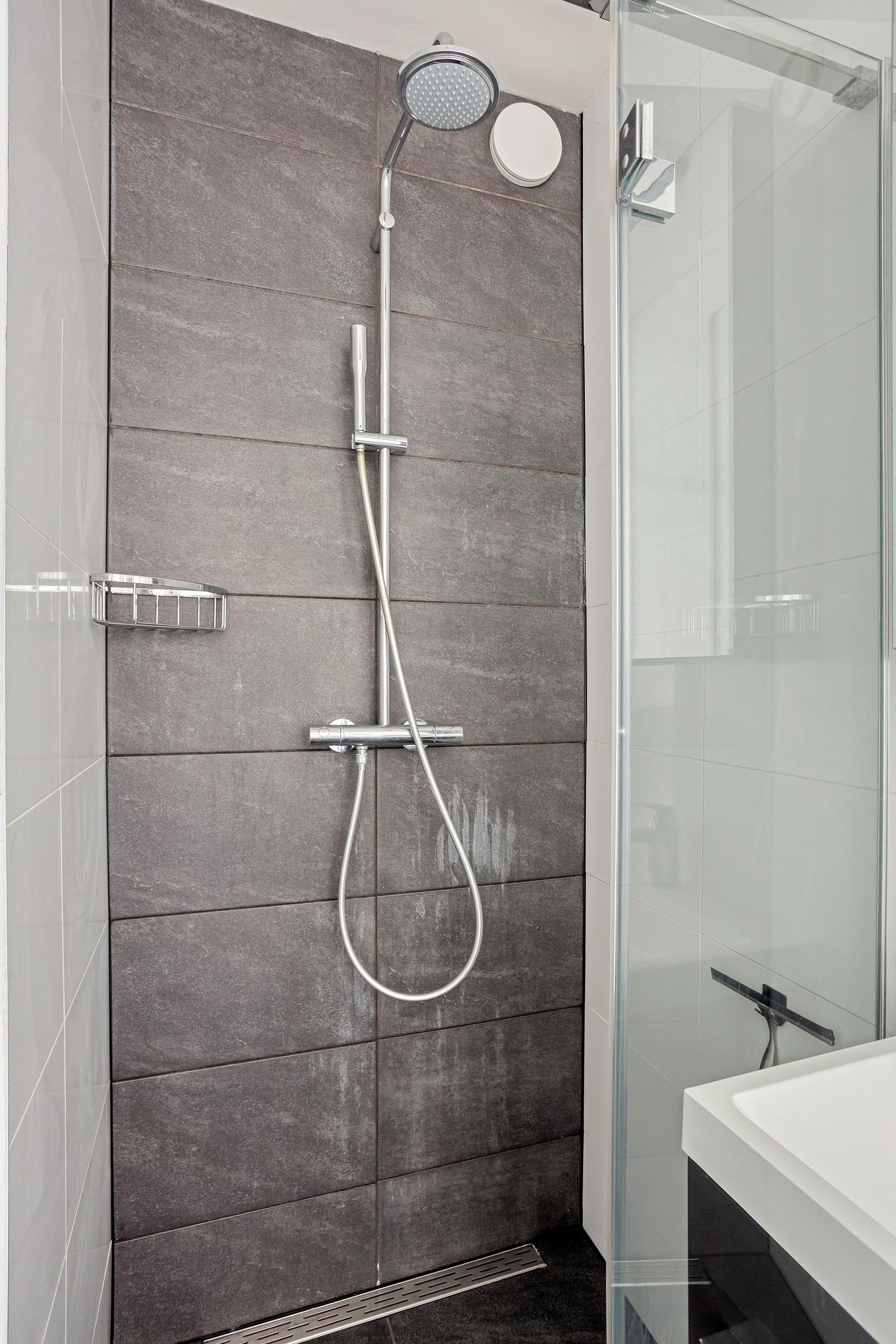 De badkamer beschikt over een douche, wastafel en toilet.