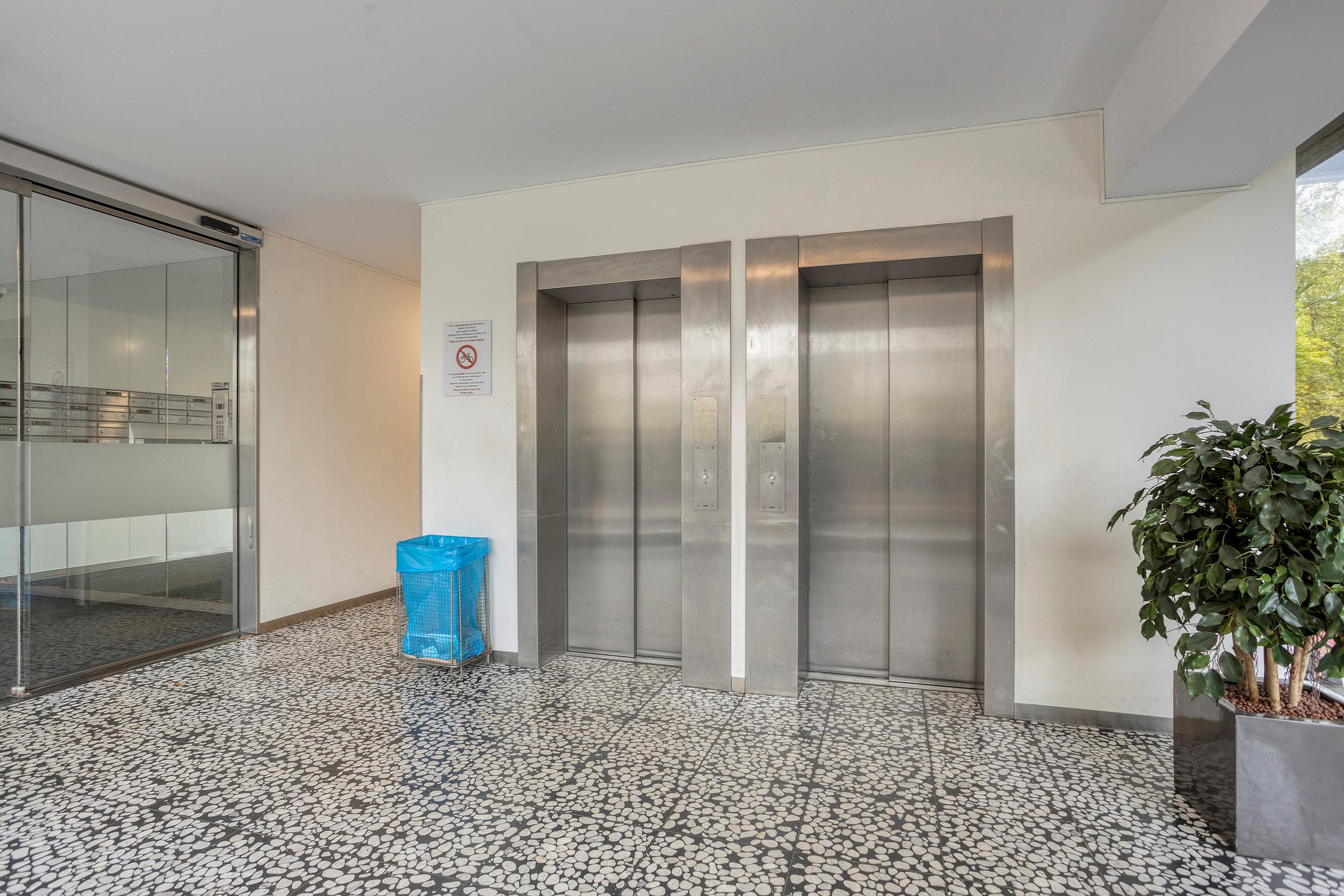 Centrale entree op de begane grond met brievenbussen, bellentableau, lift en trappenhuis.
