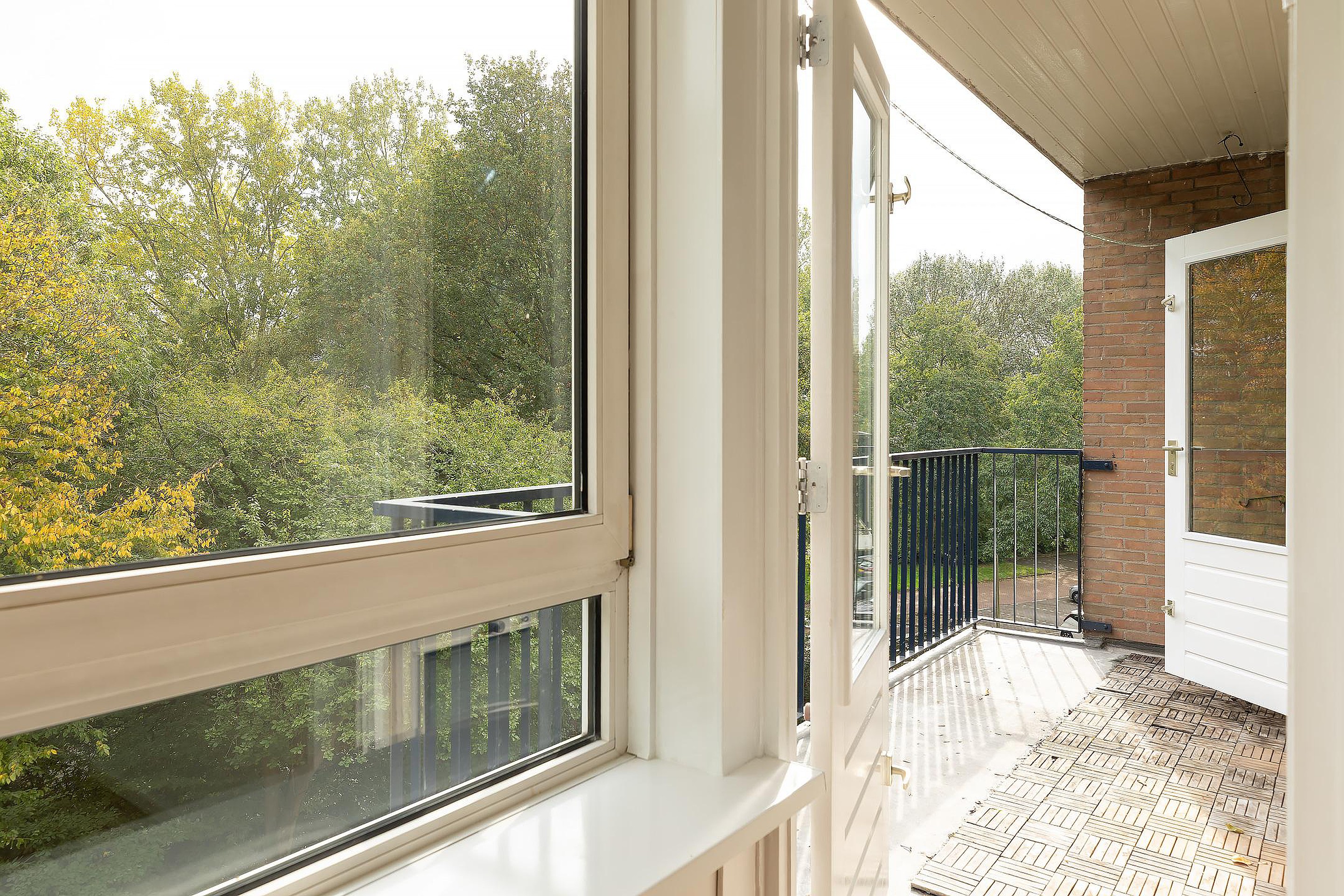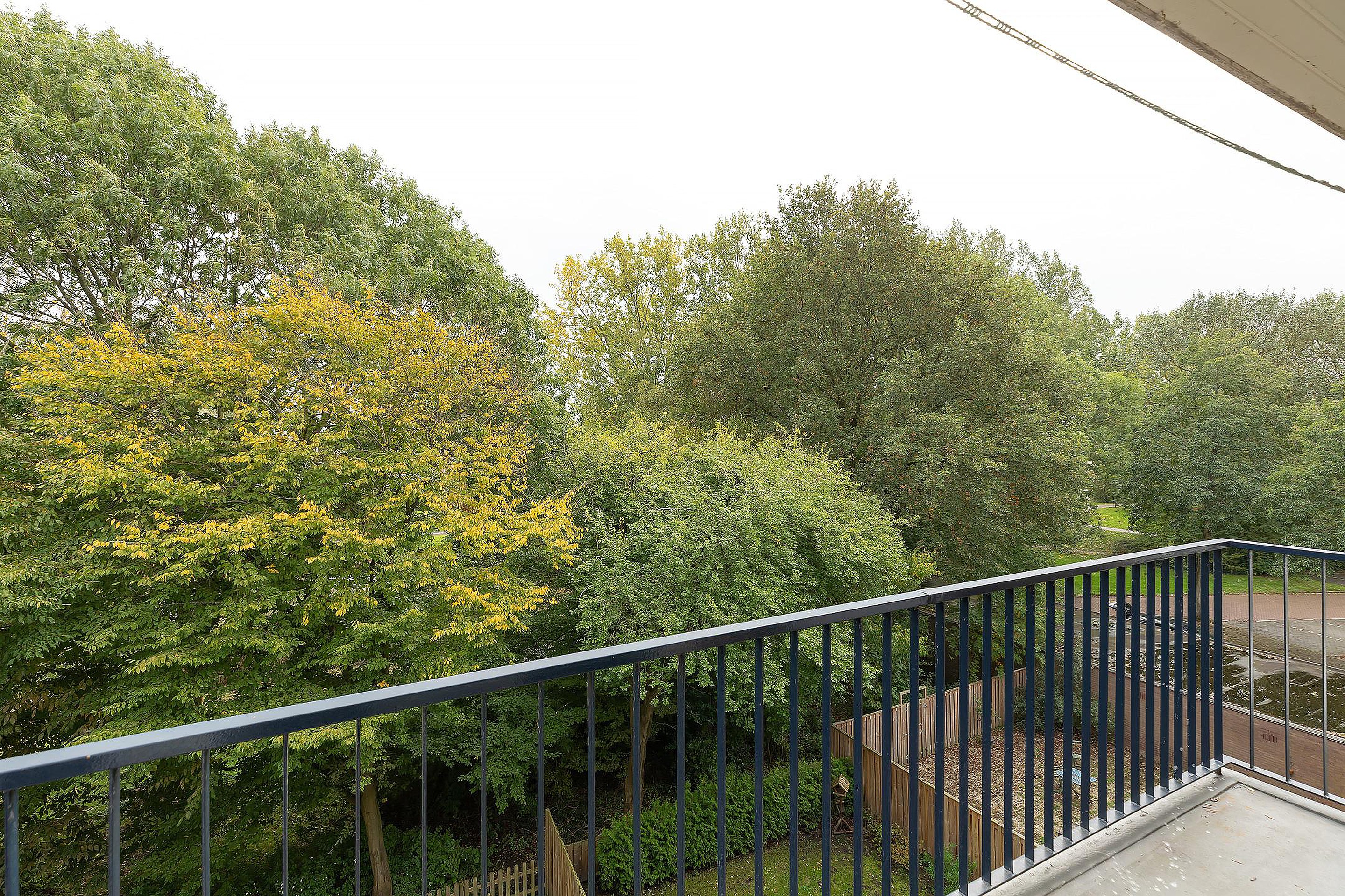 Via de woonkamer én de naastgelegen slaapkamer stap je het balkon op. Dit heeft een gunstige ligging op het oosten. Het uitzicht over het plantsoen en sierwater zorgt voor een gevoel van rust en privacy.