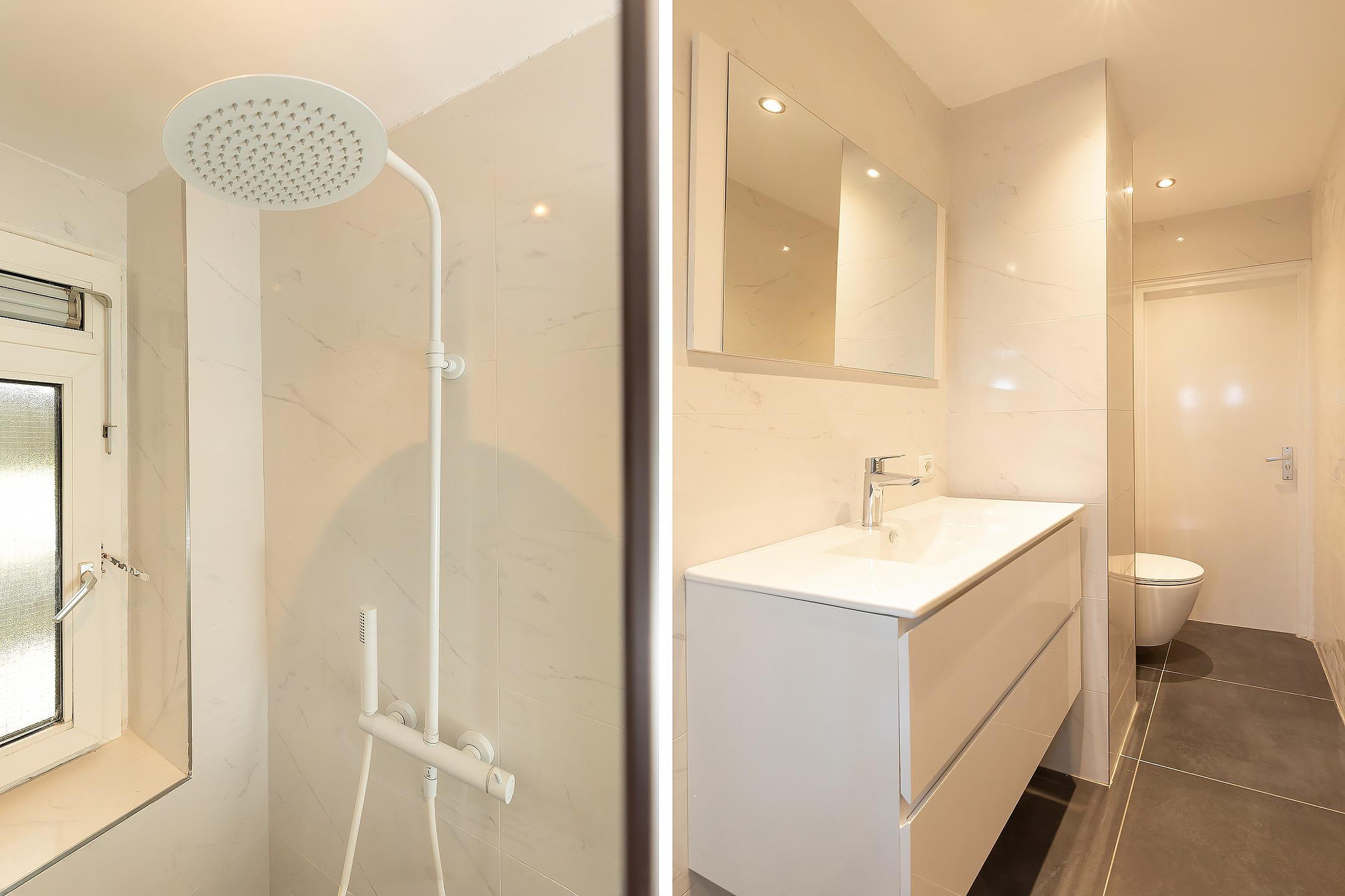 De gerenoveerde badkamer is modern afgewerkt en voorzien van een inloopdouche, wastafelmeubel met spiegel en zwevend toilet. De ruimte is volledig betegeld in een lichte kleurstelling en efficiënt ingedeeld.