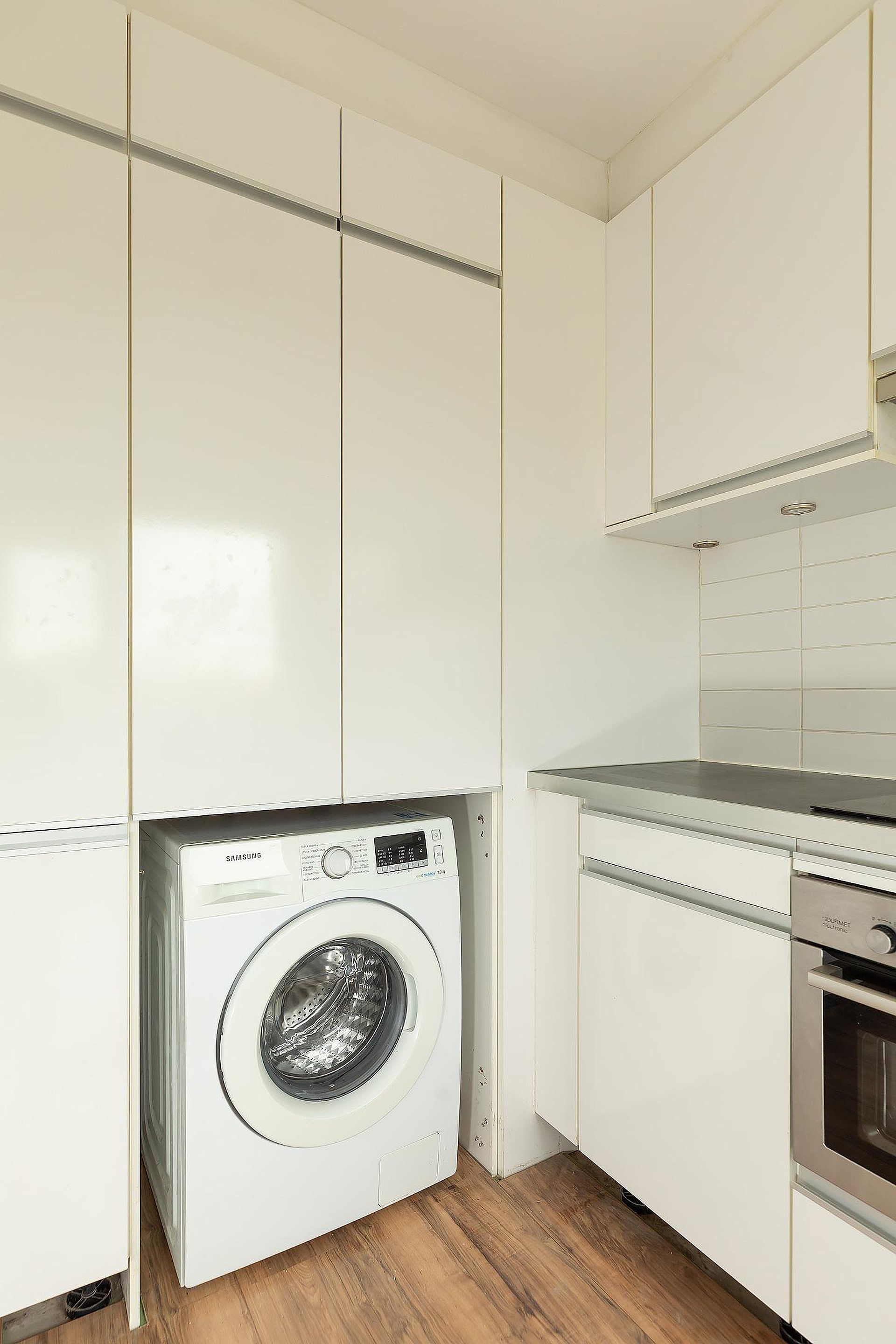 De keuken ligt aan de voorzijde van de woning en heeft een praktische L-opstelling. De ruimte is uitgerust met een nieuw geplaatste inductiekookplaat, BOSCH oven, koelkast, vaatwasser, spoelbak met mengkraan en voldoende kastruimte. Vanuit het keukenraam kijk je vrij uit over de bomen en de straat. Hier tref je ook de wasmachine, netjes weggewerkt.