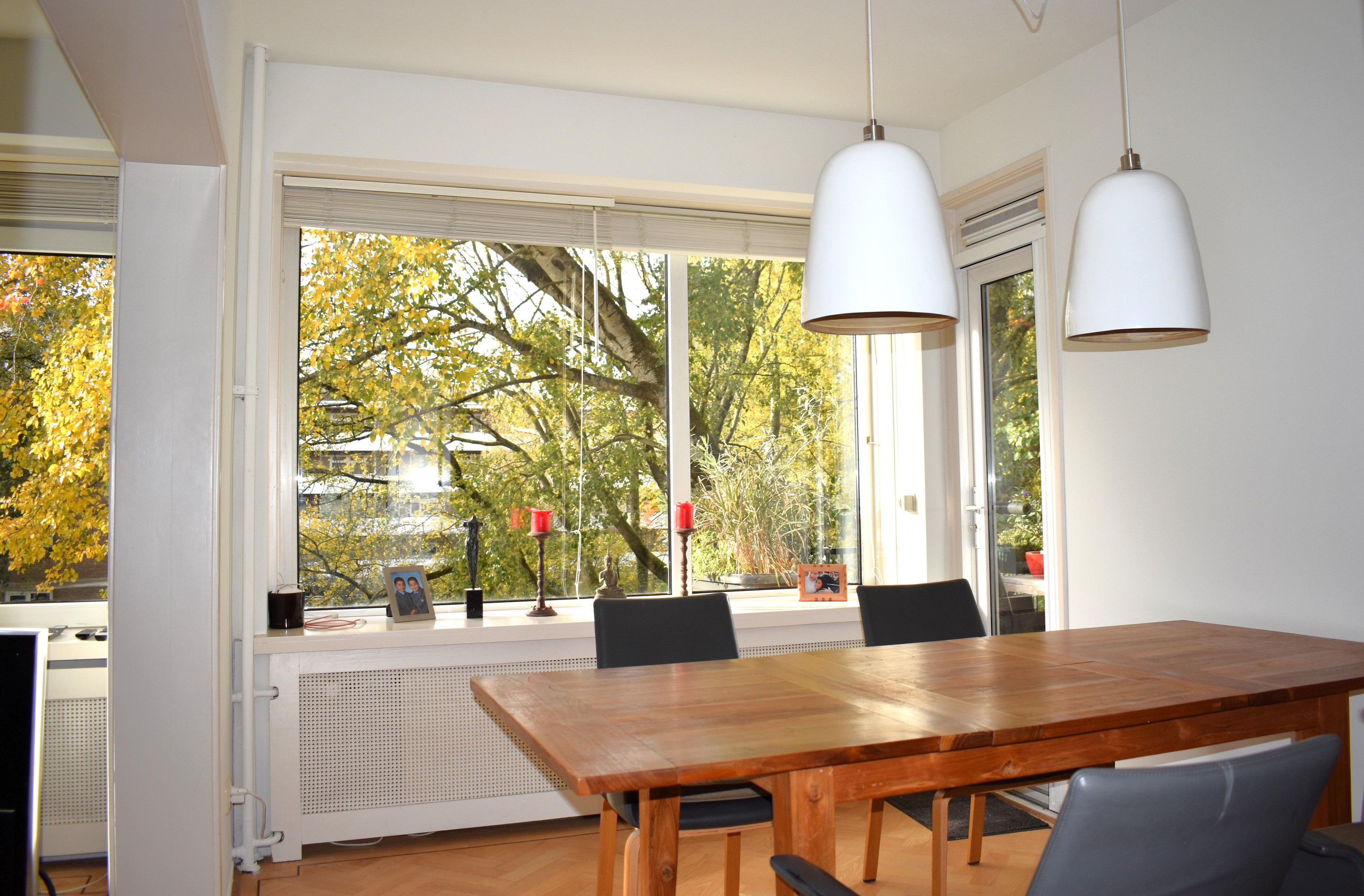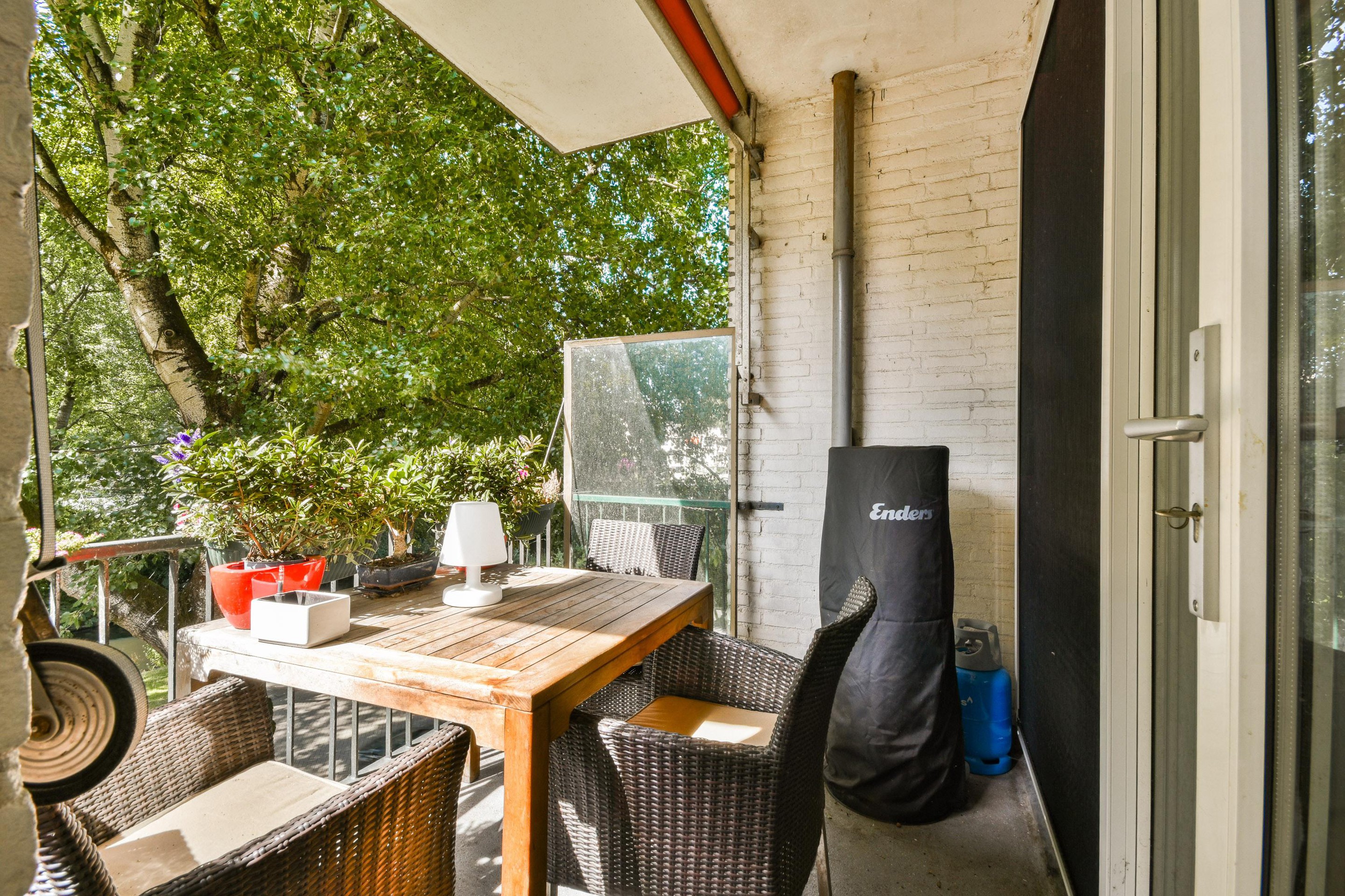 - Elektrisch zonnescherm voor de woon-en eetkamer en handmatig zonnescherm voor het balkon.