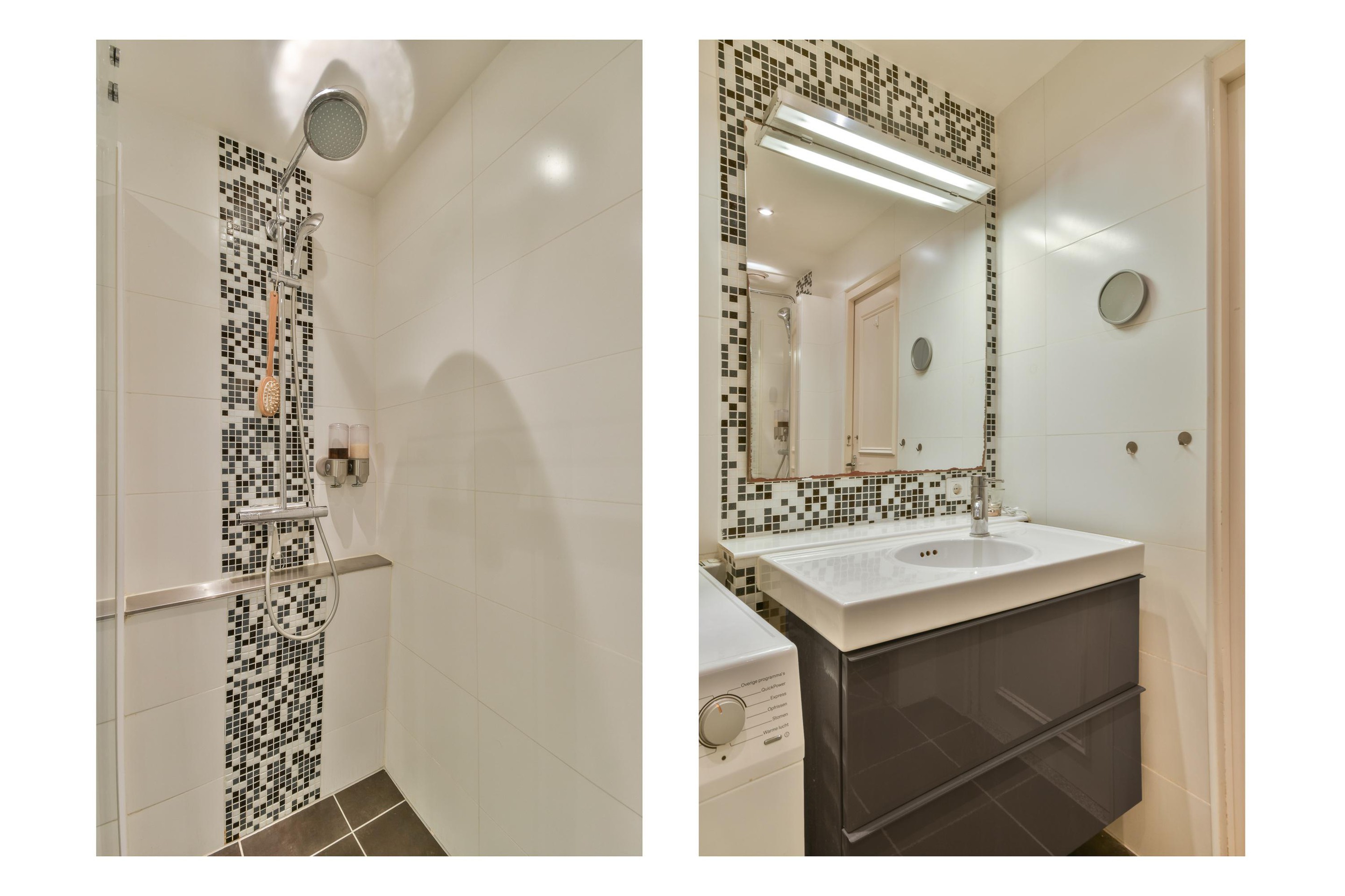 De luxe badkamer heeft een ruime inloopdouche, nette wastafel, handdoekradiator en is strak betegeld. Verder apart gesitueerd de opstelling voor wasmachine en droger combinatie.
