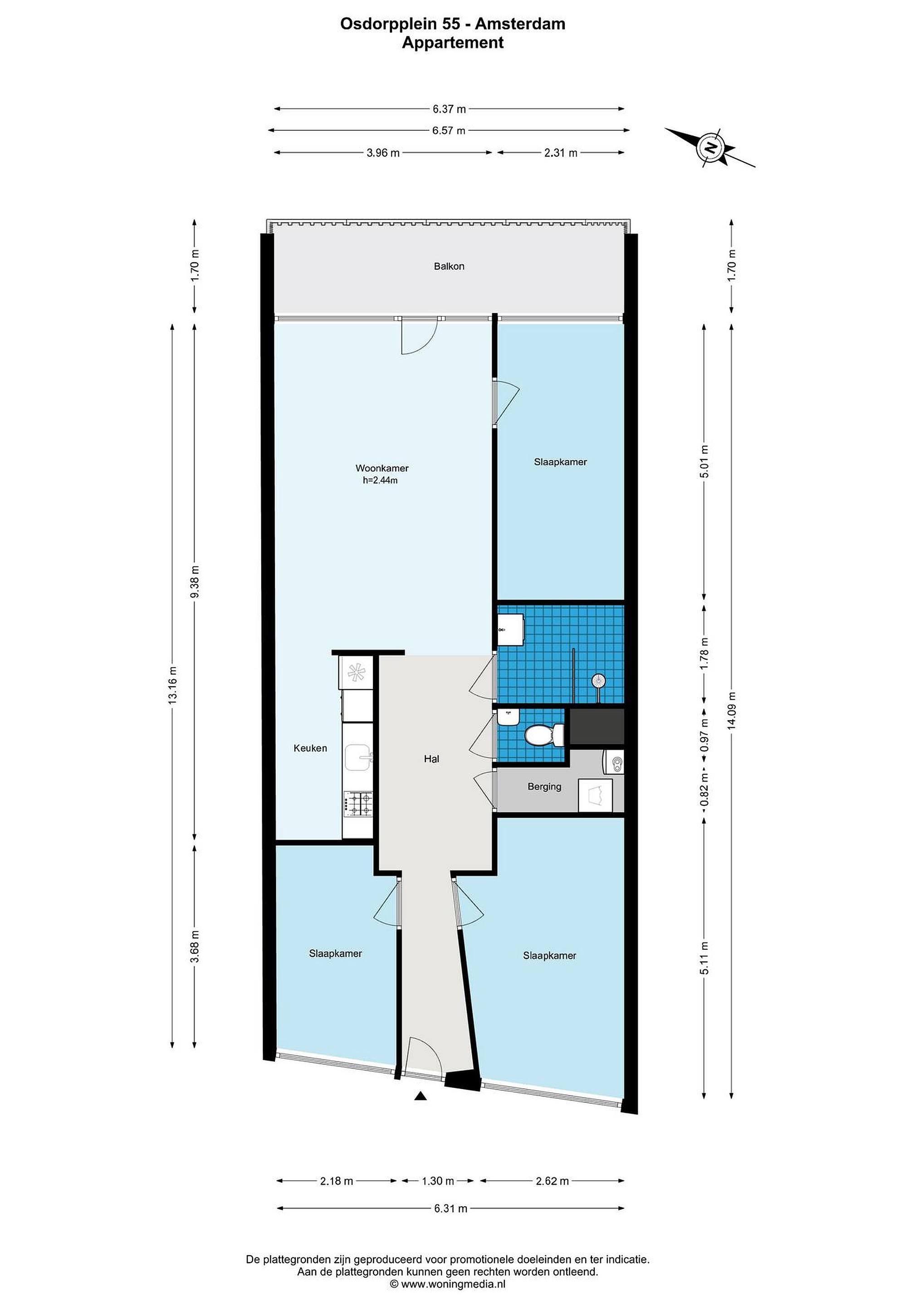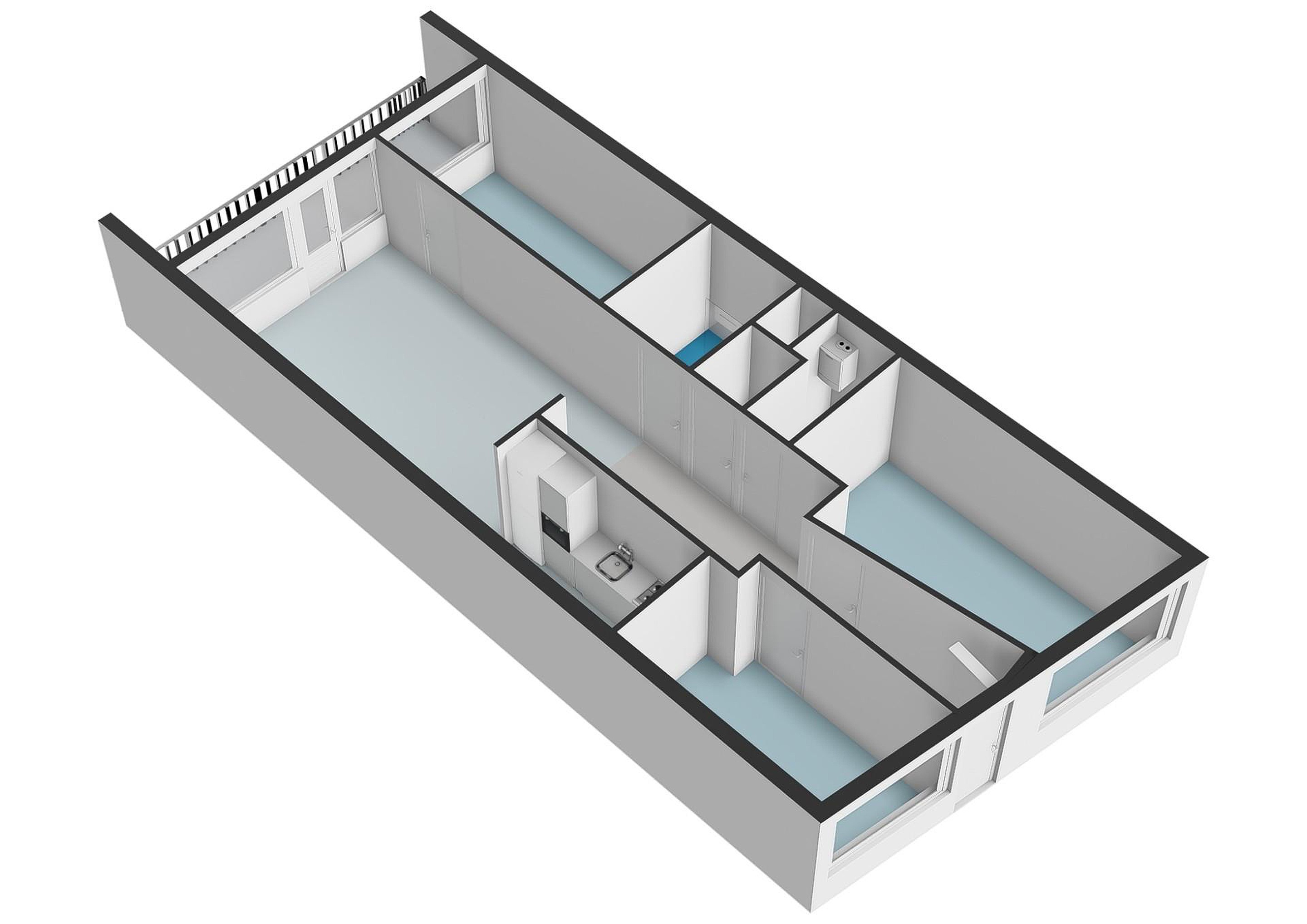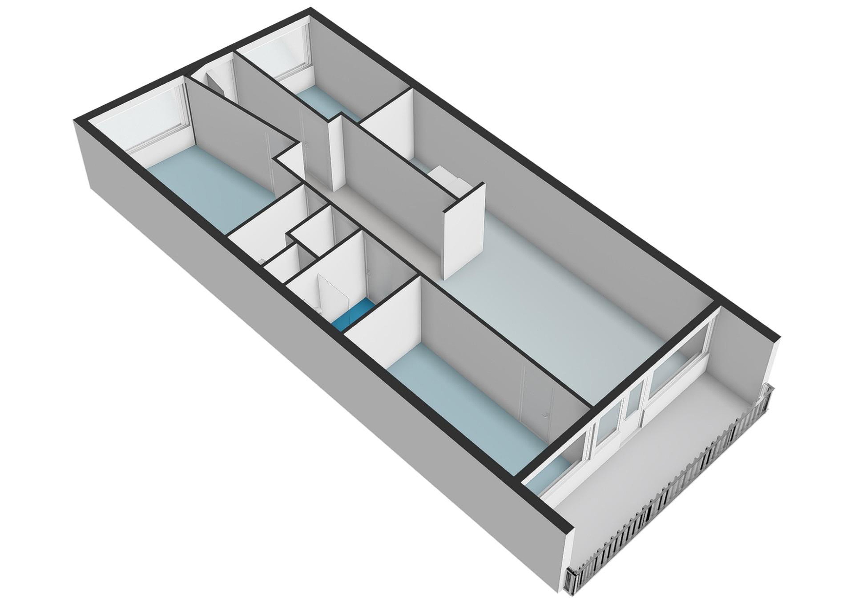 De entree van het appartement geeft toegang tot een hal, met aan de galerij-zijde twee ruime slaapkamers. De badkamer is voorzien van een douche en wastafelmeubel. Er is een separaat toilet in de gang. De woonkamer bevindt zich aan de zonnige voorzijde en biedt toegang tot het ruime terras. Je geniet hier volop van het uitzicht over de Sloterplas. De derde slaapkamer bevindt zich ook aan de voorzijde en heeft uitzicht over de Sloterplas.