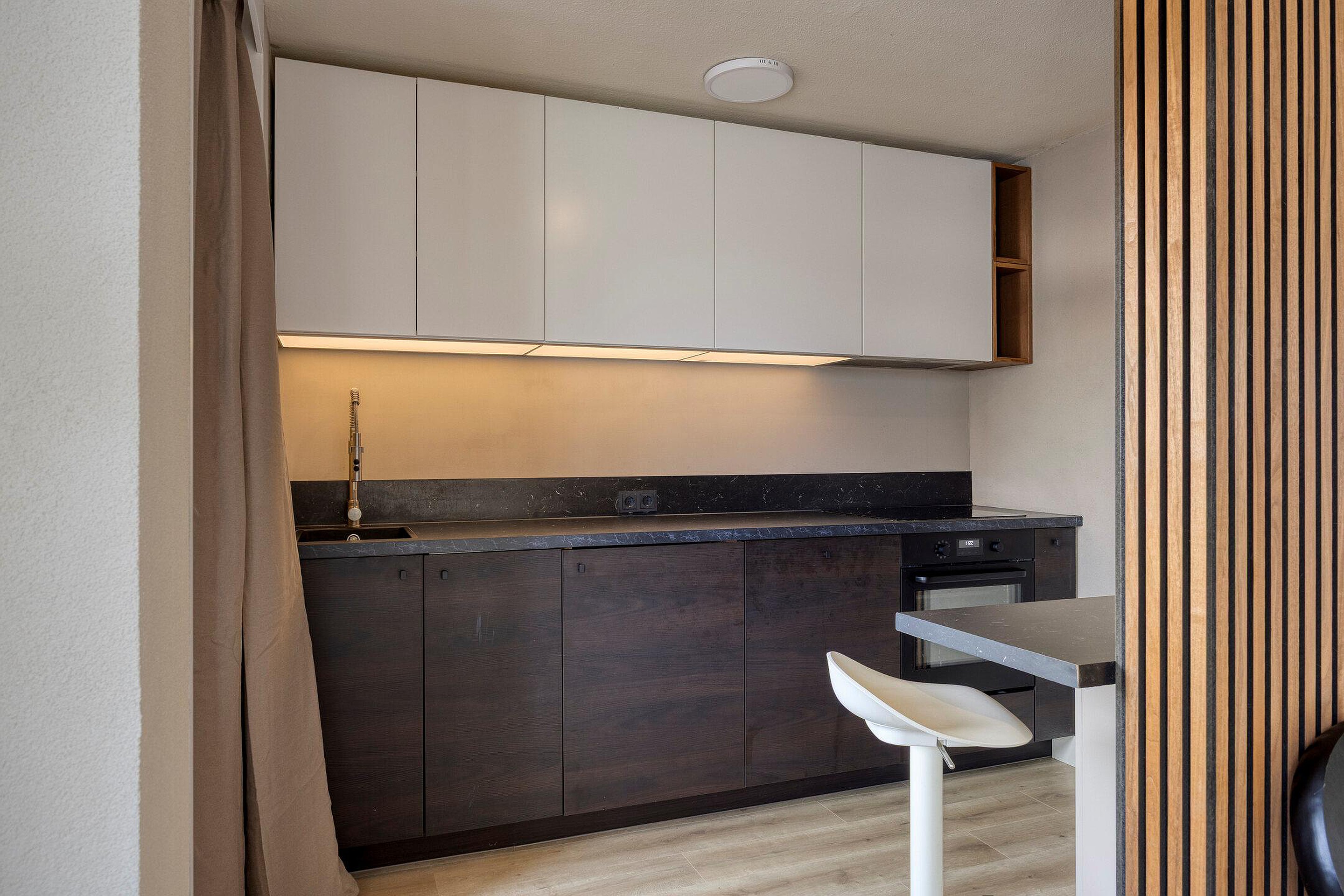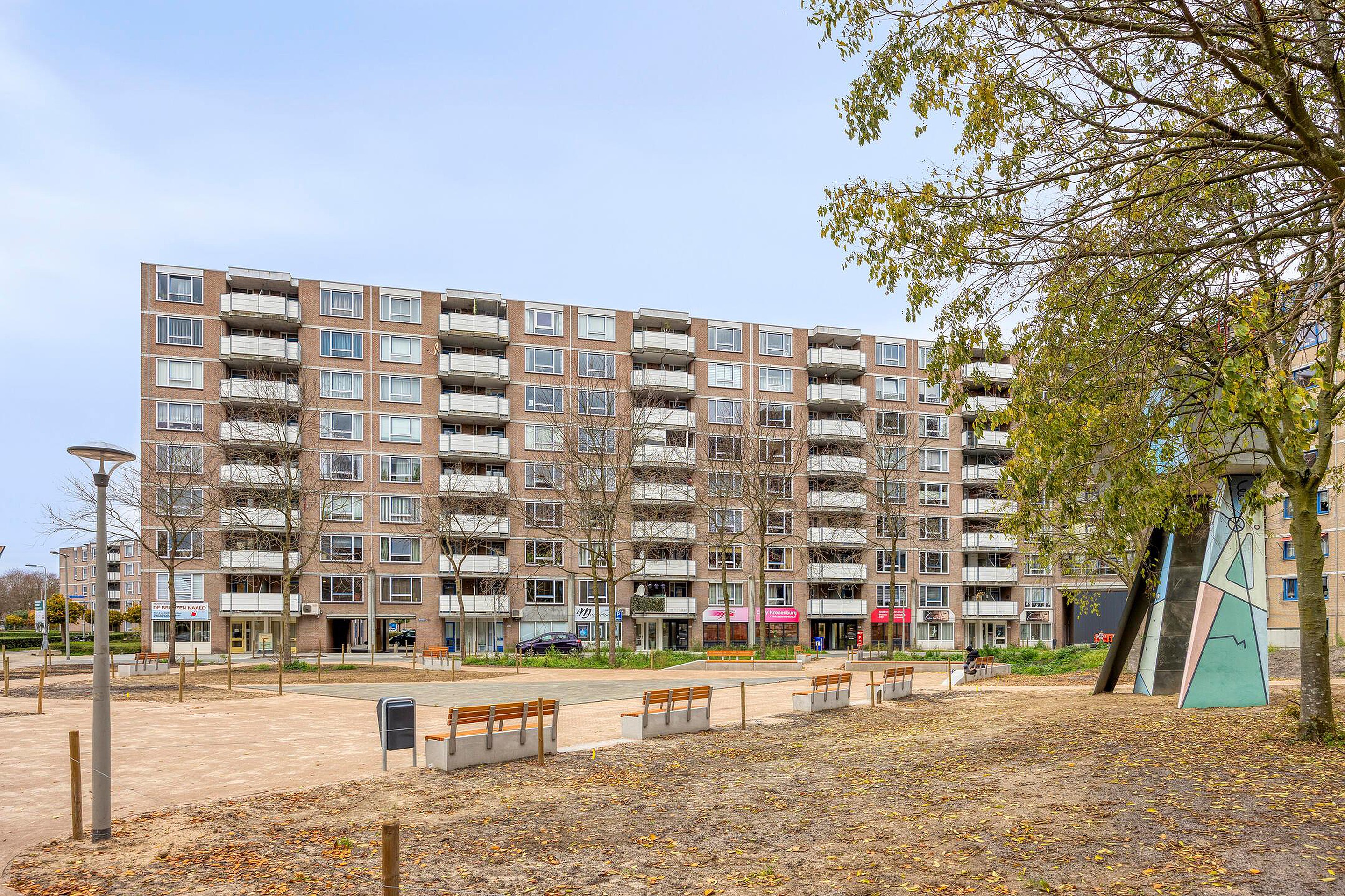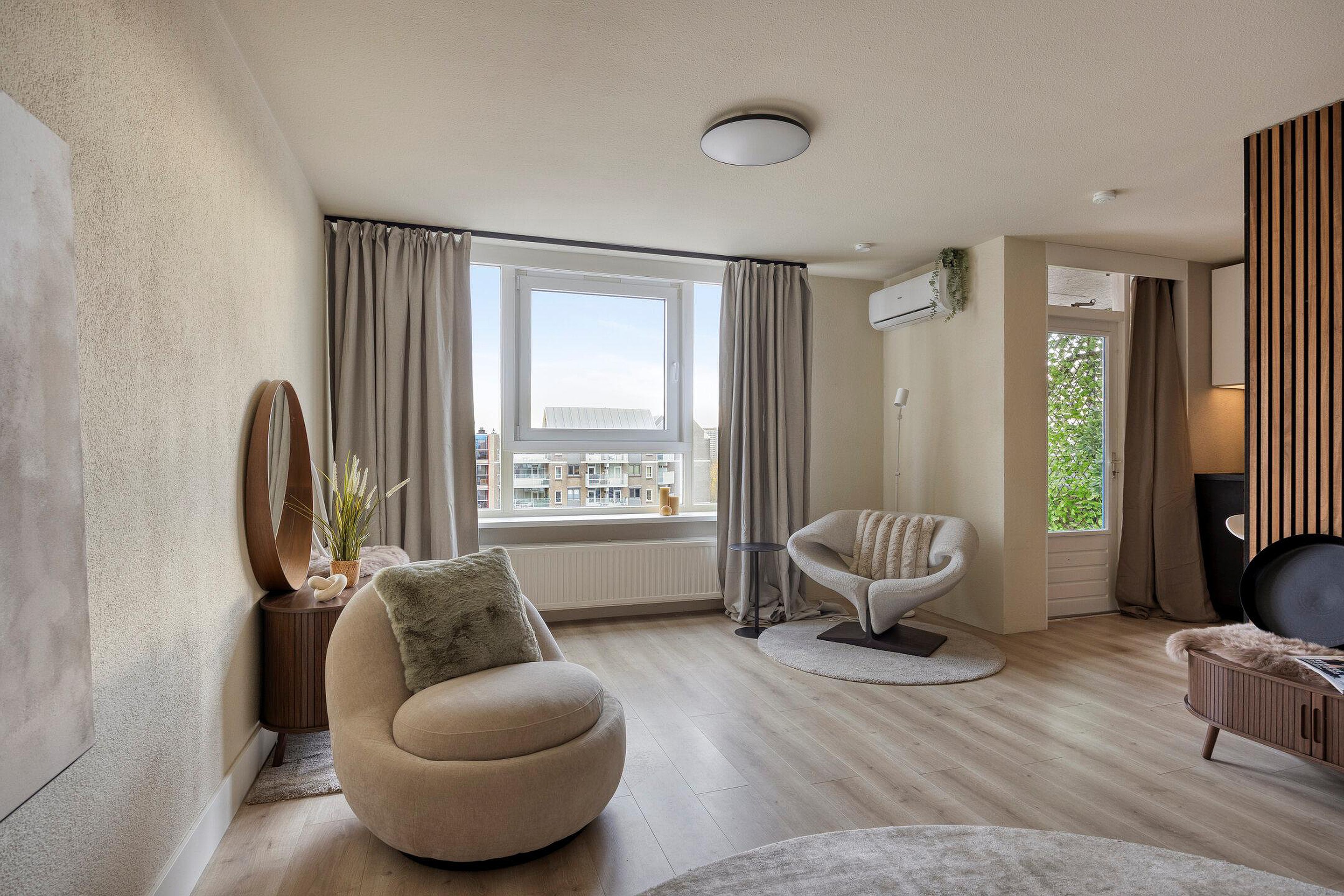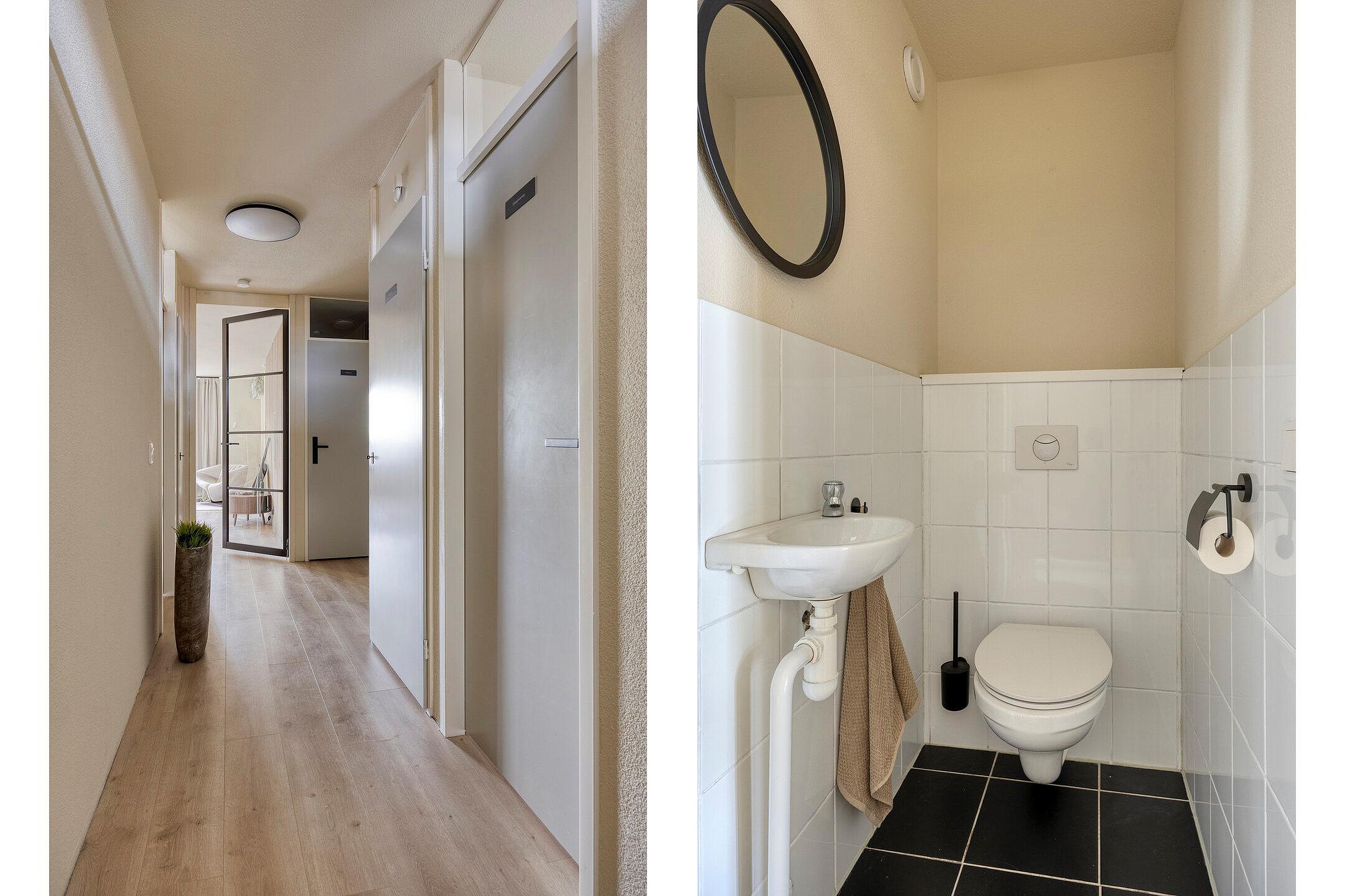 Appartement (8e verdieping): entree, hal, toegang tot een provisiekast, een meterkast (schakelkast met automaten) en cv-/wasruimte, het moderne toilet met fontein, ruime (ouder)slaapkamer met inloopkast en een 2de slaapkamer welke momenteel in gebruik is als werkkamer. Een moderne tot plafondhoogte betegelde badkamer met inloopdouche, handdoekradiator en badkamermeubel. Ruime woonkamer met doorloop naar de halfopen keuken in parallel-opstelling, voorzien van HPL werkbladen en inbouwapparatuur (o.a. koelkast, vaatwasser, geïntegreerde rvs afzuigkap, inductie kookplaat, combi-oven). Grenzend aan de keuken vindt u de toegang tot het balkon, welke volledig is afgewerkt met hardhouten vlonderdelen.