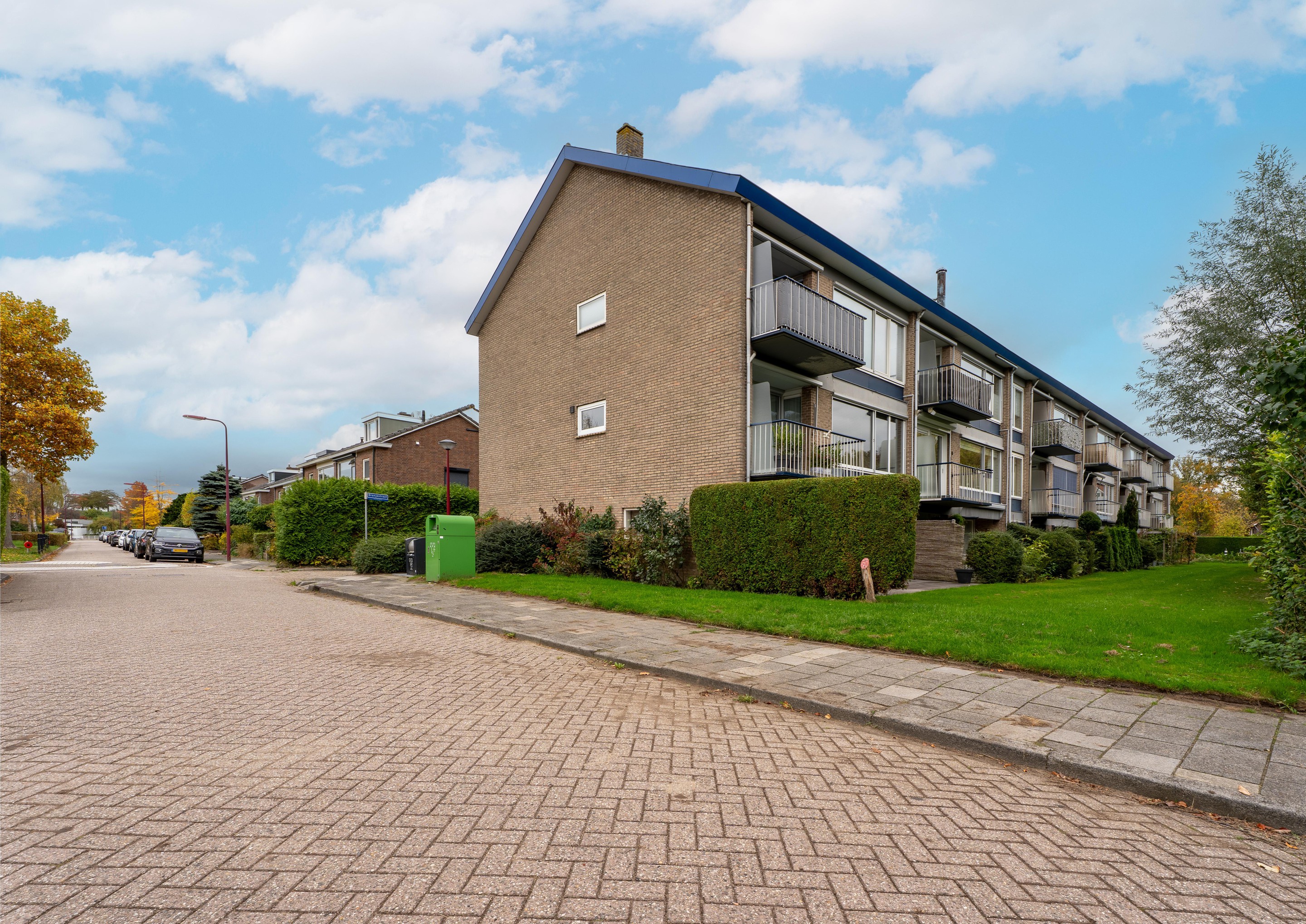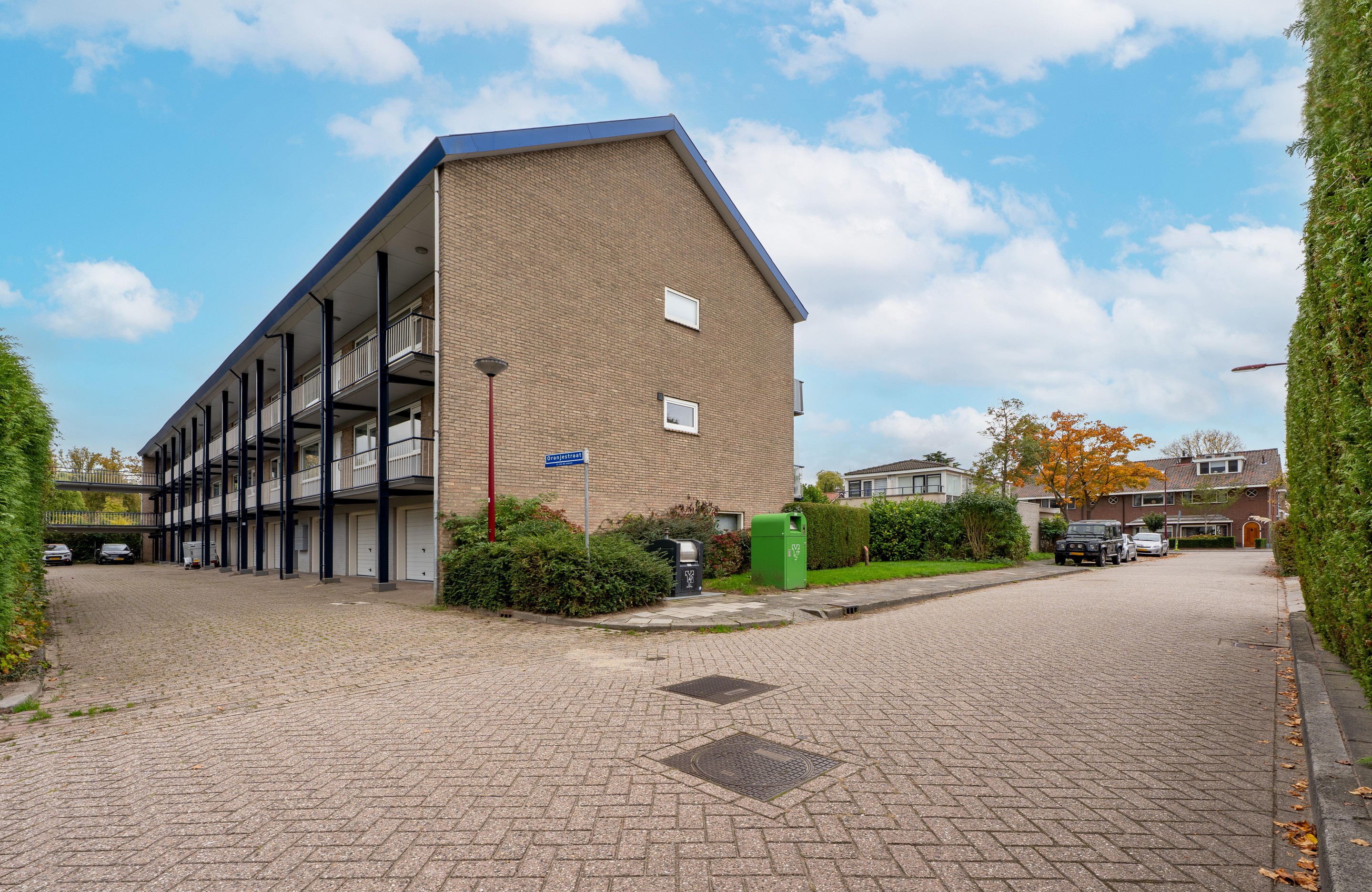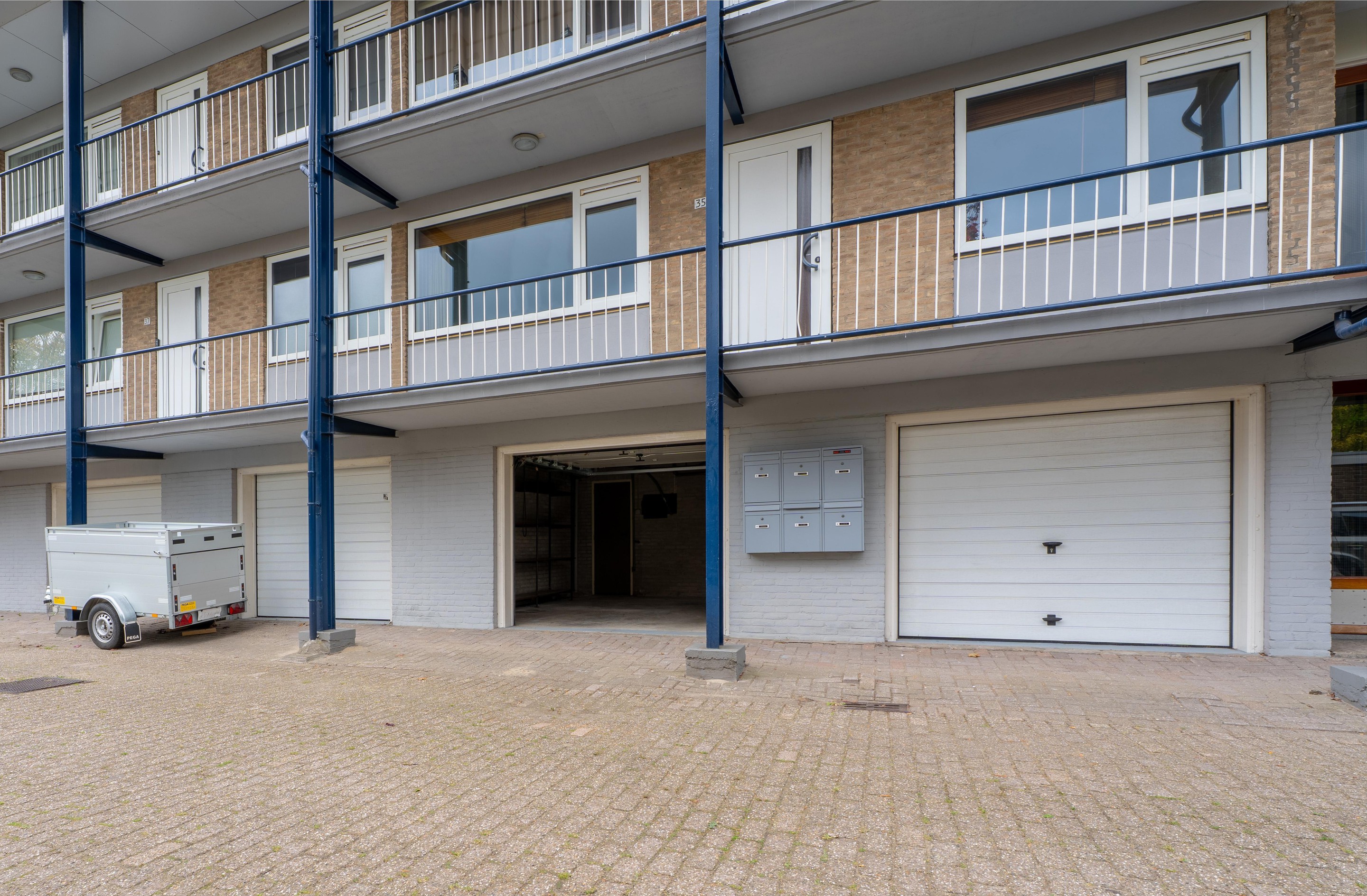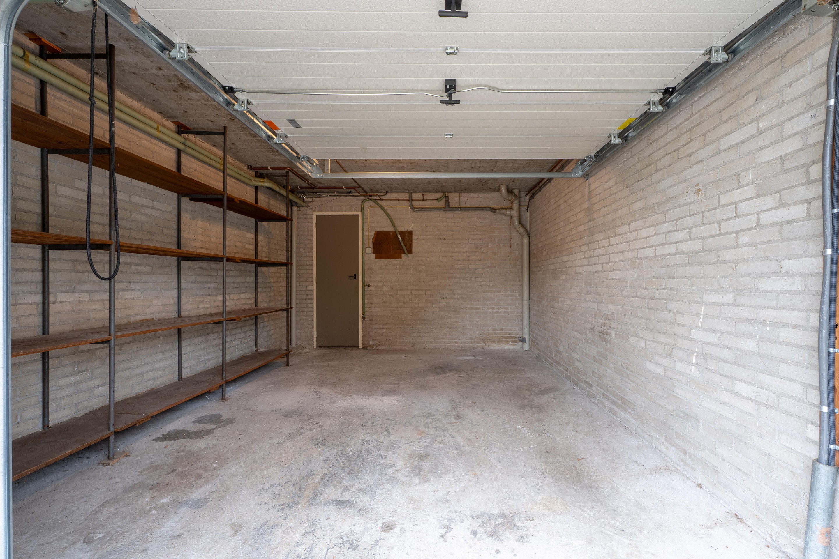 Aan de voorzijde van het complex bevindt zich een handmatige roldeur die toegang biedt tot de ruime garagebox, ideaal voor het parkeren van een auto op eigen terrein.