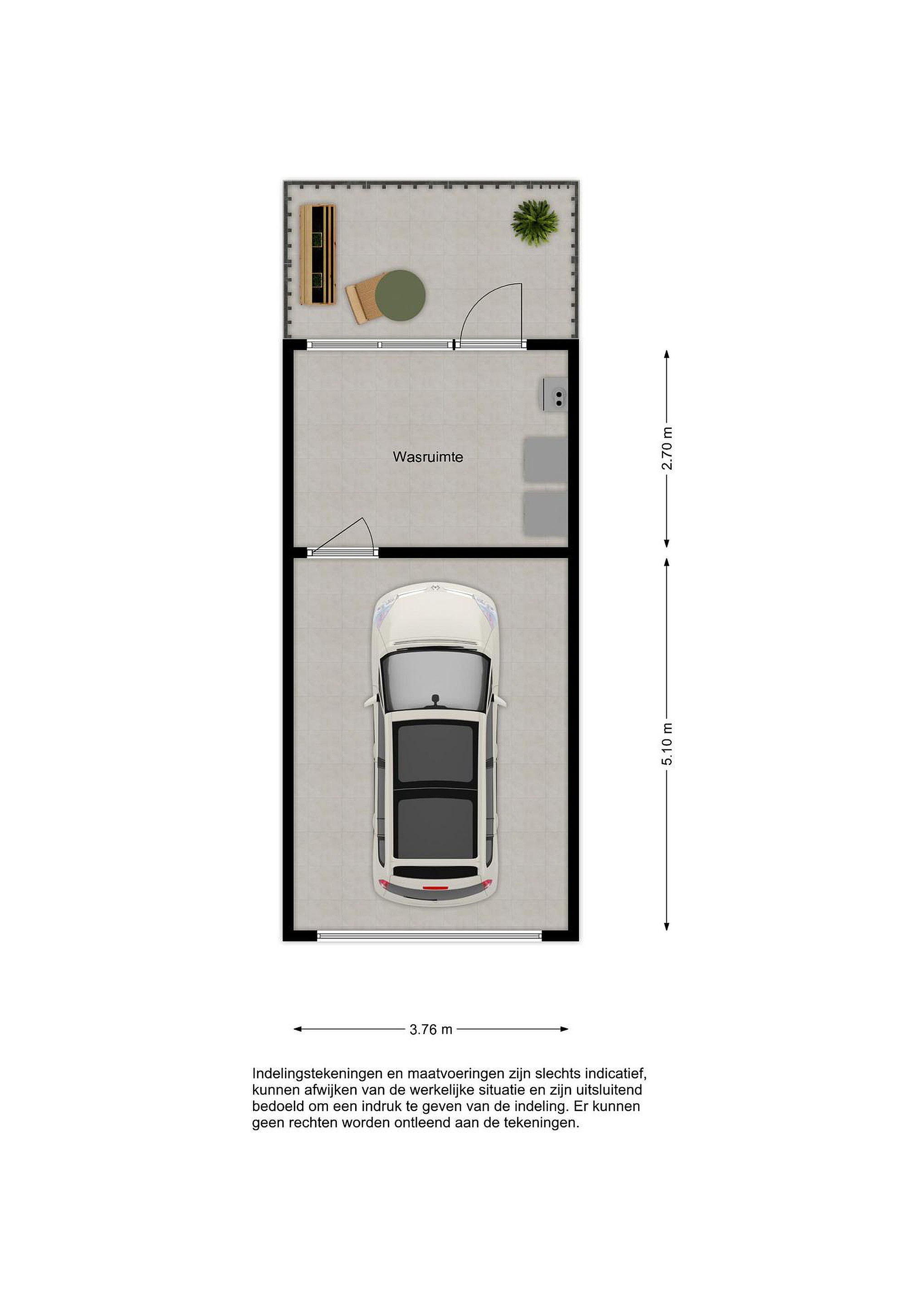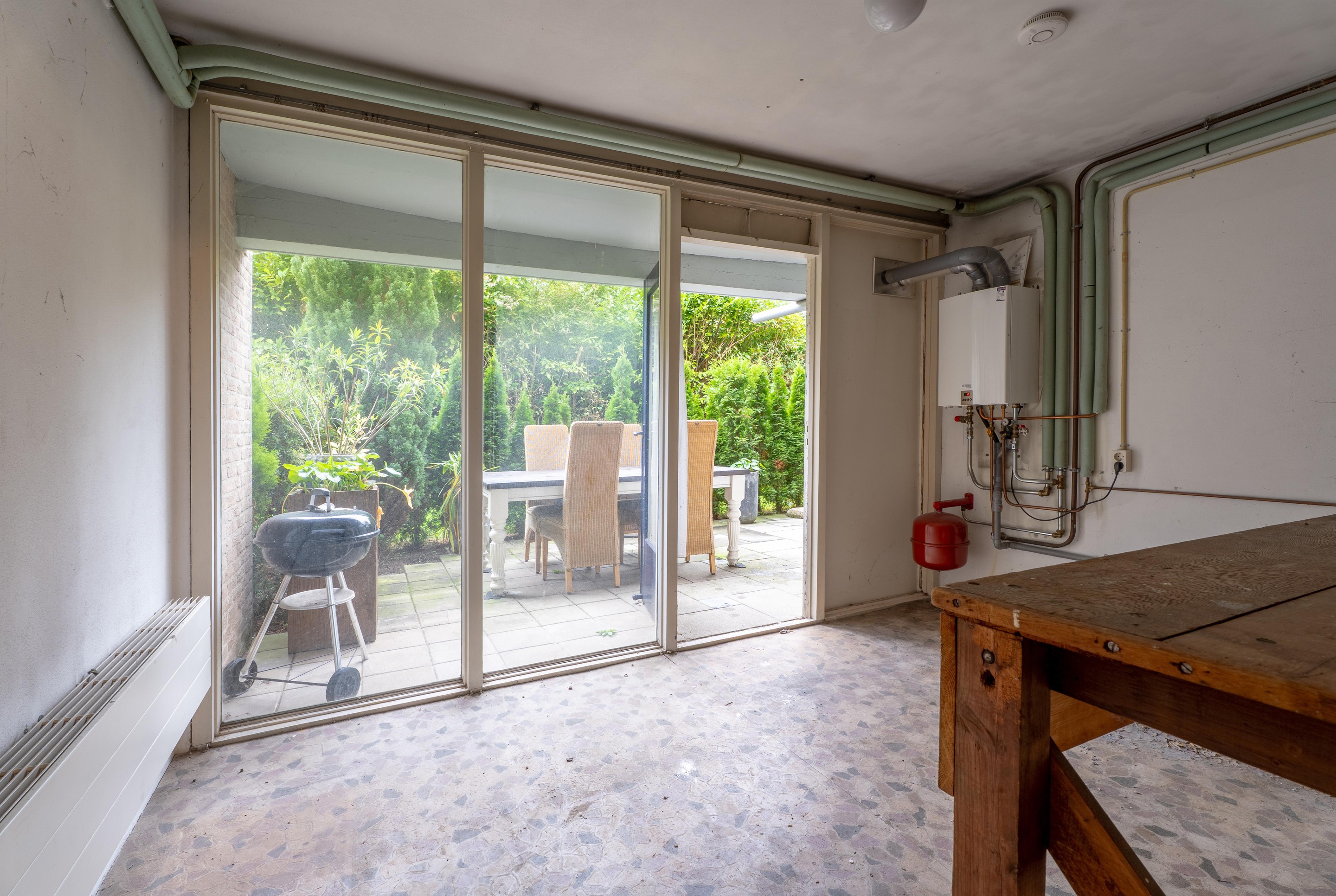 Vanuit de garage is er directe toegang tot de technische ruimte aan de achterzijde van het complex. Deze ruimte is niet alleen praktisch als extra bergruimte, maar hier bevinden zich ook de cv-installatie en de aansluitingen voor de wasmachine en droger.