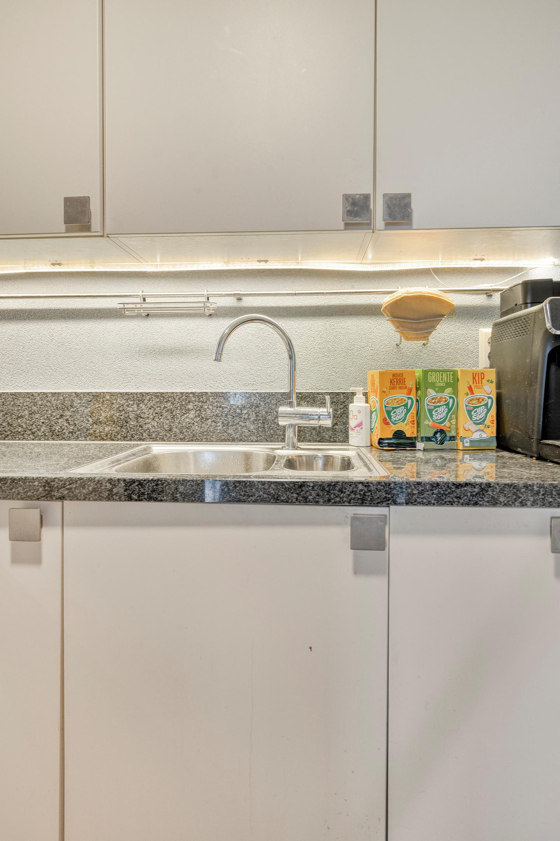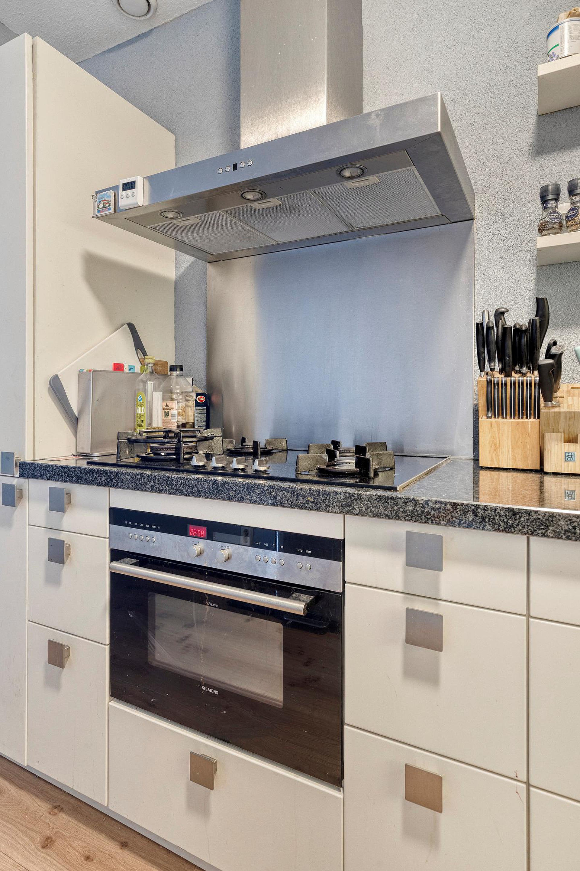 De moderne open keuken sluit naadloos aan op de woonkamer en is uitgevoerd met een L-vormig aanrechtblad. Hier kookt u met gemak dankzij de complete inbouwapparatuur, waaronder een gasfornuis met afzuigkap, vaatwasmachine, ovencombinatie, spoelbak en koelkast. De keuken biedt volop opbergruimte in lades en kasten, waardoor alles overzichtelijk en binnen handbereik blijft. De strakke afwerking en praktische indeling maken dit een keuken waar u met plezier tijd doorbrengt.