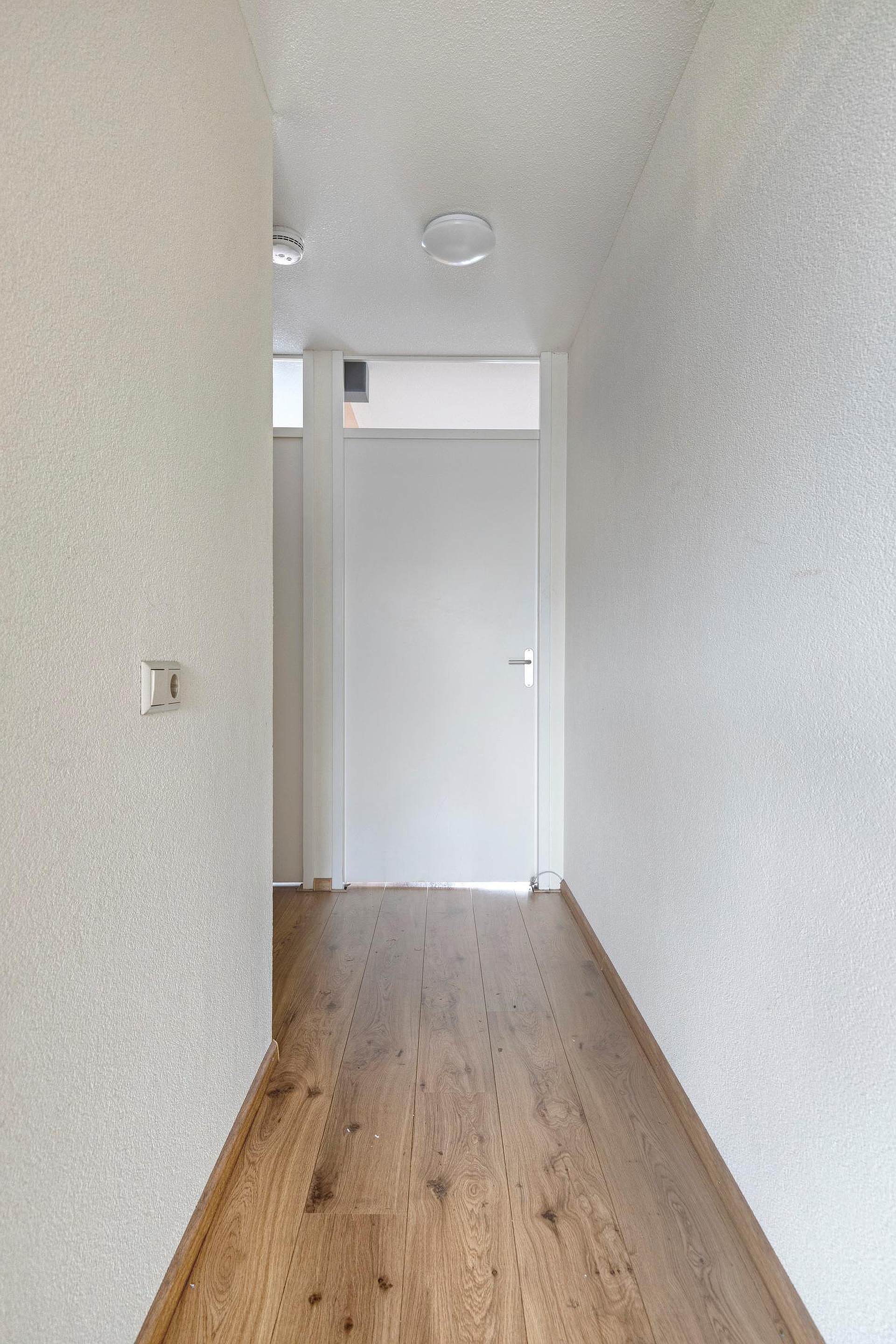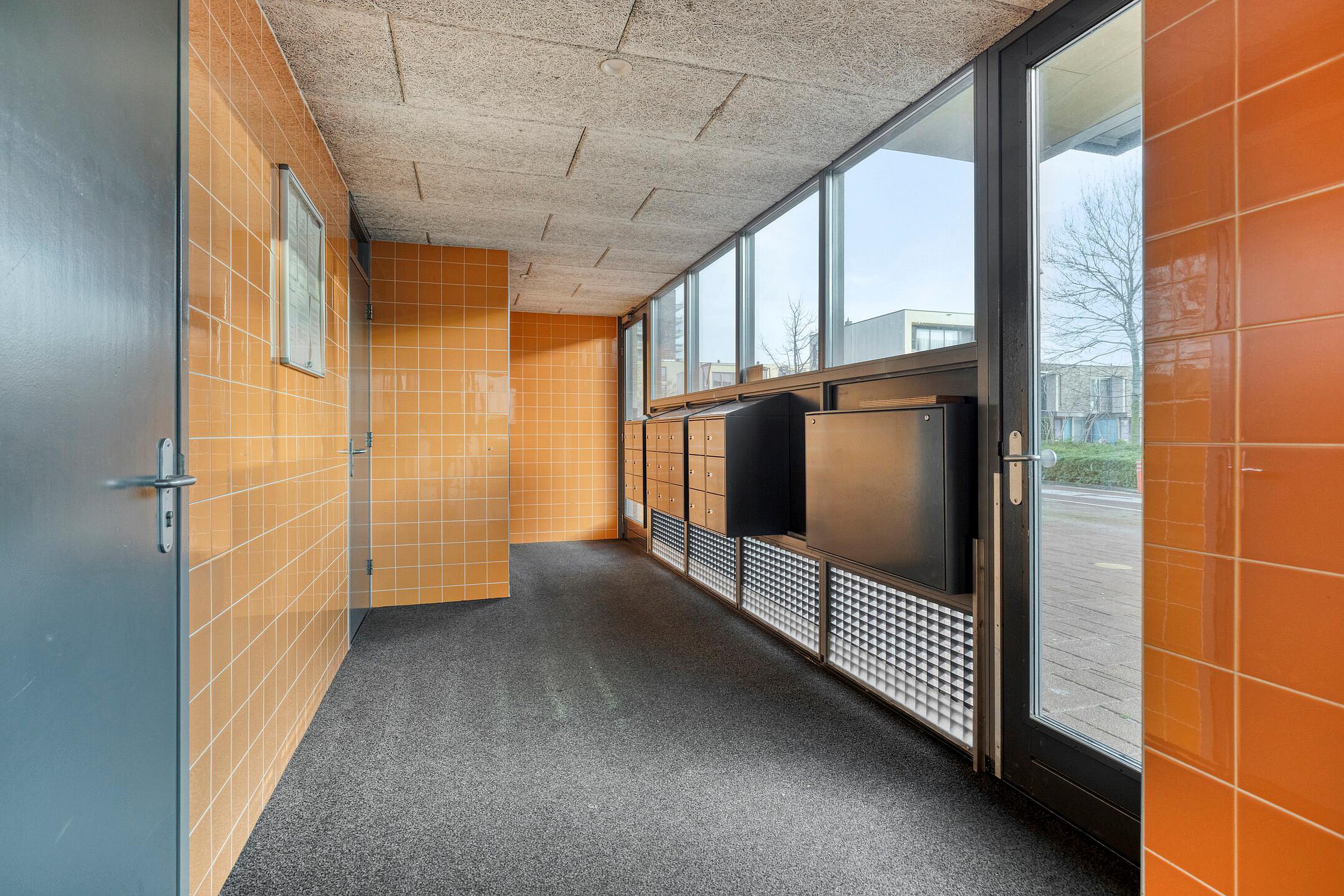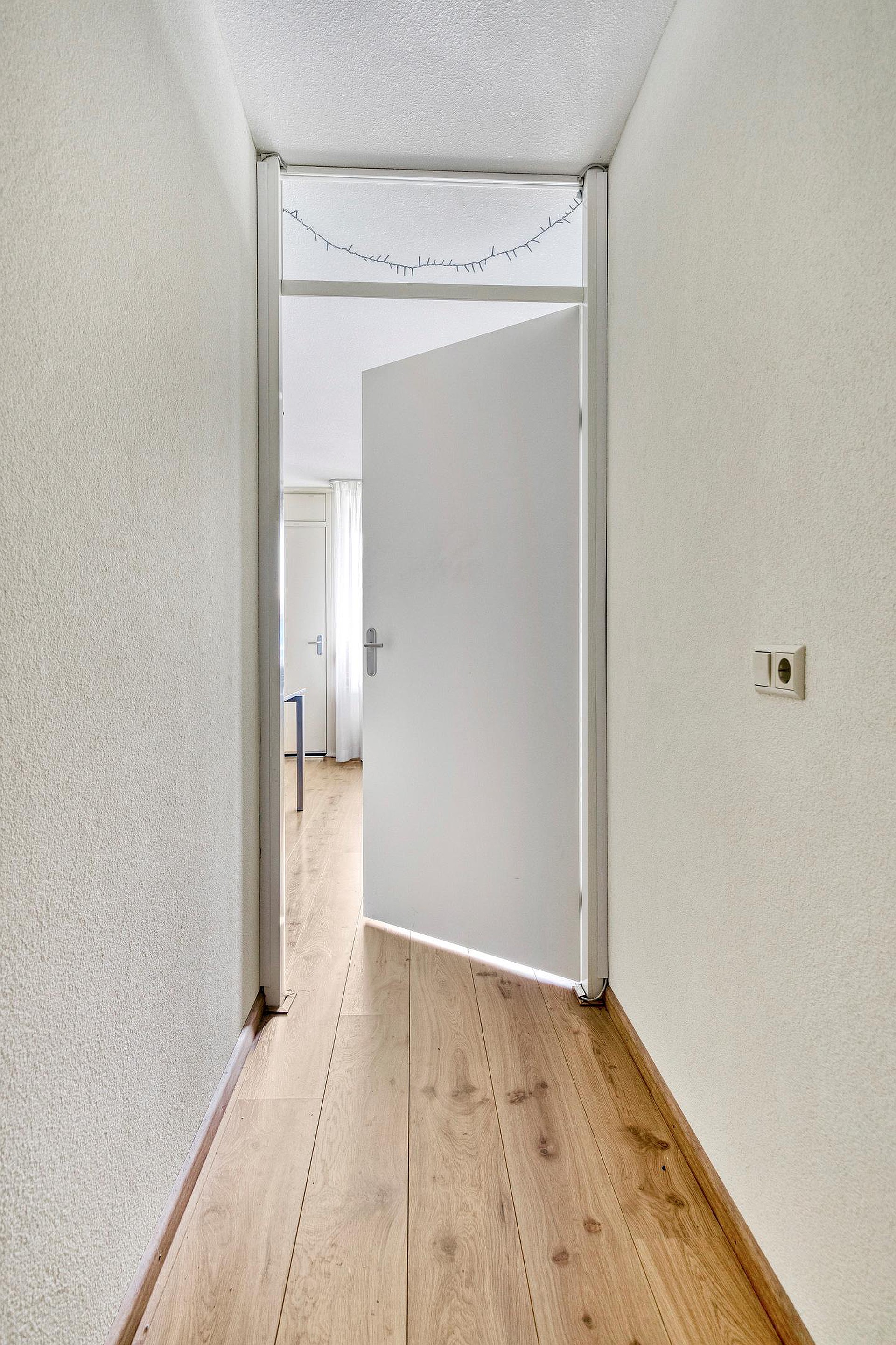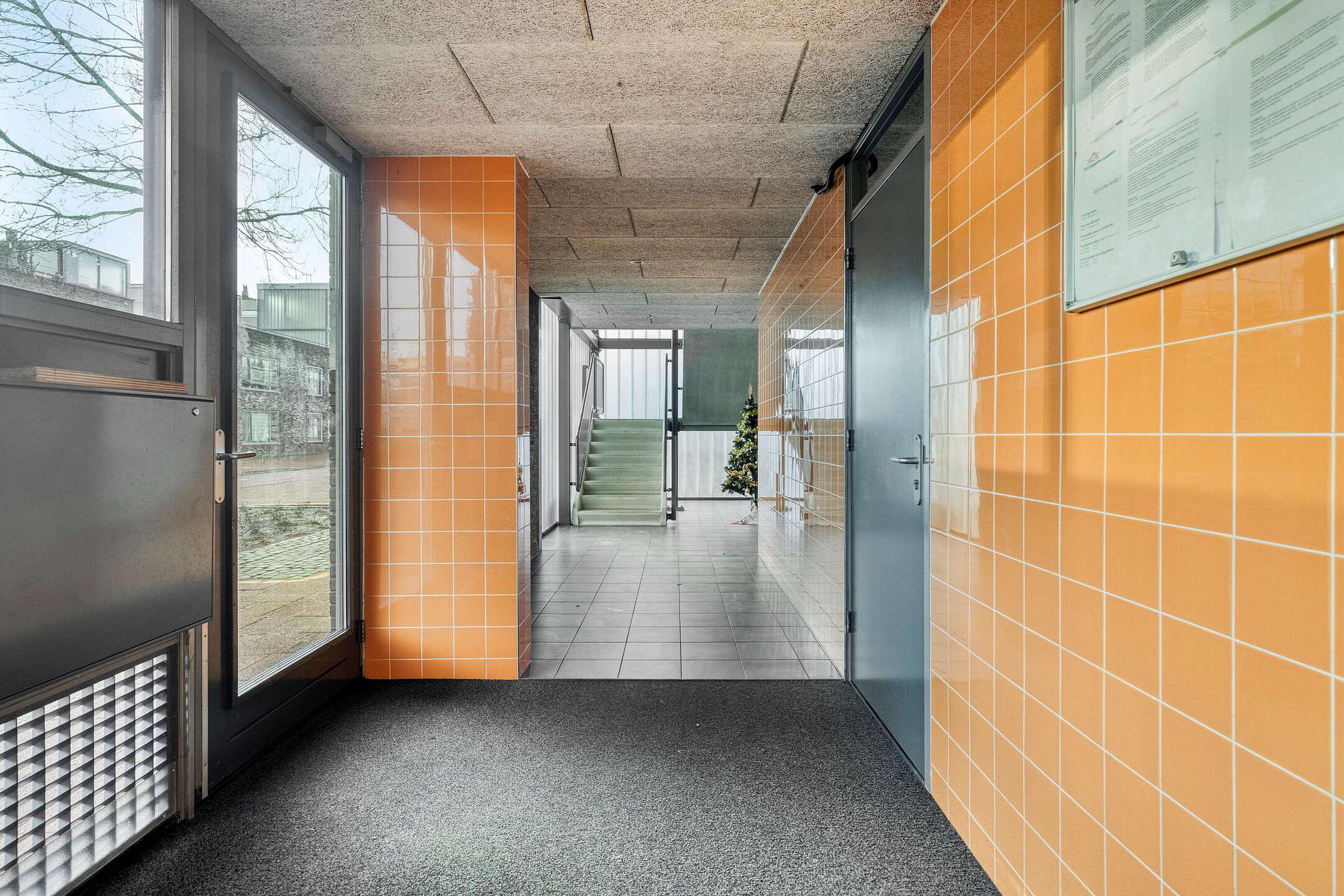 U betreedt het complex aan de straatzijde via de gezamenlijke entree, waar u de brievenbussen en intercoms aantreft. Vanaf hier kiest u voor de trap of de lift naar de verdieping waar het appartement is gelegen. Via de galerij bereikt u de voordeur van de woning. Eenmaal binnen komt u in de entreehal, waar voldoende ruimte is voor een kapstok of opbergmeubel. Deze hal vormt een prettige binnenkomst en leidt u op natuurlijke wijze verder naar de woonkamer, waardoor u direct een gevoel van ruimte en licht ervaart.