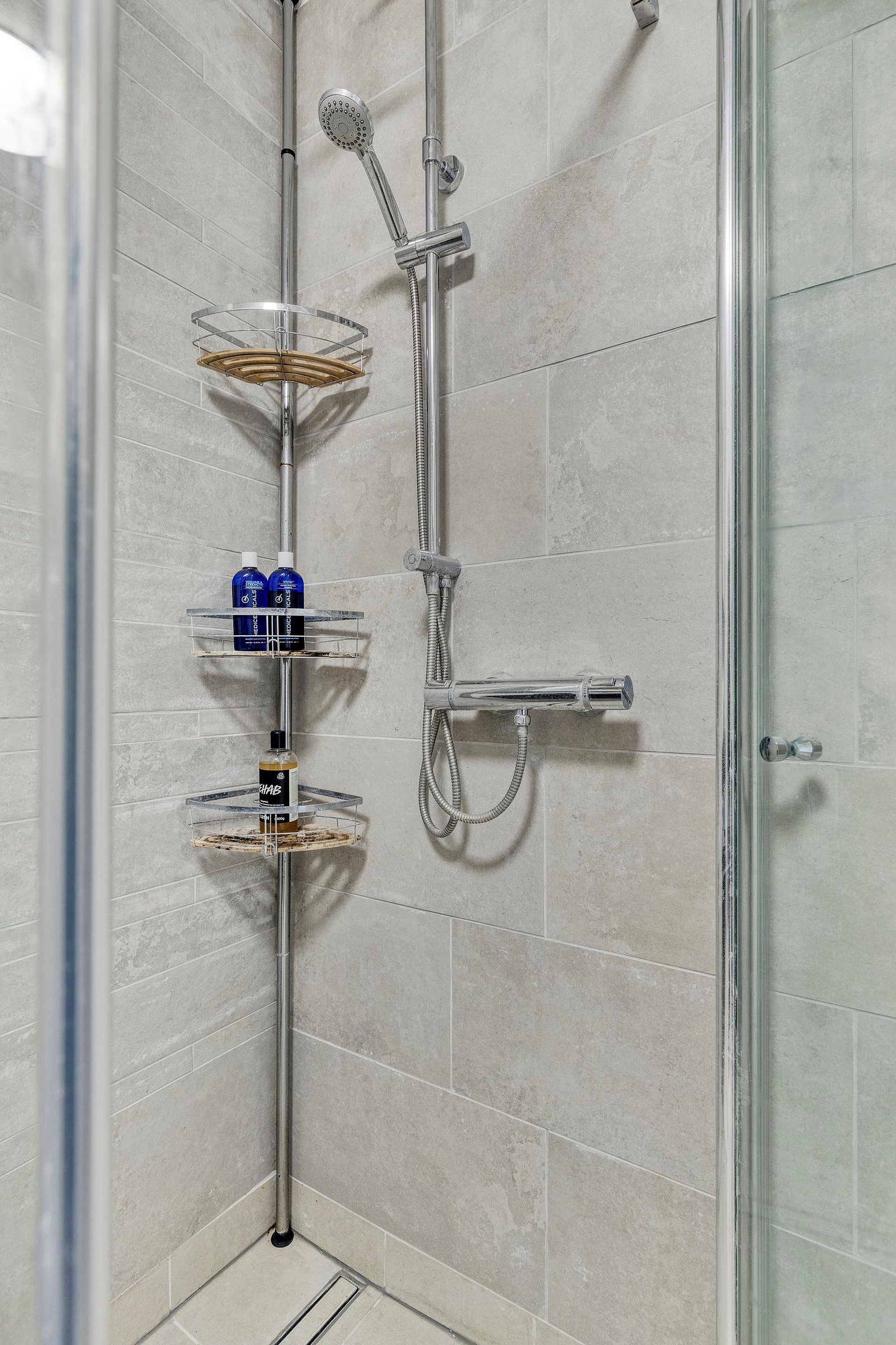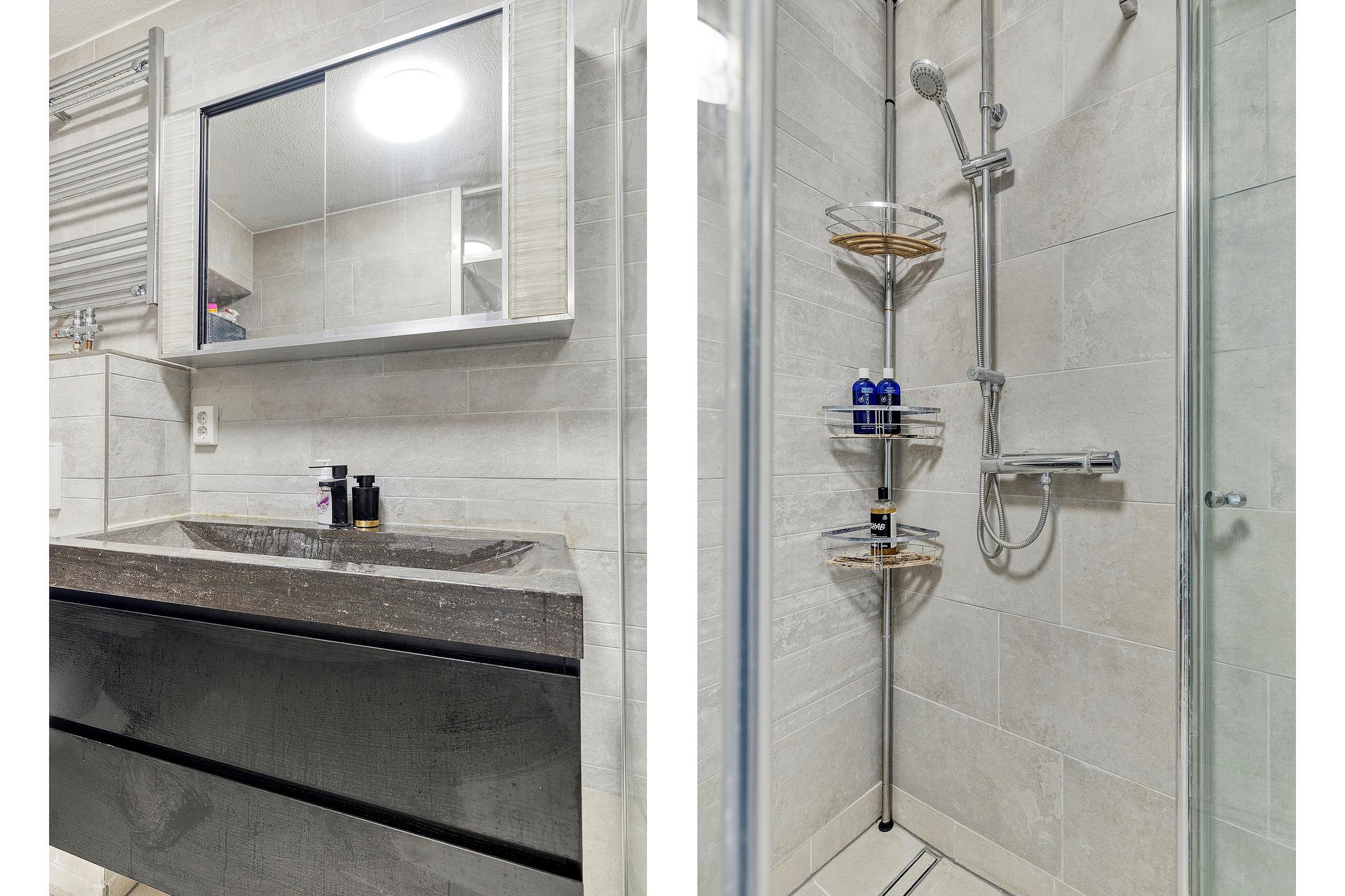 De badkamer grenst aan de hal en is volledig betegeld in een moderne stijl. U beschikt hier over een nette douchecabine, een wastafel met spiegel, een handdoekradiator en een zwevend toilet. Alles is verzorgd en instapklaar, zodat u hier zonder aanpassingen direct gebruik van kunt maken.