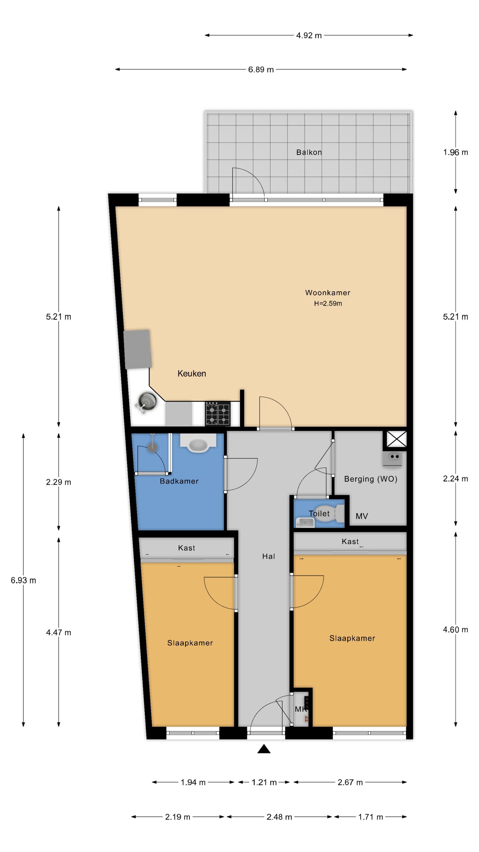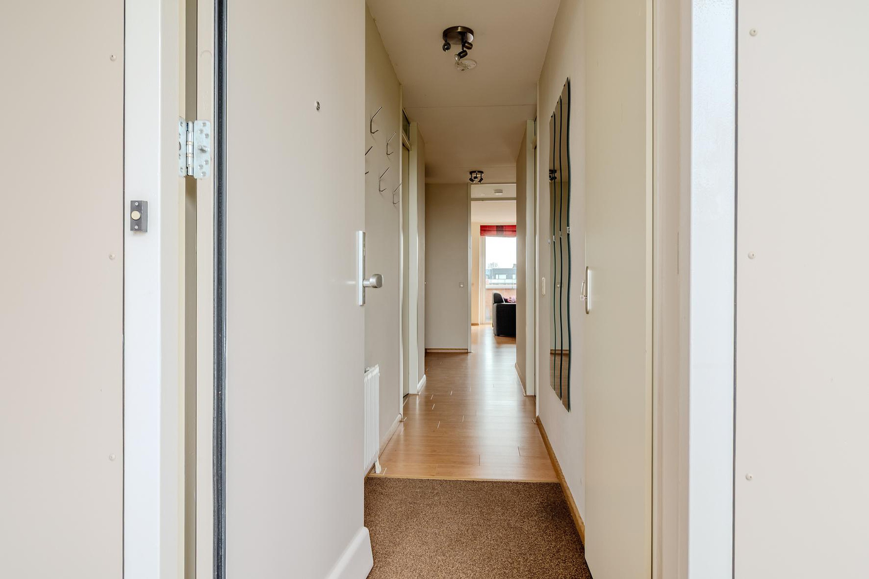 Het complex heeft een afgesloten entree met bellentableau en brievenbussen waarna je toegang krijgt tot de lift en het trappenhuis. Op de derde verdieping stap je de galerij op naar de entree van dit appartement. Binnenkomst in de hal met meterkast. Vanuit de hal heb je toegang tot alle vertrekken. Achteraan de hal de heerlijke lichte woonkamer (5.21 x 6.89) is aan de achterzijde gelegen. De open keuken is voorzien van veel kastruimte en diverse inbouwapparatuur zoals gaskookplaat, afzuigkap, combi- oven/magnetron en vaatwasser. De losse koelkast wordt ter overname aangeboden. Vanuit de woonkamer heb je toegang tot het zonnige balkon (4.92 x 1.96) op het westen. Doordat er geen bovenburen zijn staat is in de zomermaanden lang de zon. Aan de voorzijde van het appartement zijn de twee slaapkamers (4.60 x 2.67 en 4.50 x 2.19) met inbouwkasten gesitueerd. Vanuit de hal kom je ook bij de stook- / wasruimte (2.24 x 1.71) waar de opstelplaats is voor de wasmachine, Cv-ketel, mechanische ventilatie box en ruimte voor berging. De badkamer (2.29 x 2.00) is volledig betegeld en is voorzien van een douchecabine en een wastafelmeubel. De toiletruimte is volledig betegeld en voorzien van een duoblok toilet en wastafel. Op de begane grond van het complex is de afgesloten eigen berging/box (2.93 x 1.18).