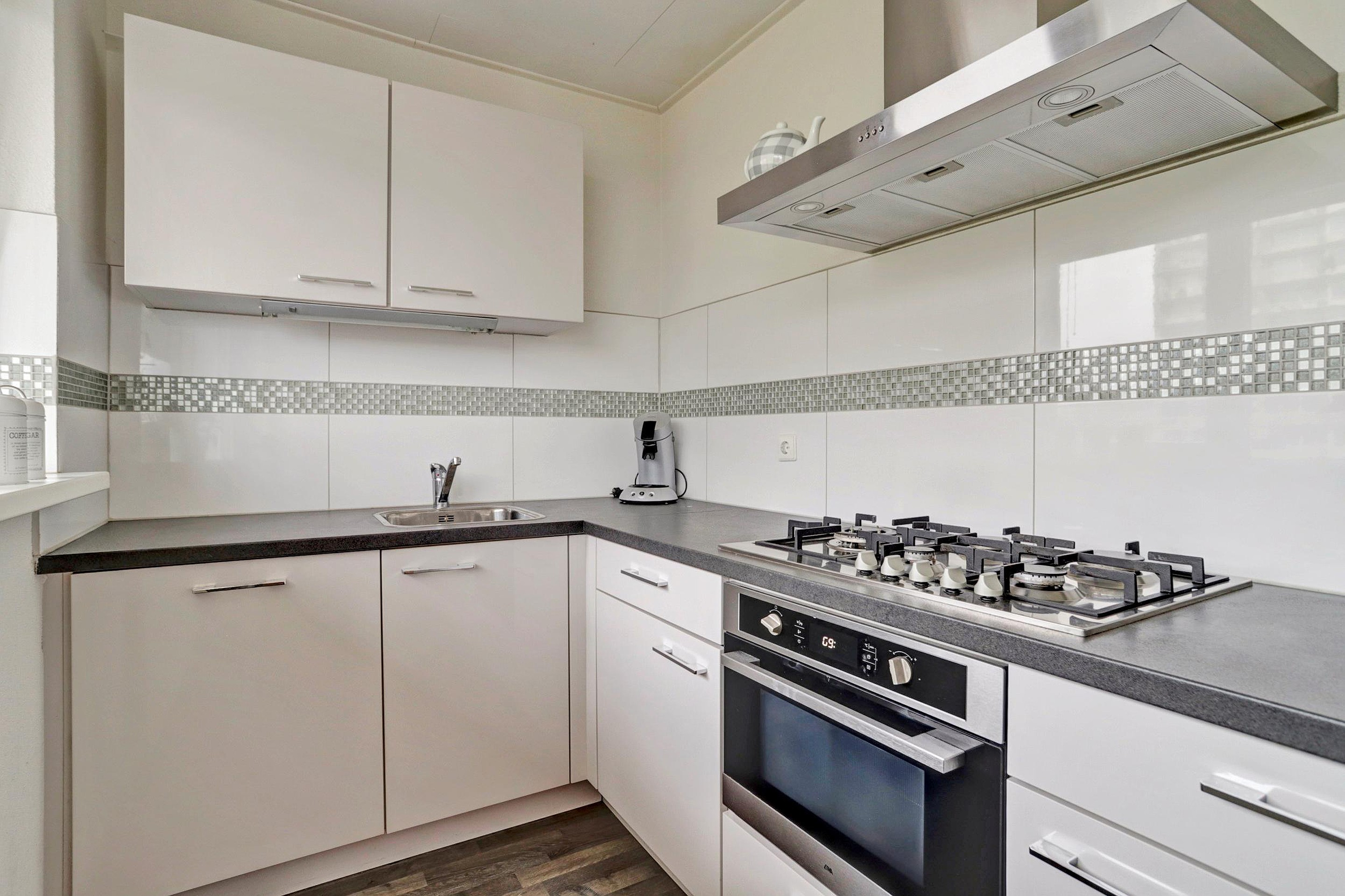 De keuken is aan de voorzijde van het appartement gelegen en is voorzien van een laminaatvloer, spachtelputz wanden, een plafond van agnes platen en houten kozijnen met enkel en dubbel glas. De keuken uit 2016 staat in een hoekopstelling en is voorzien van een koelvriescombi, combimagnetron, 5 pits gaskookplaat, afzuigkap, vaatwasser, enkele spoelbak met mengkraan en div boven en onderkasten.