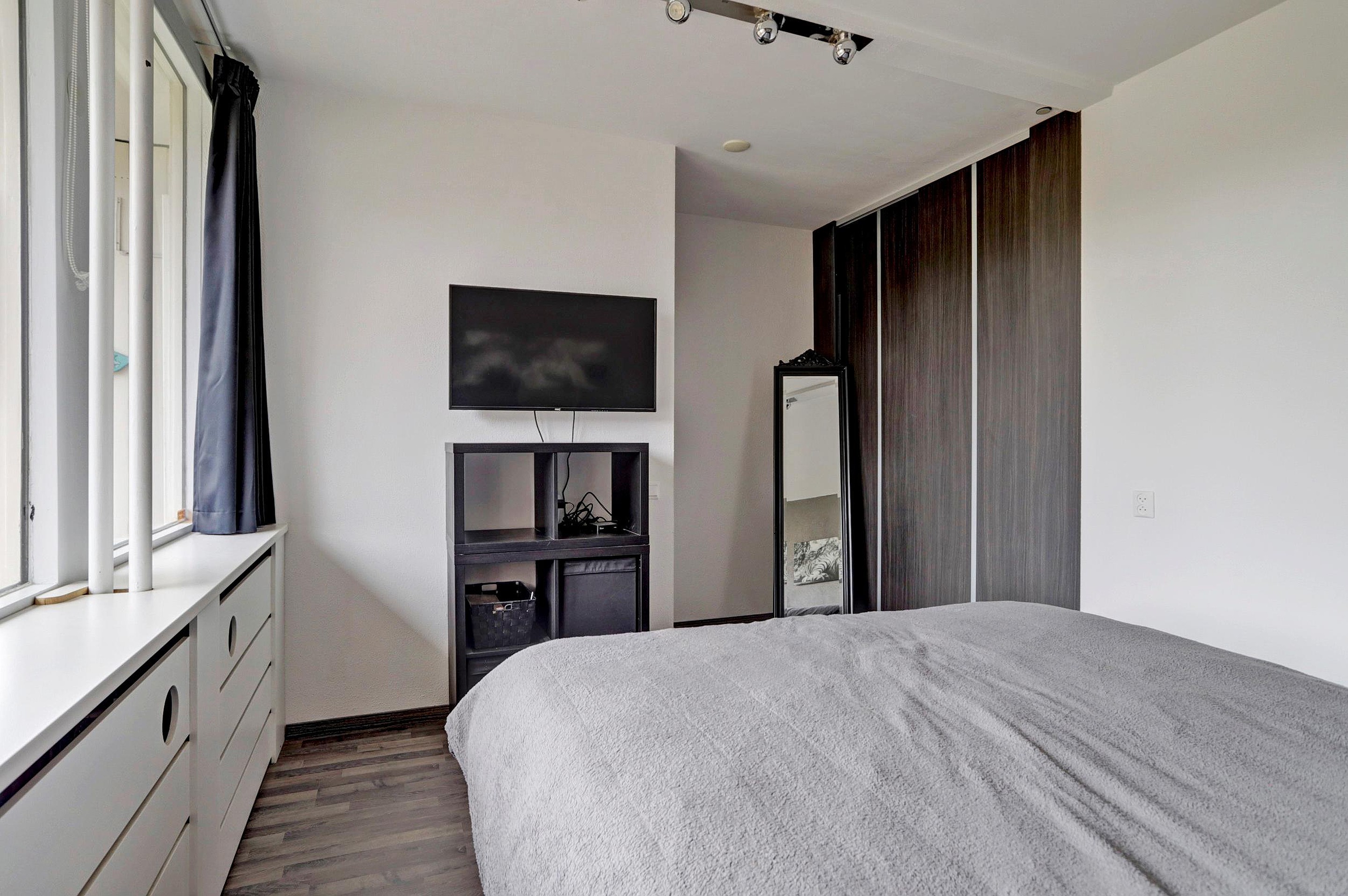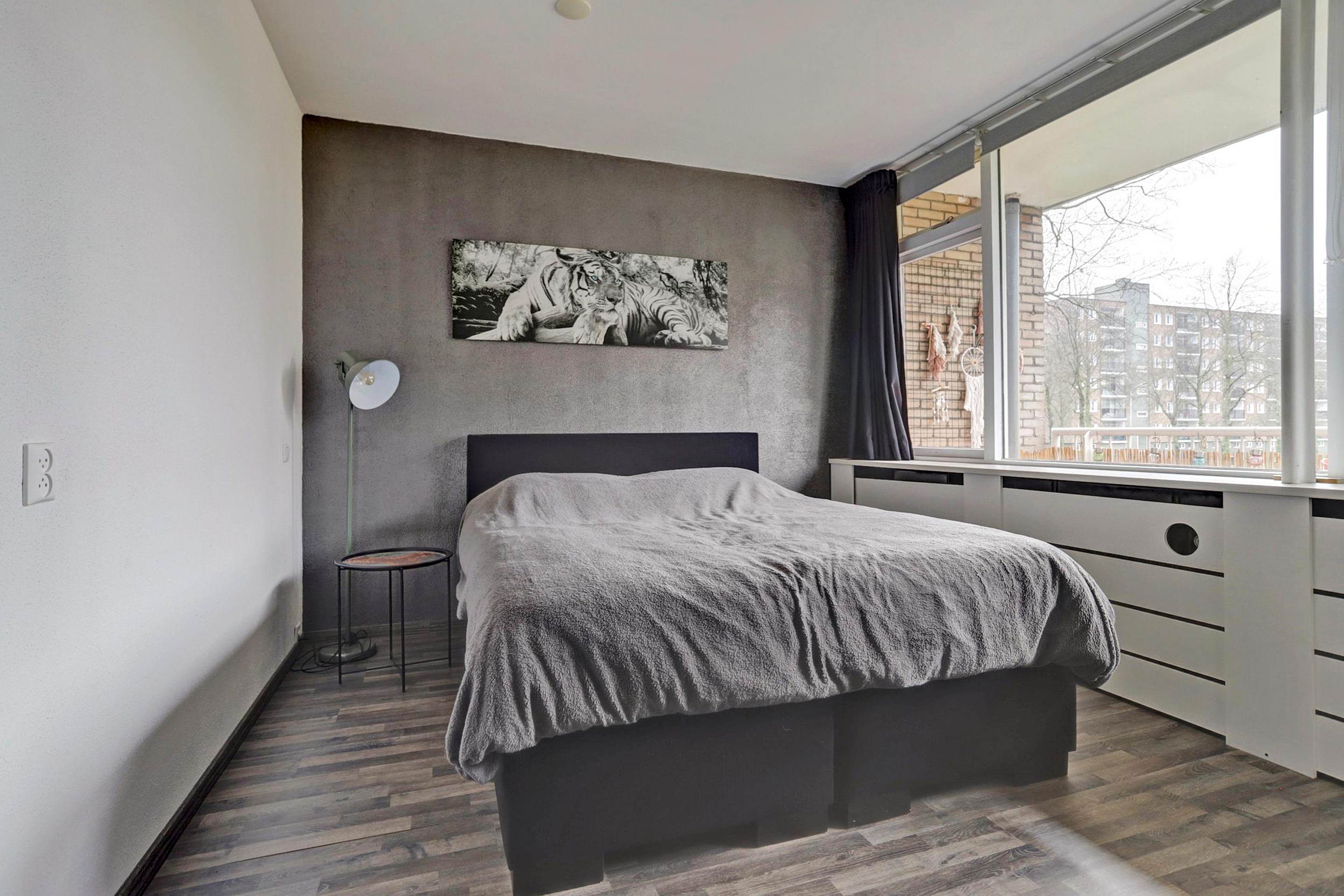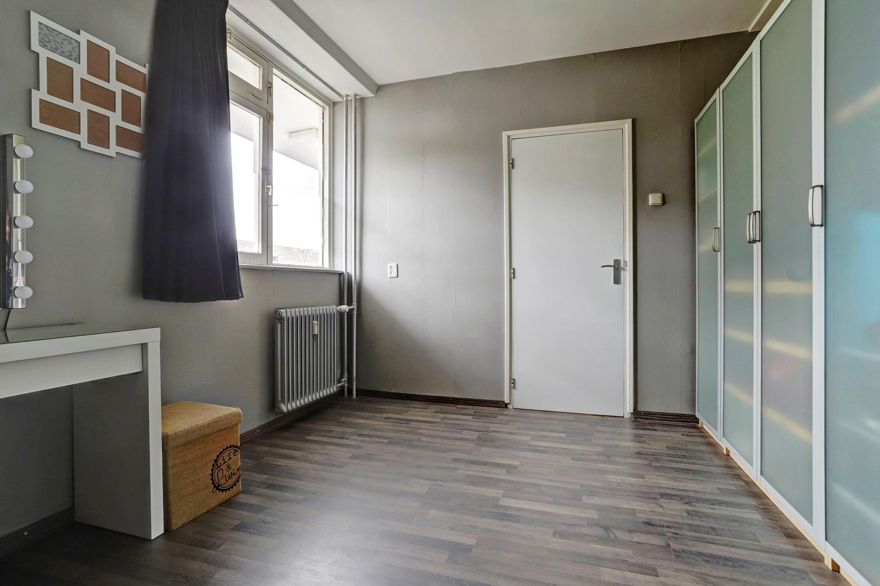 Vanuit de woonkamer heb je toegang tot de slaapkamer aan de achterzijde. Deze slaapkamer van ca. 13,4m2 is aan de achterzijde van het appartement gelegen en is voorzien van een laminaatvloer, gespoten en geverfde wanden, een vaste kledingkast met schuifdeur, radiator en een houten kozijn met enkel en dubbel glas.