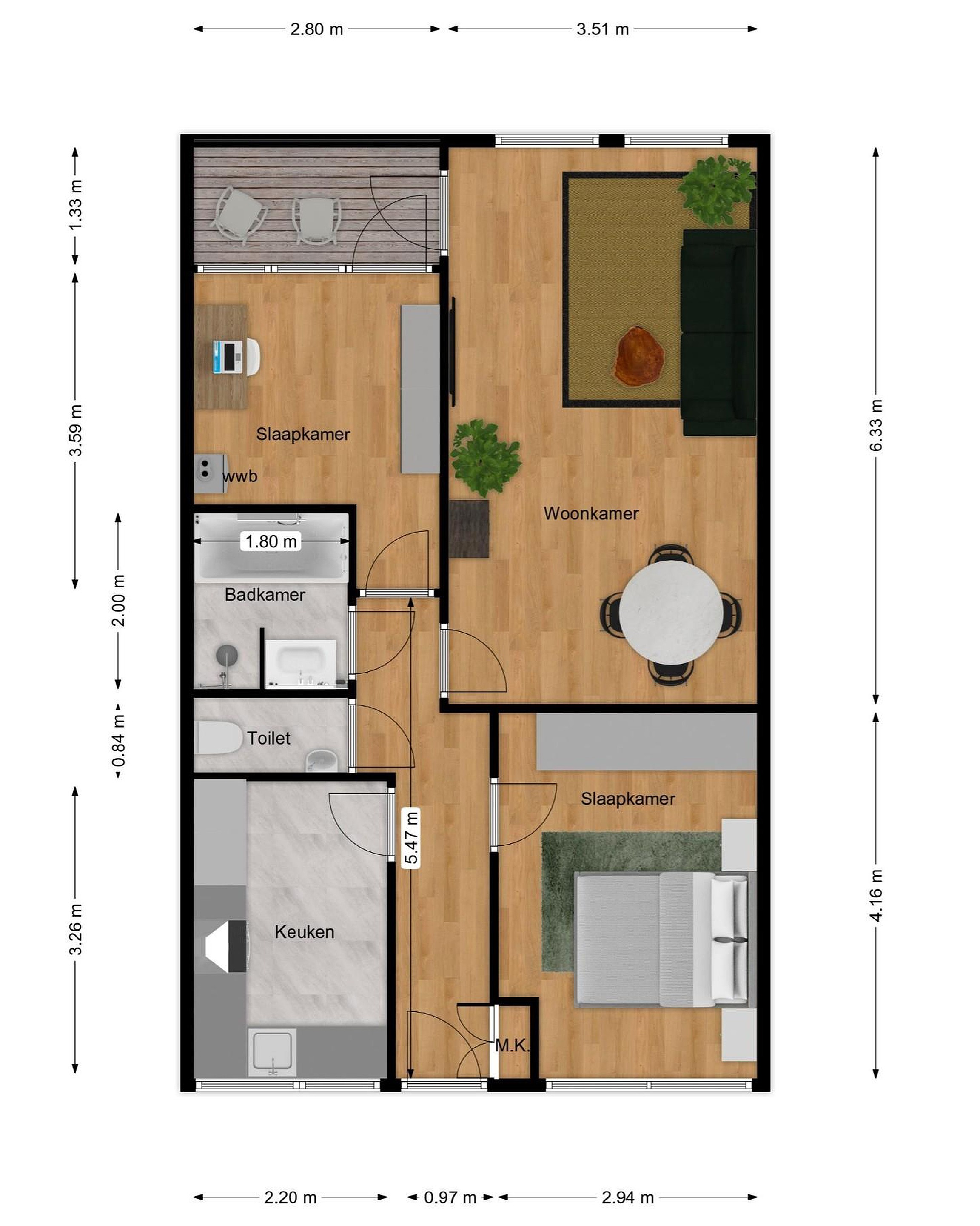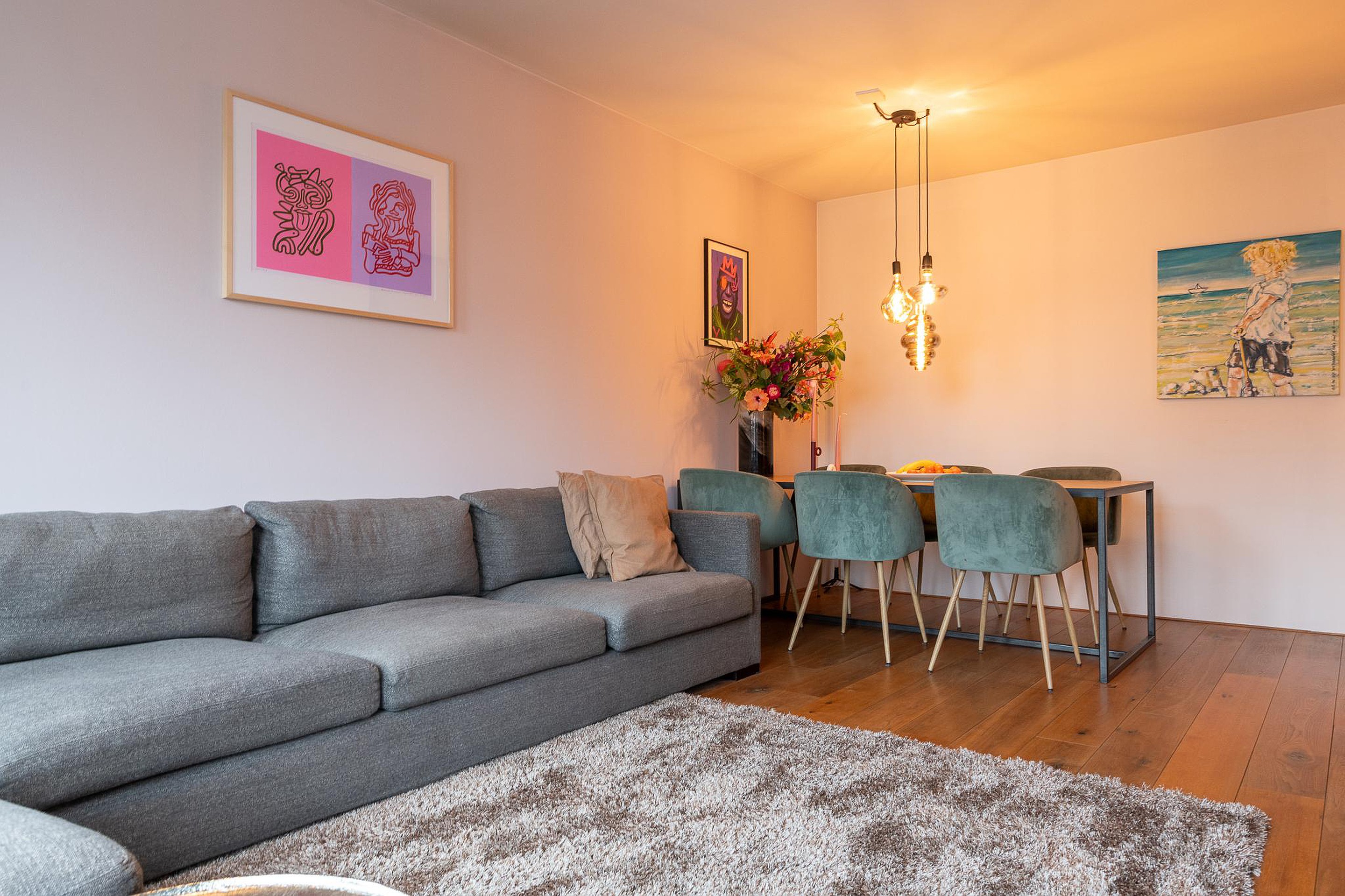 De ruime woonkamer (ca. 3.51 m x 6.33 m) voorzien van een houten vloer, grote raampartijen welke zorgen voor veel licht, middels loopdeur toegang tot het balkon;