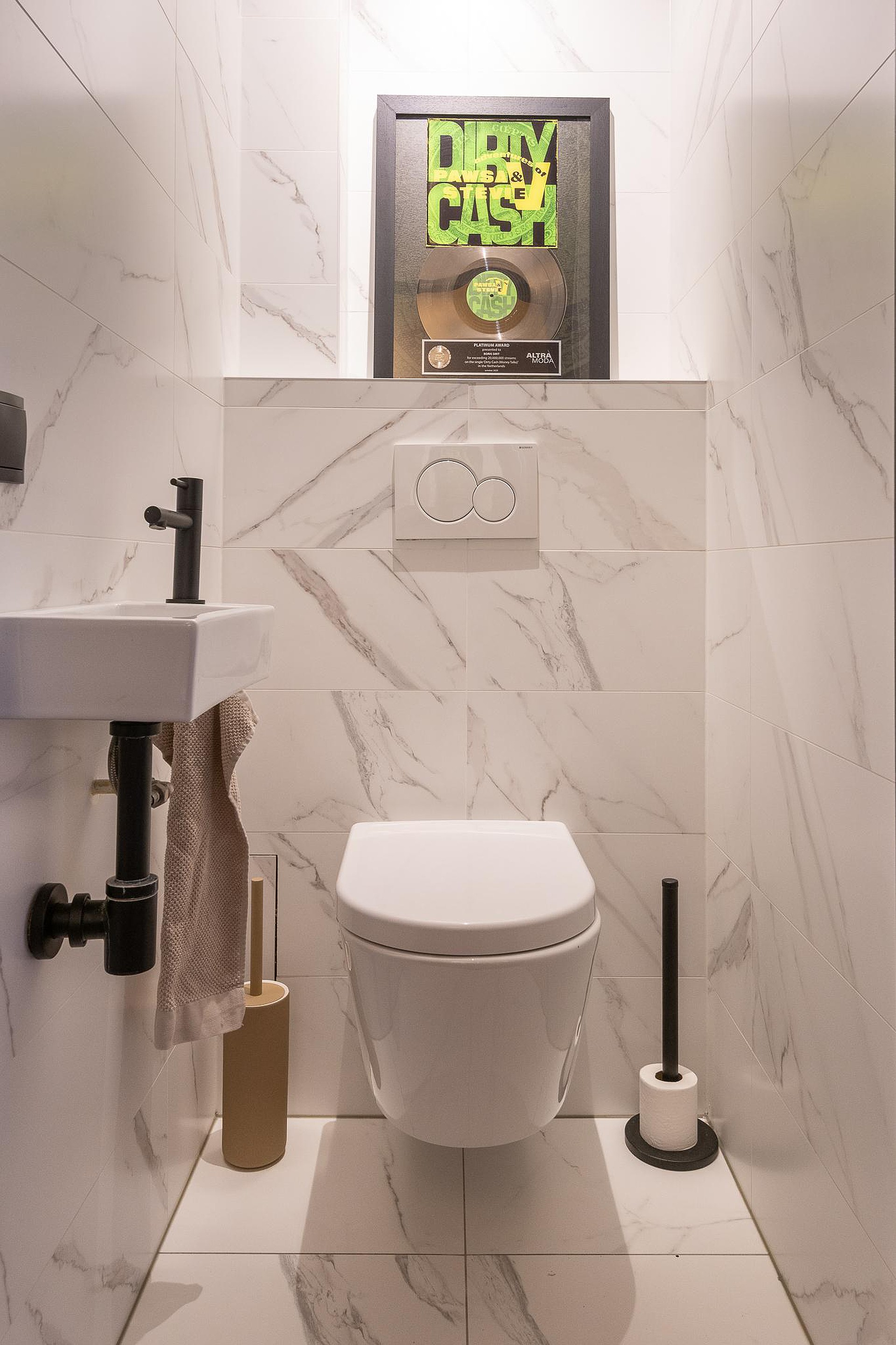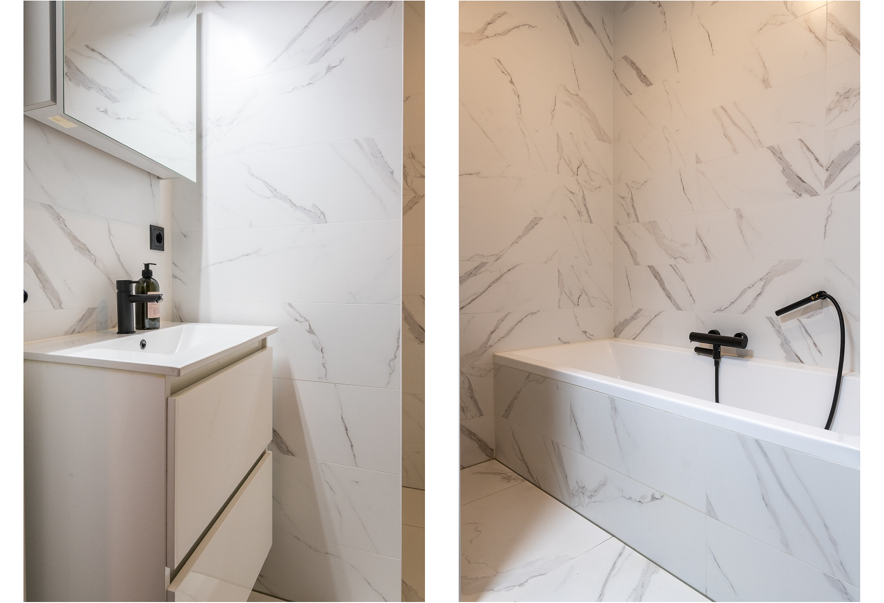 De volledig betegelde badkamer beschikt over een inloopdouche, ligbad en wastafelmeubel;