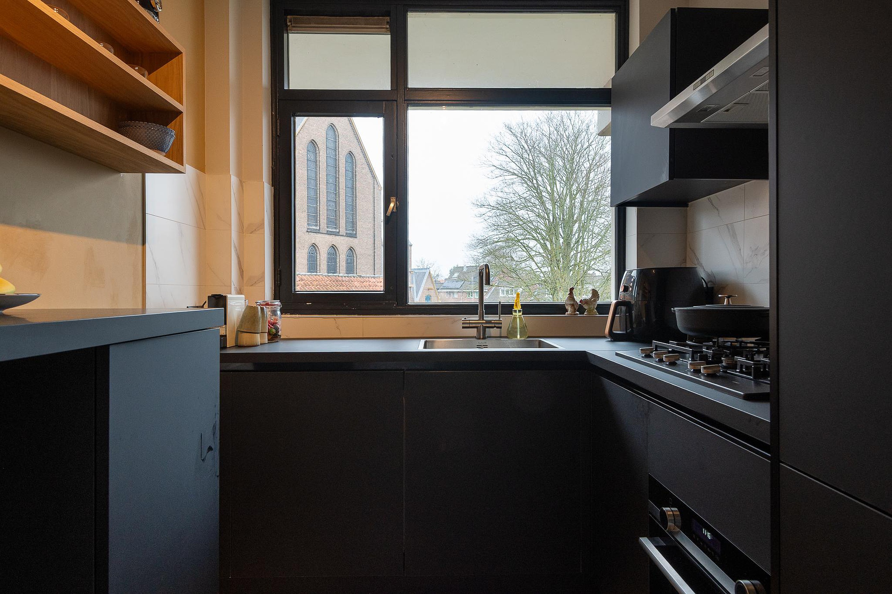 Keuken (ca. 2.20 m x 3.26 m) in een hoekopstelling met veel werkruimte en diverse inbouwapparatuur waaronder een koelkast, vaatwasser, afzuiginstallatie en een 5-pits gasfornuis en oven. Er is voldoende opbergruimte aanwezig dankzij onder- en bovenkasten. In de keuken bevindt zich tevens de opstelling van de wasmachine;