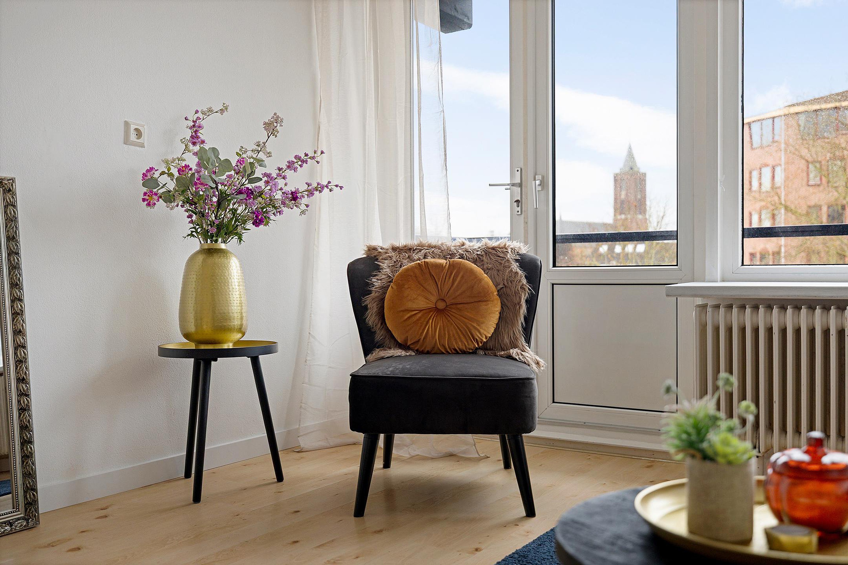 De woonkamer aan de achterzijde van de woning is royaal en licht en biedt toegang tot het heerlijke balkon op het zuidwesten.
