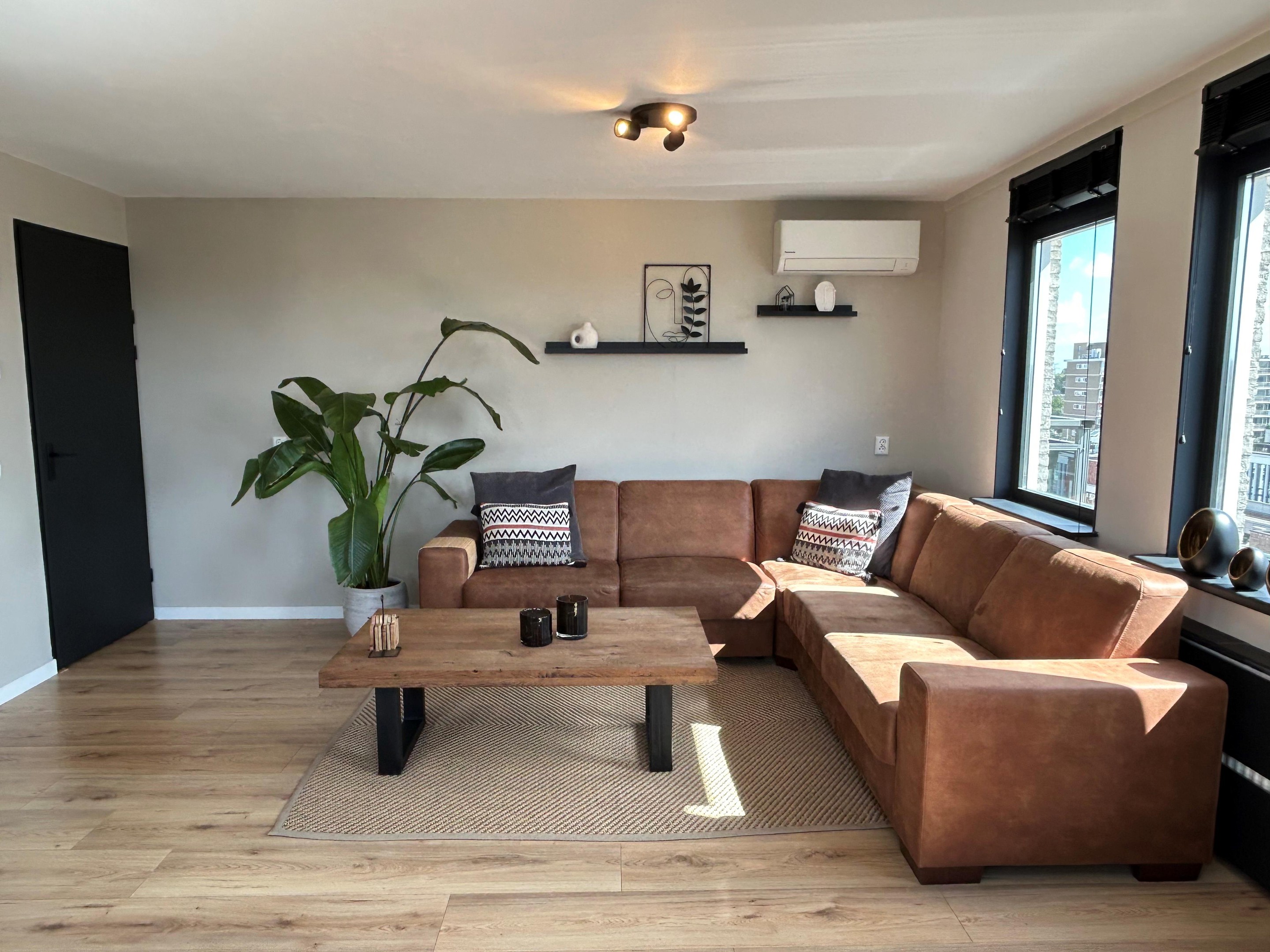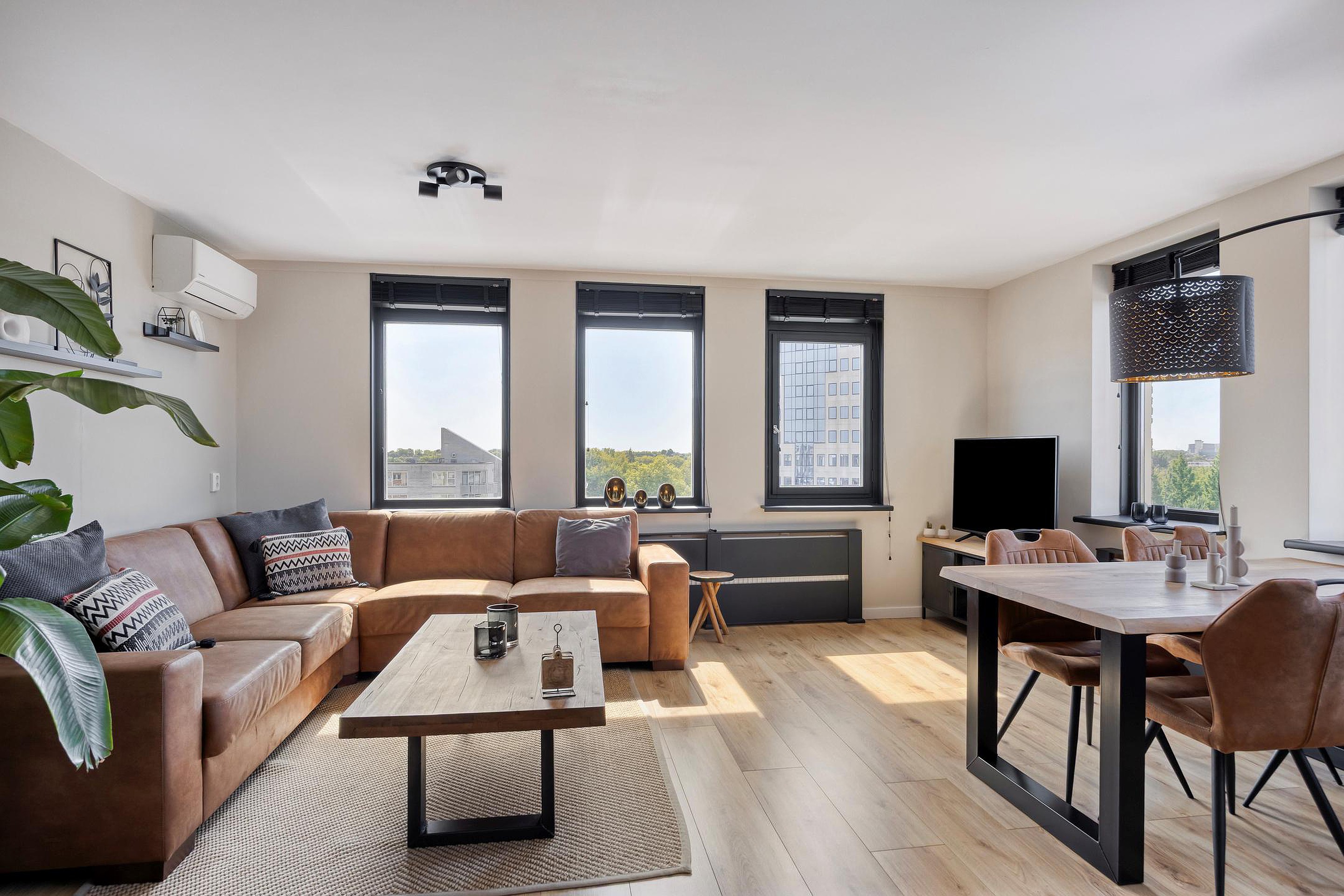 Woonkamer, een ruime en lichte woonkamer, voorzien van ramen aan twee zijden (extra daglicht!) en airconditioning. Vanuit de woonkamer is er toegang tot de open keuken.