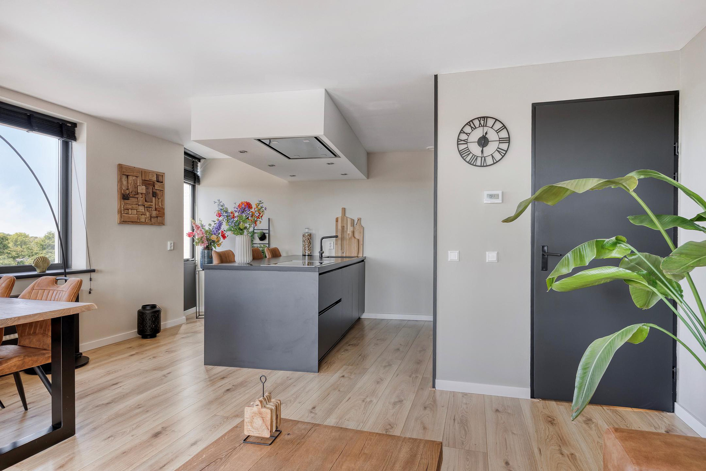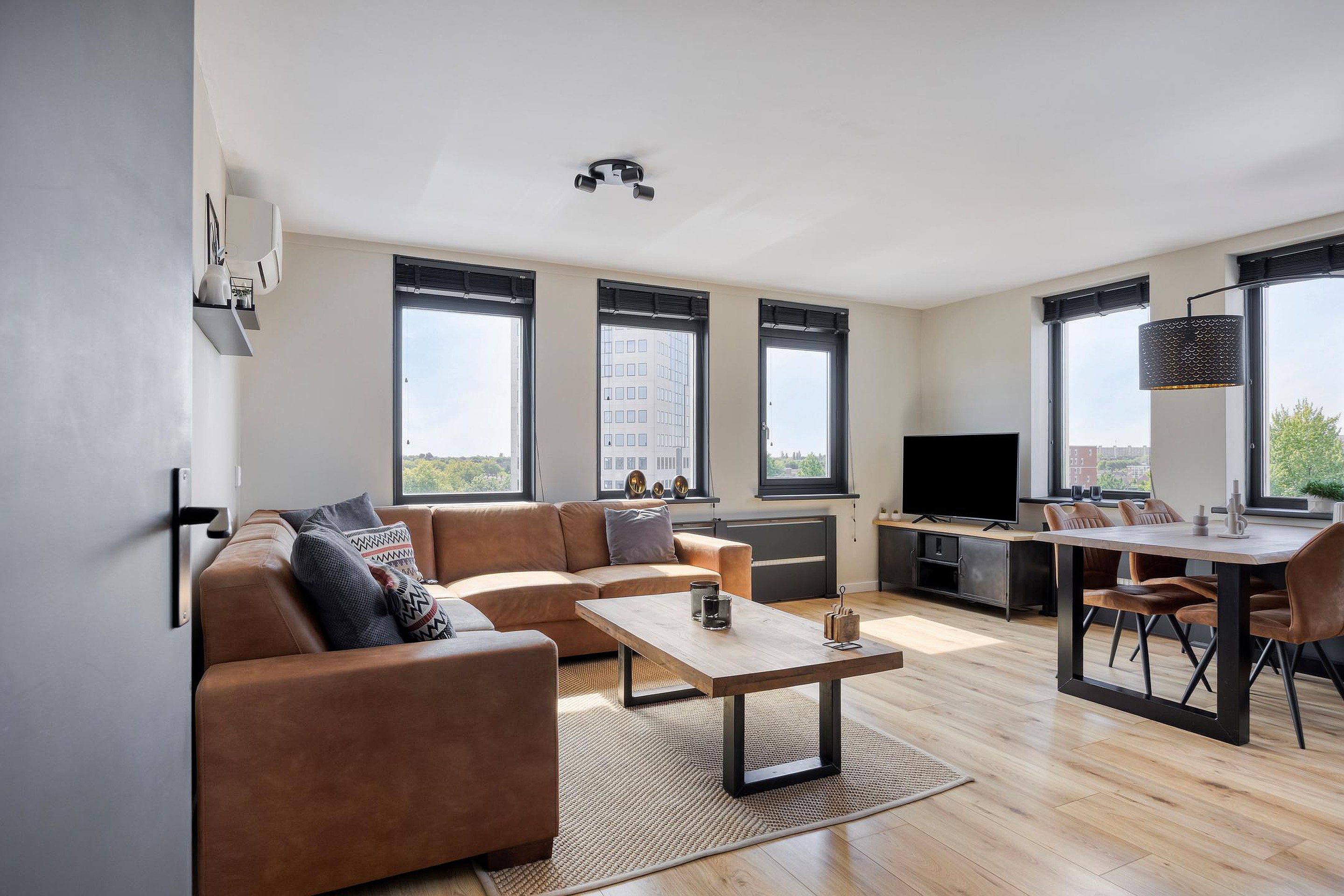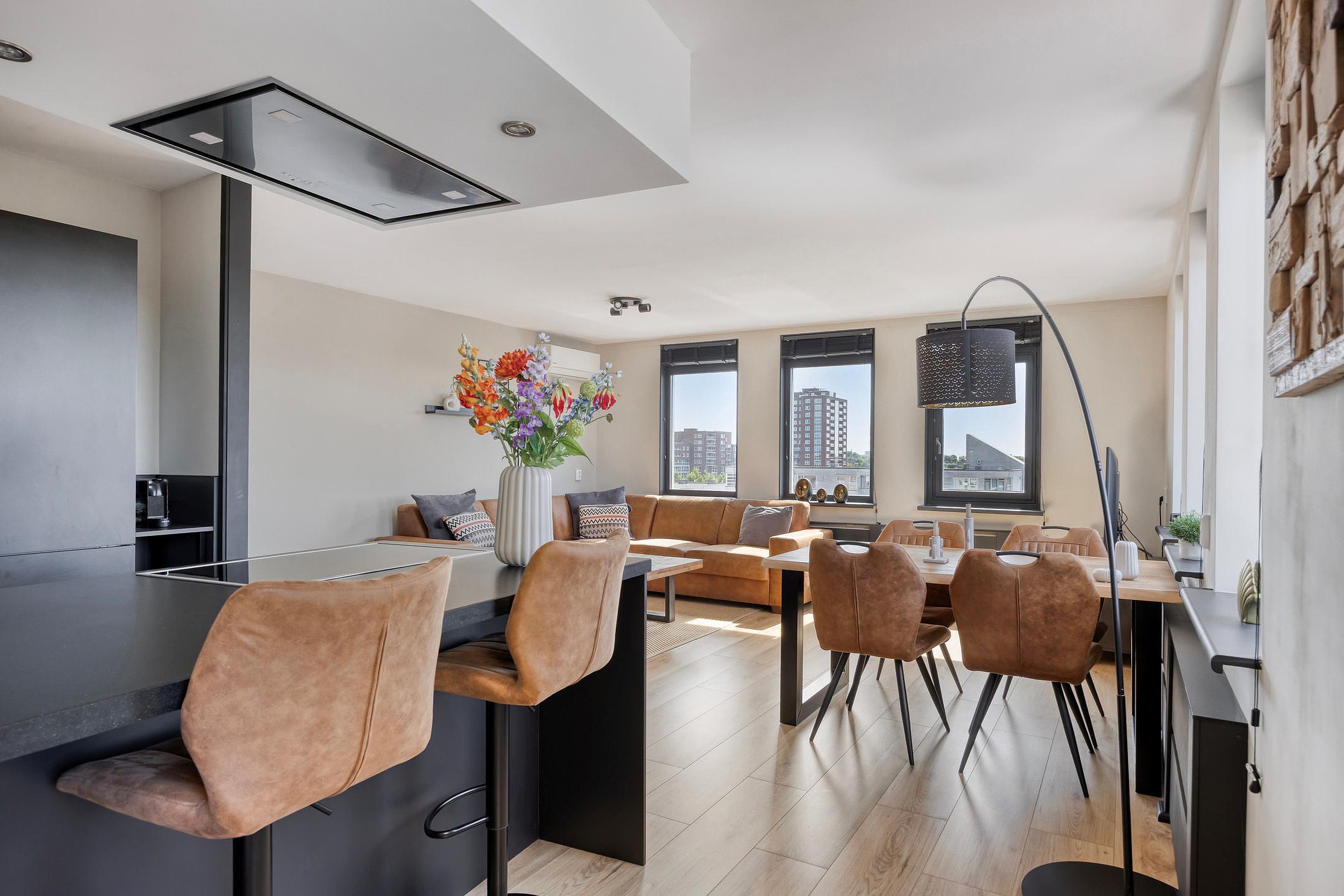 - Woonkamer met open keuken met aan twee kanten ramen (uitzicht)