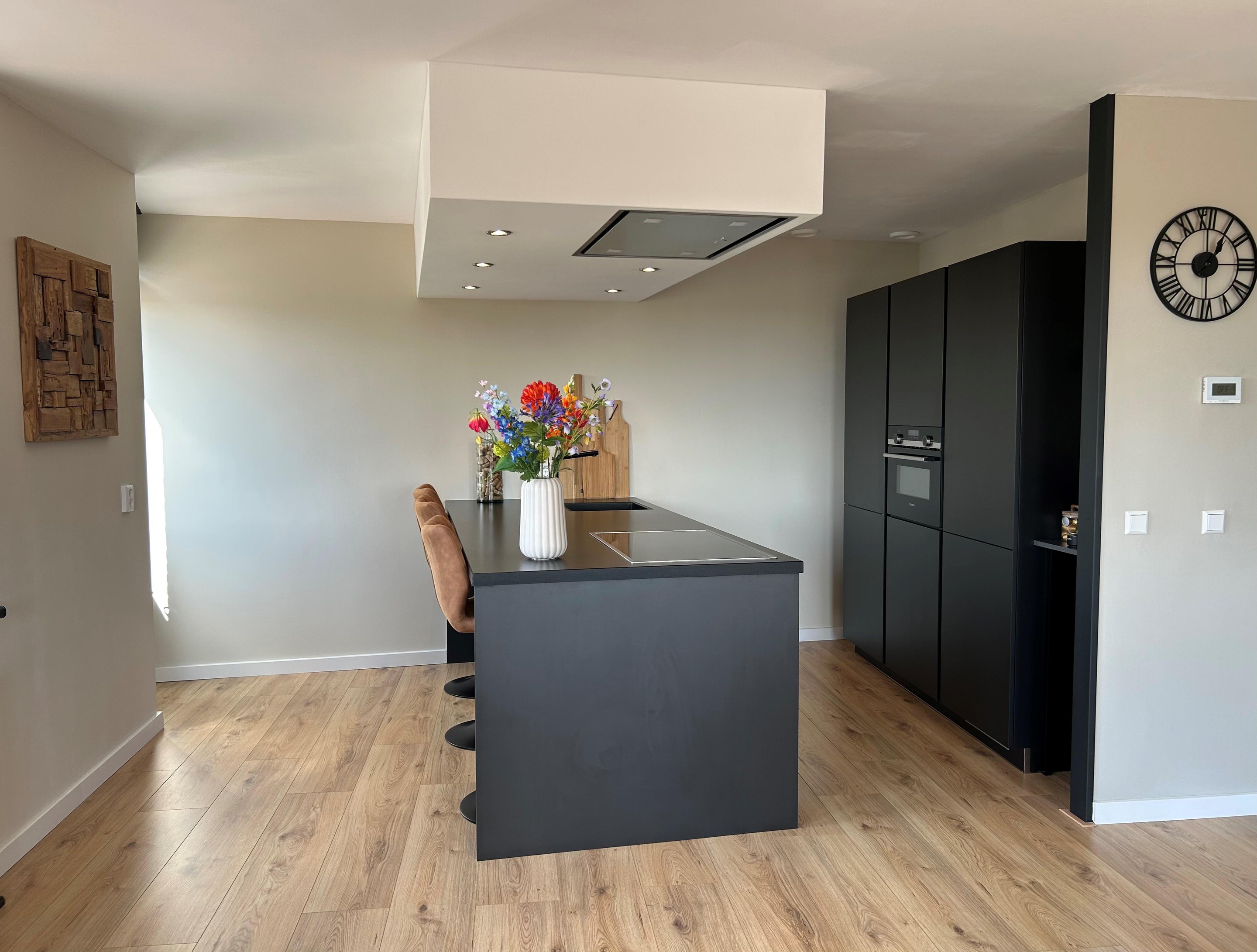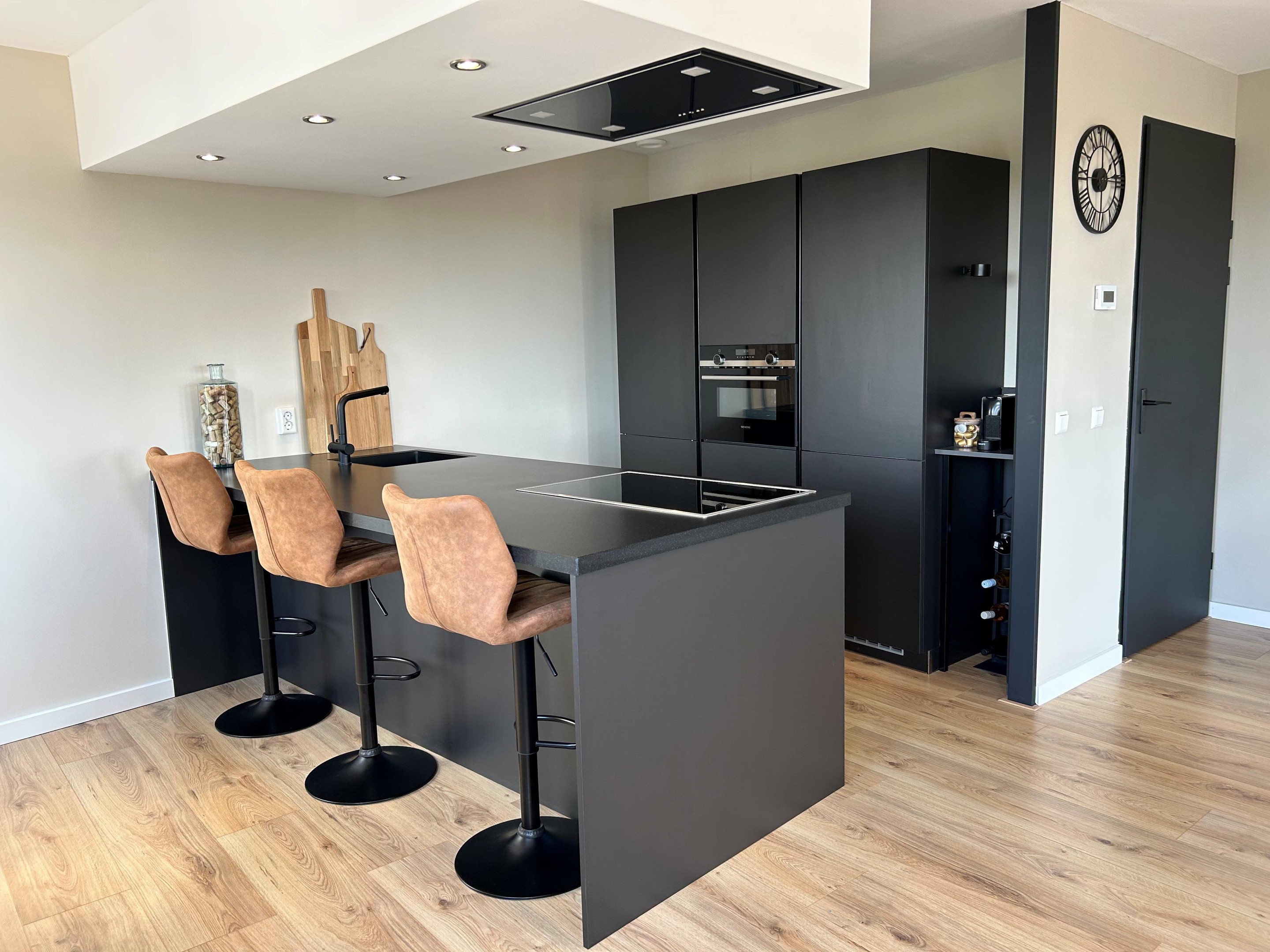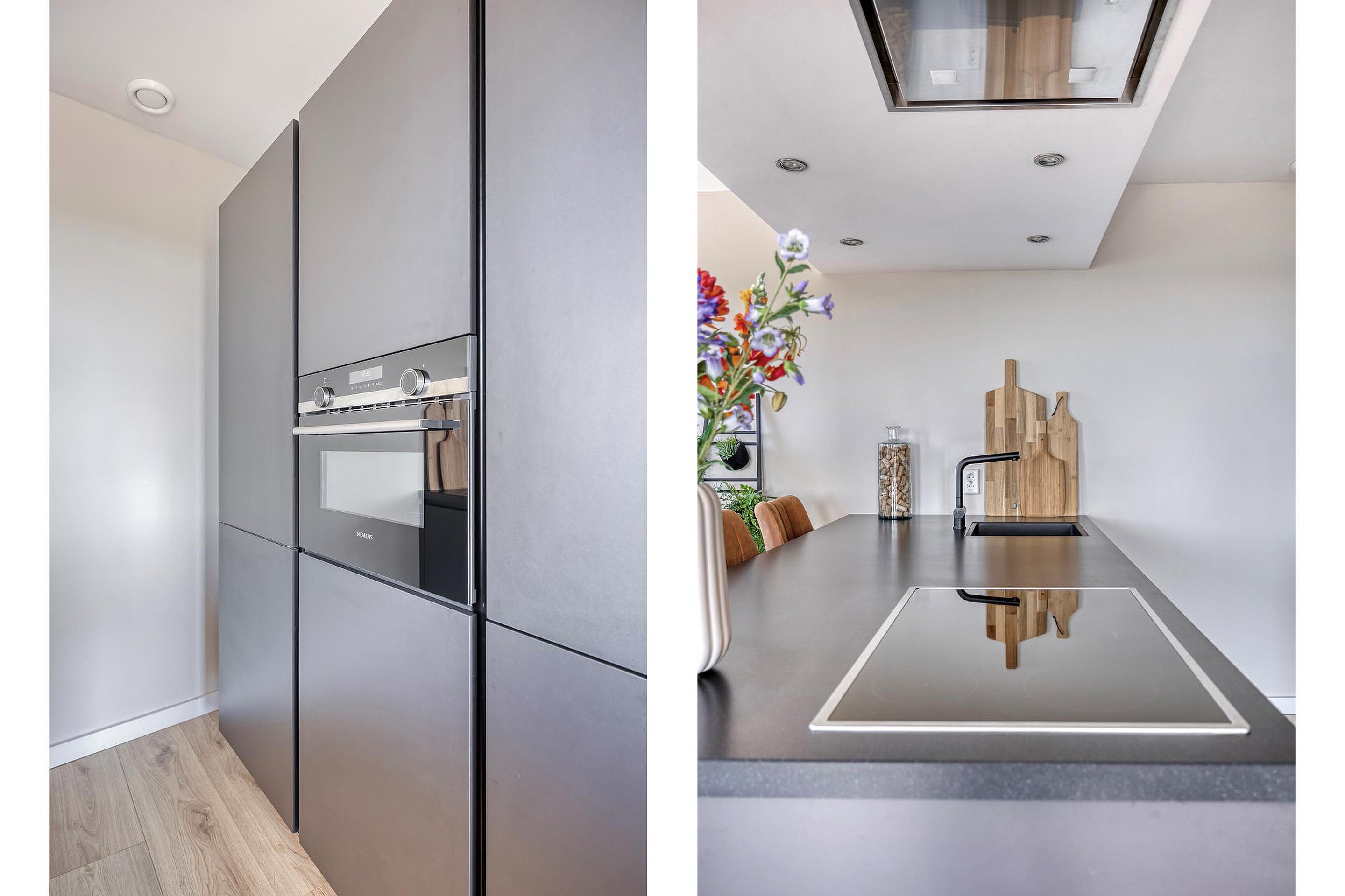 Keuken, een moderne keuken, voorzien van een schiereiland met Siemens apparatuur: een inductie kookplaat (3 pits + flexzone), een in het plafond geïntegreerde afzuigkap, vaatwasser en een granieten (composiet) aanrechtblad. Tegen de muur is een riante kastenwand geplaatst, voorzien van een koel-vriescombinatie, combimagnetron en een hoge bergkast.