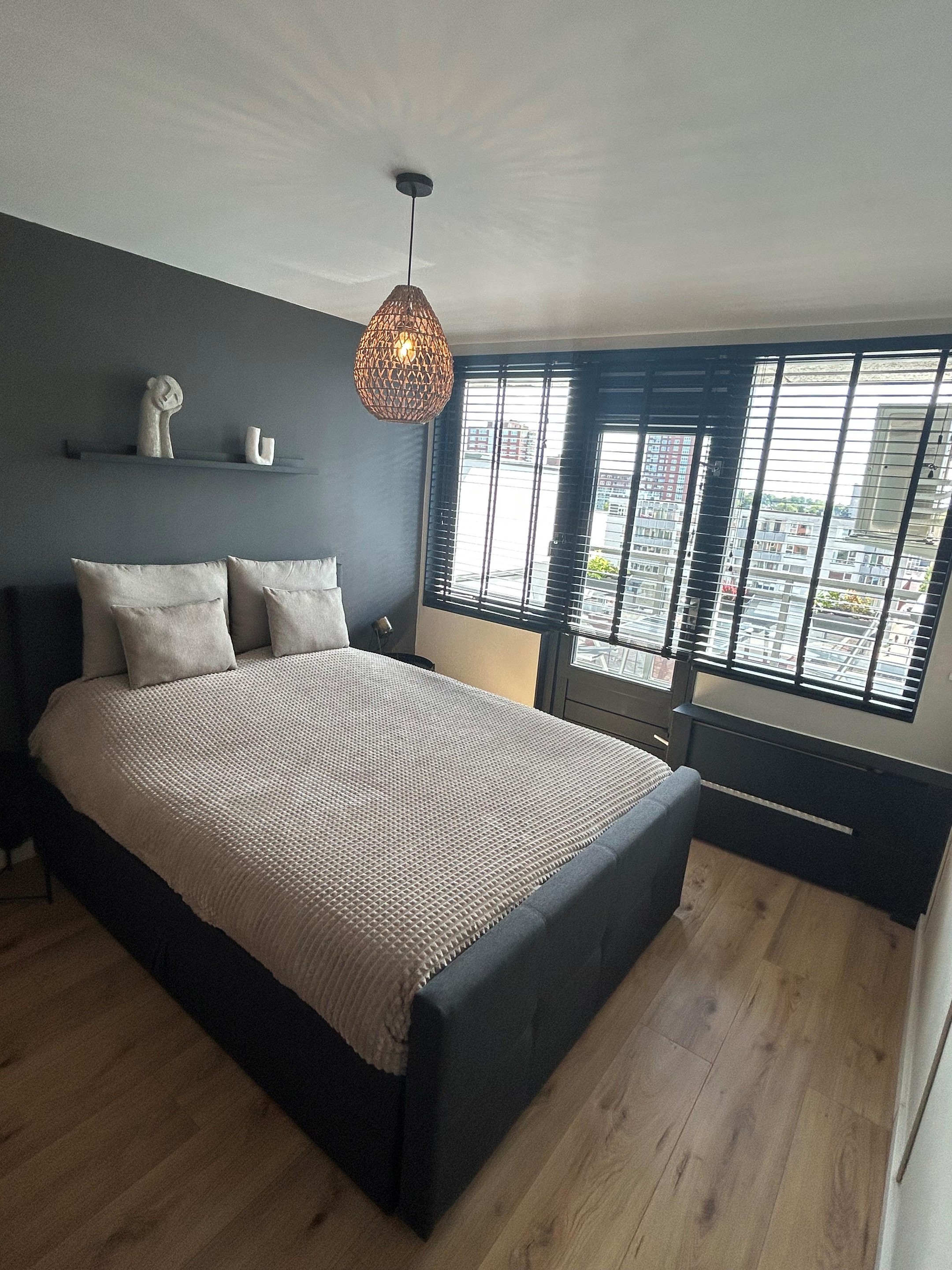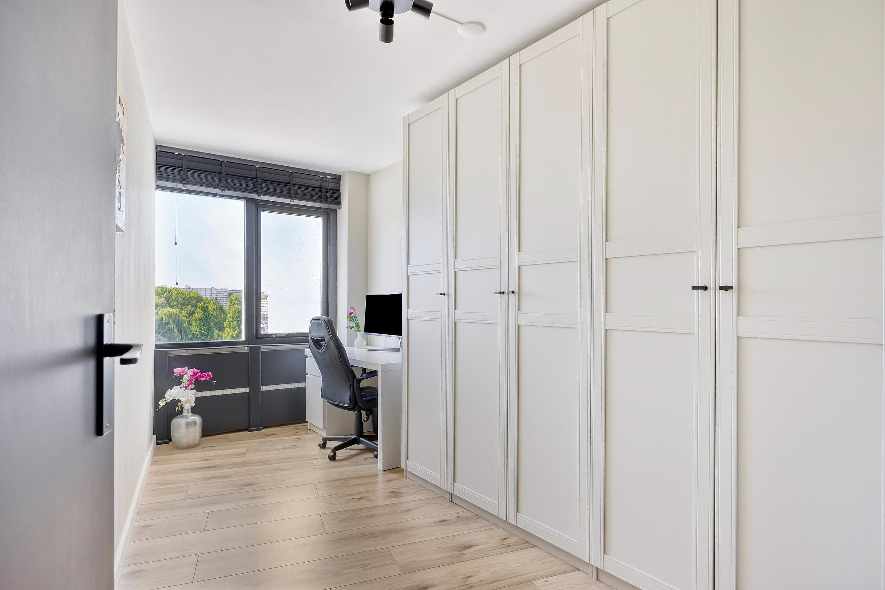 Slaapkamer 2, voorzien van een heel leuk uitzicht richting de skyline van Rotterdam.